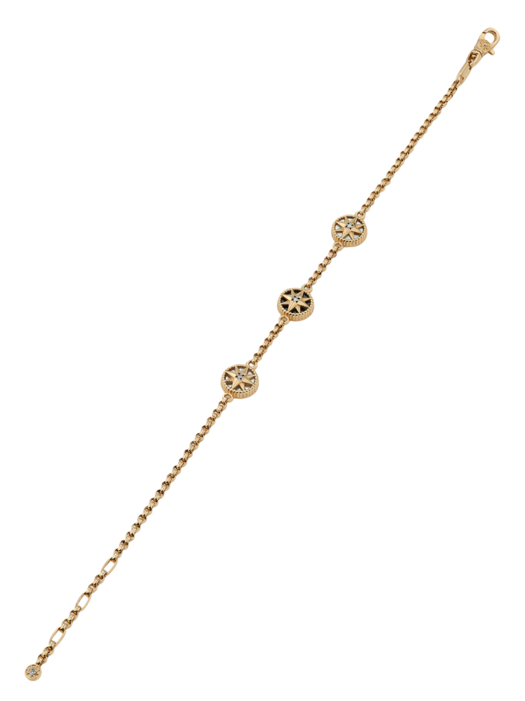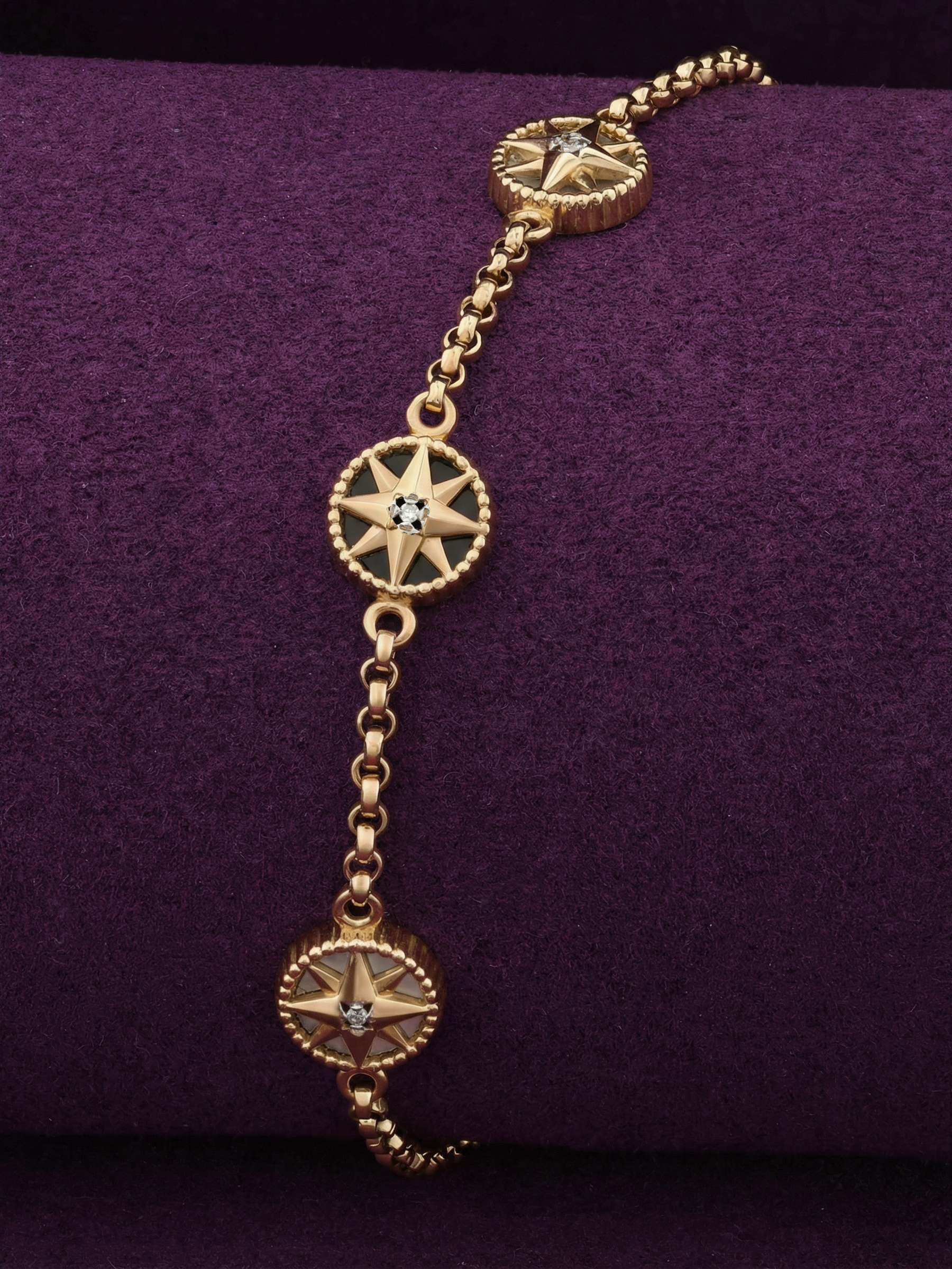 Особую художественную ценность браслету придает изысканный дизайн, вдохновленный образом звезды. В центре композиции расположены четыре вставки круглой формы, которые чередуются и создают динамичный визуальный ритм. Вставки выполнены из натурального оникса глубокого черного цвета и нежного перламутра с характерным переливом. Каждая звезда украшена драгоценным бриллиантом, который добавляет изделию благородного блеска и яркости.