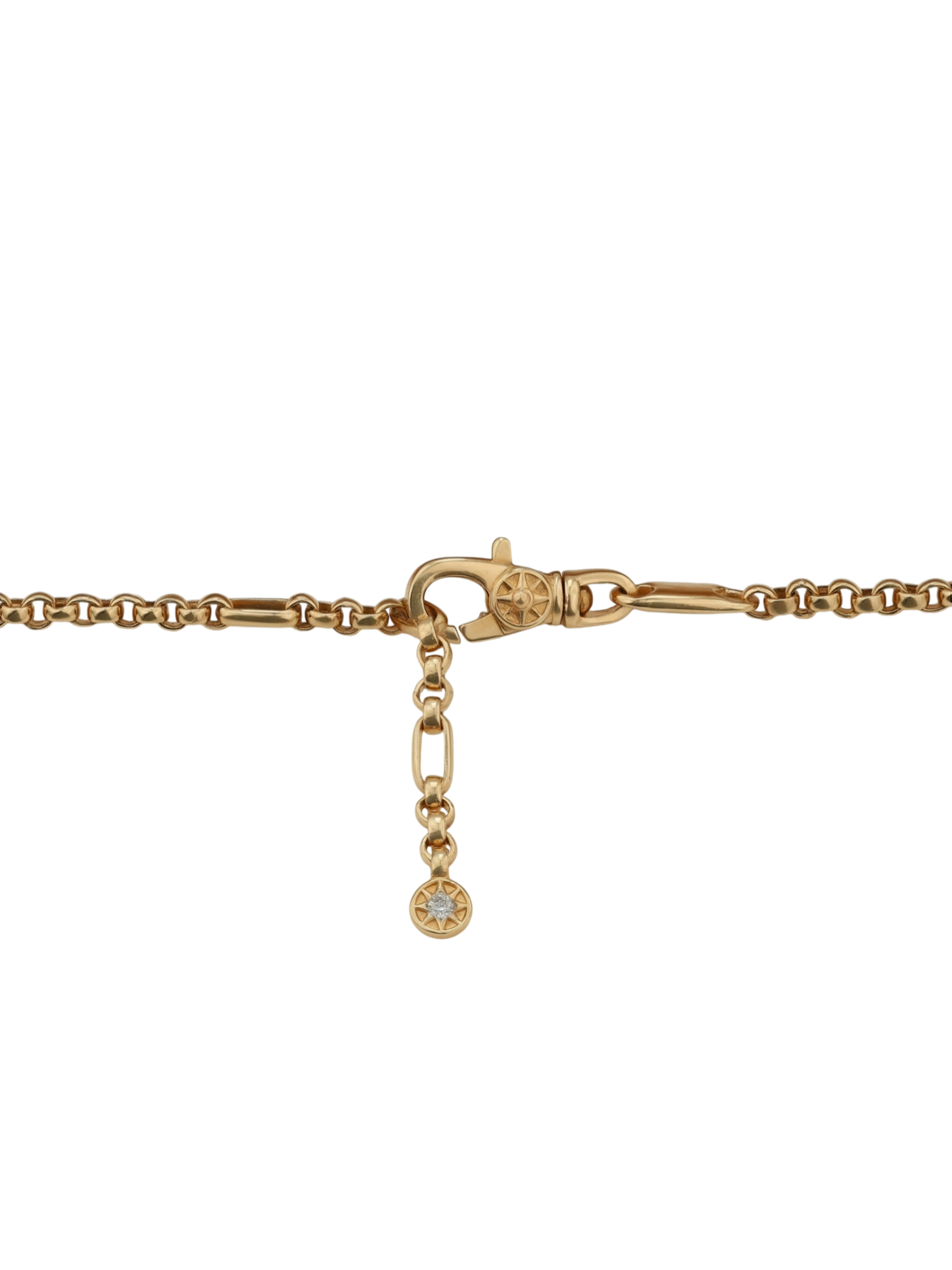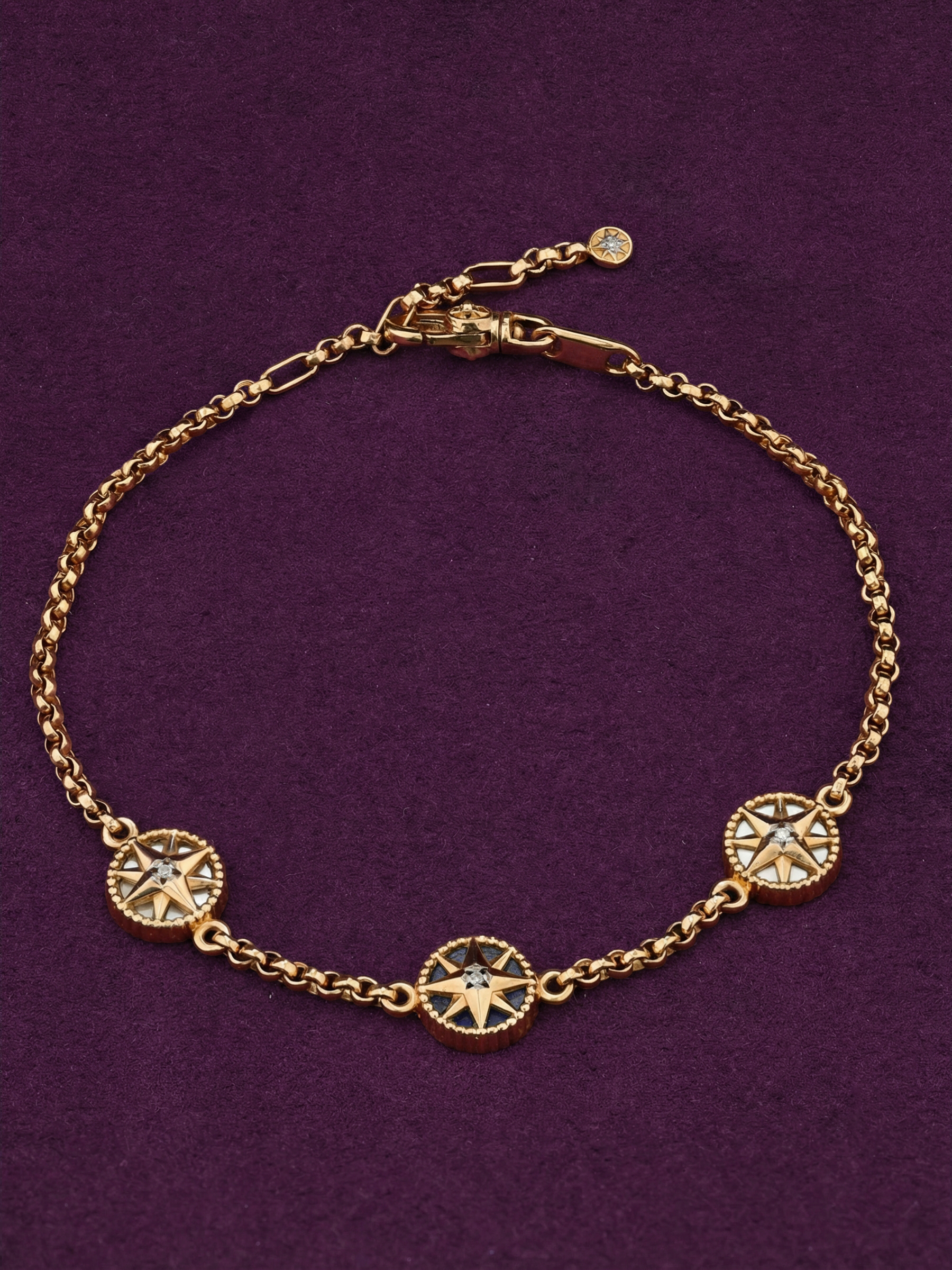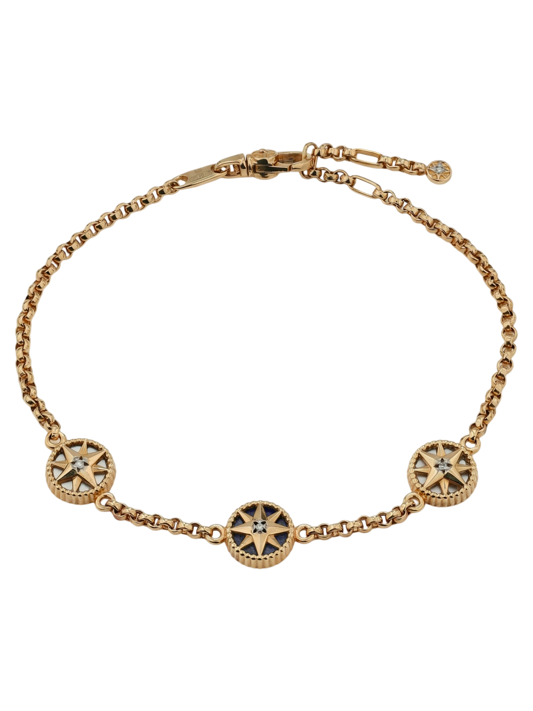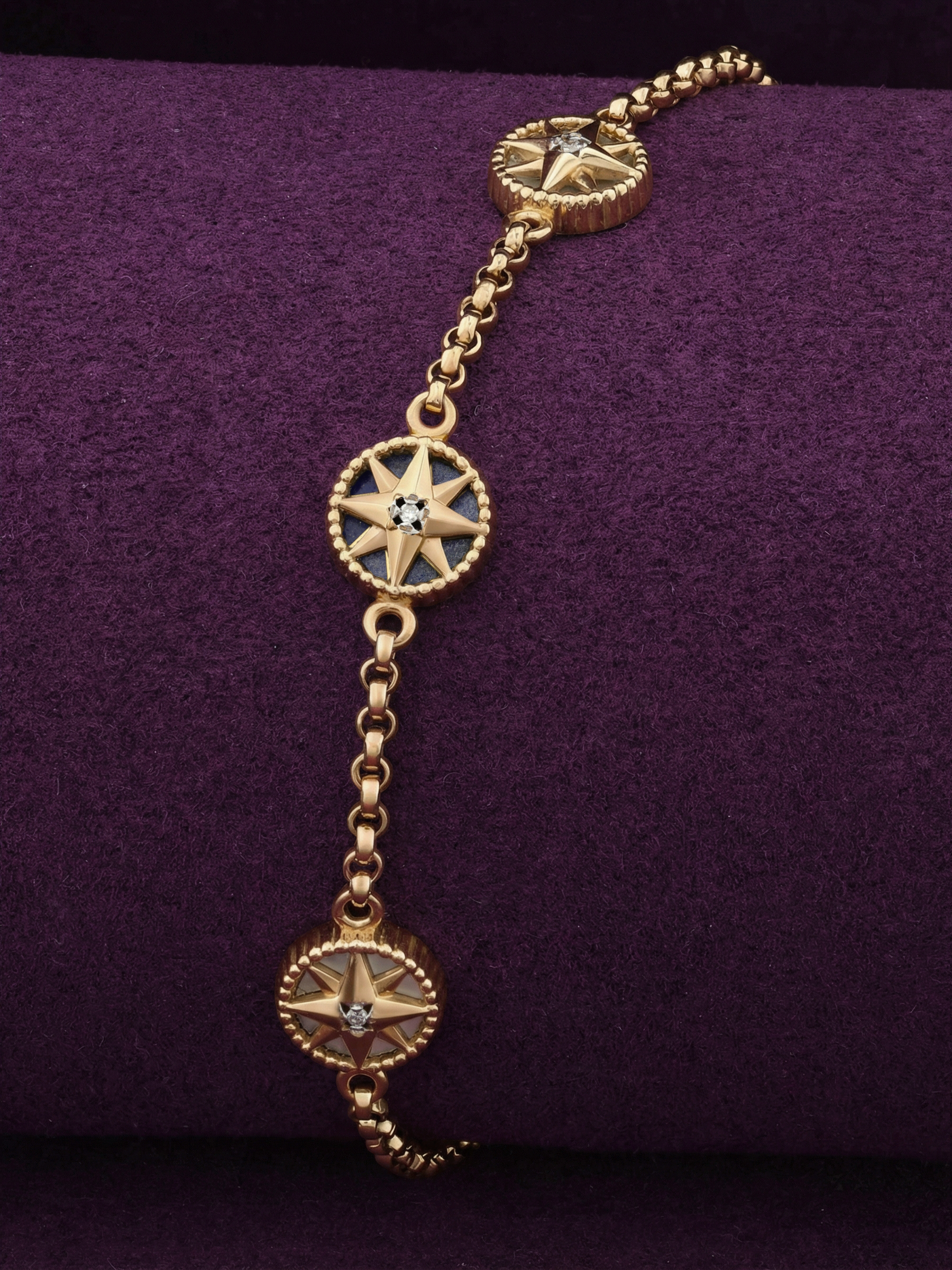 Центральными акцентами композиции выступают четыре круглые вставки, сочетающие в себе природную глубину синего лазурита и нежное мерцание перламутра. В сердце каждой звезды расположен сверкающий бриллиант, чьи грани создают безупречную игру света. Сочетание классических материалов и символичного дизайна делает этот браслет универсальным аксессуаром, который одинаково гармонично смотрится как на женском, так и на мужском запястье.