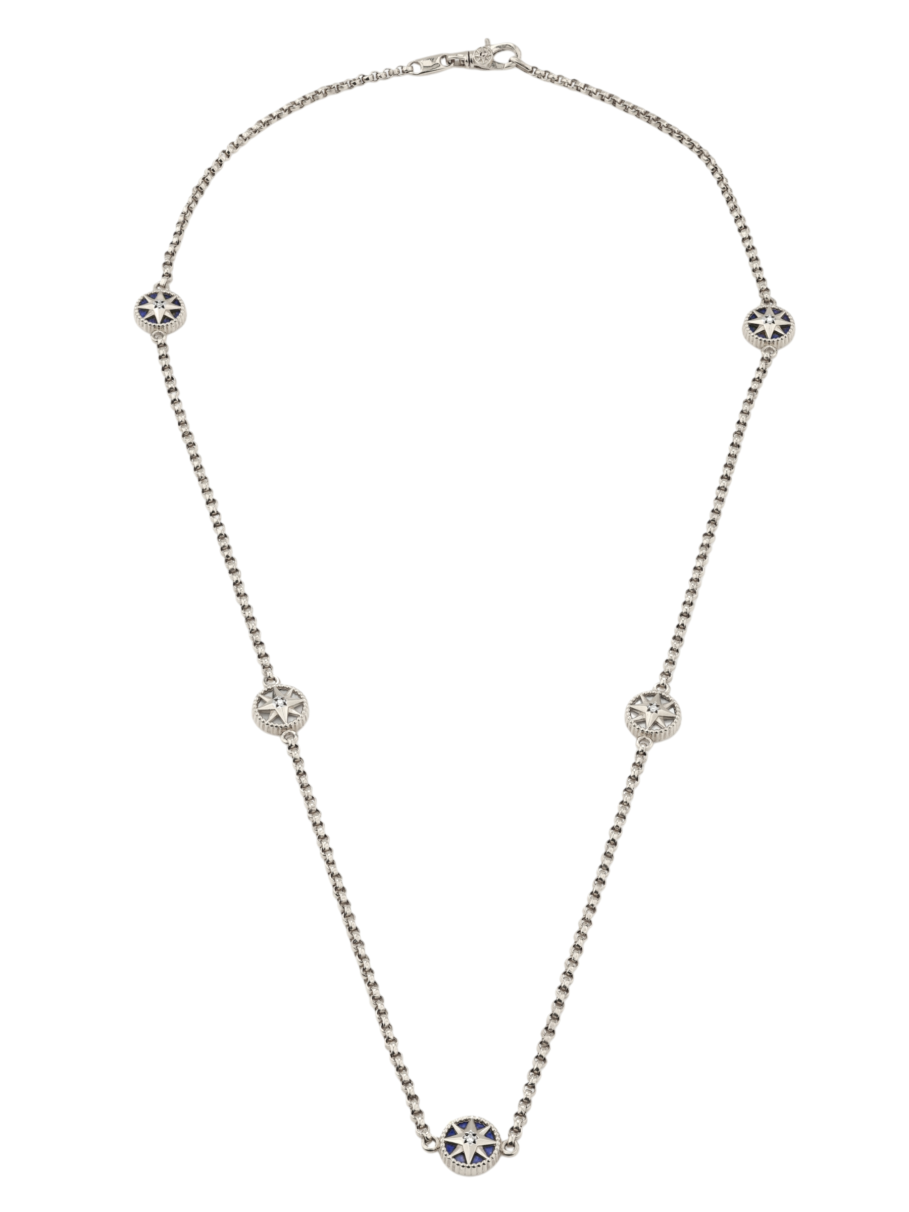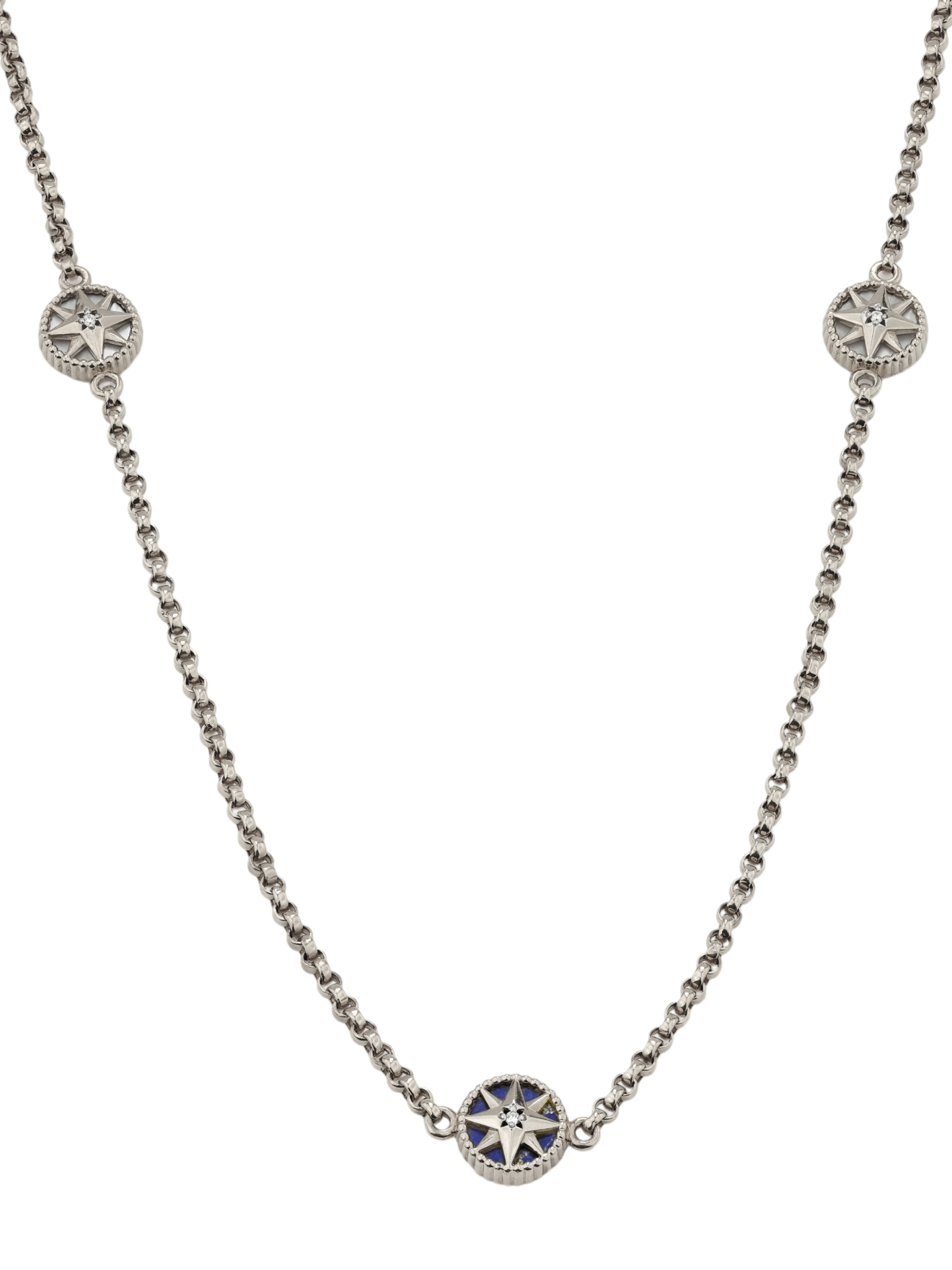 Элегантное колье из белого золота 585 пробы из коллекции De Luxe — Звёзды — Бриллианты станет безупречным акцентом вашего образа. Дизайн украшения, выполненный в тематике звезд, притягивает взгляд и подчеркивает утонченность стиля. В центре композиции расположены круглые декоративные элементы, гармонично сочетающие в себе благородный блеск металла с глубоким синим цветом лазурита и нежным сиянием перламутра.