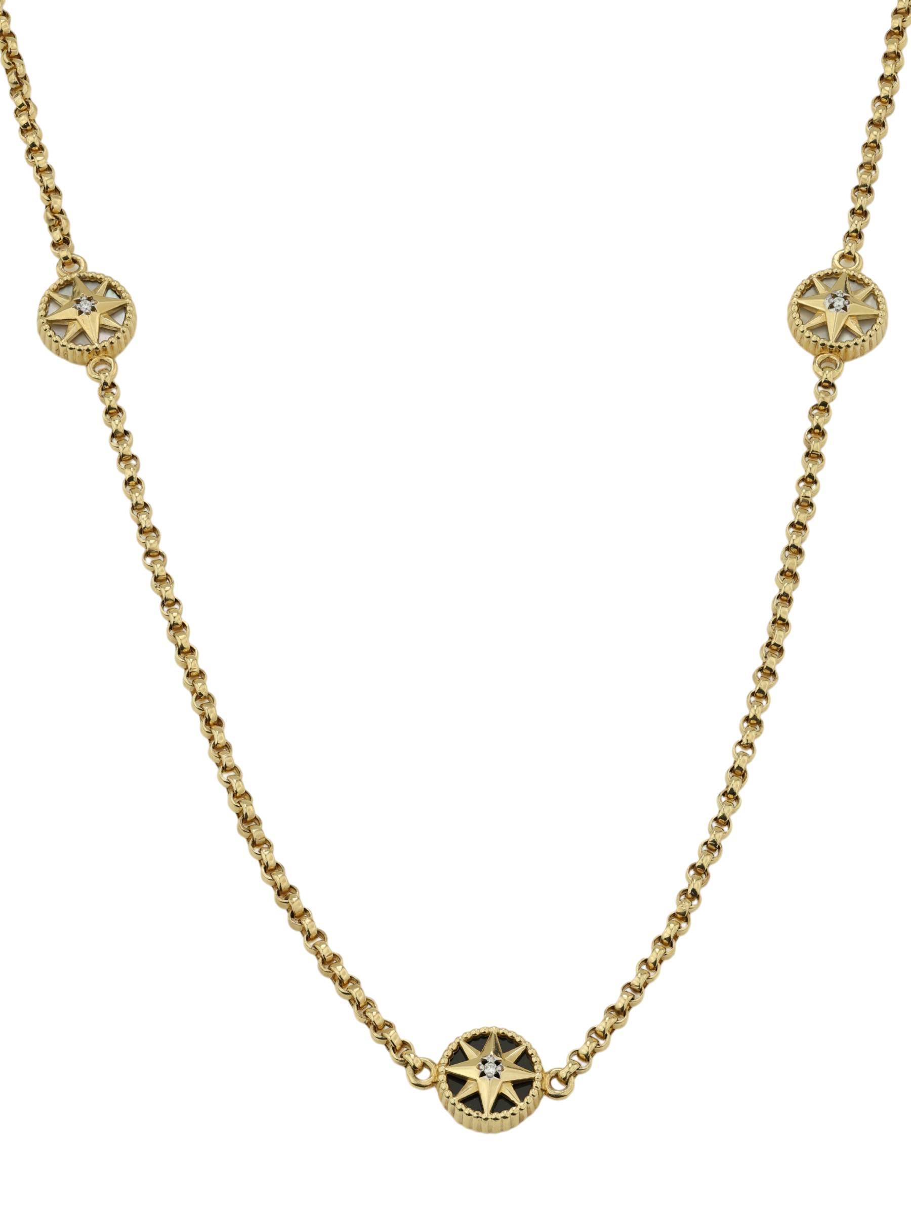 Колье из лимонного золота 585 пробы из коллекции De Luxe — Звёзды — Бриллианты станет изысканным акцентом вашего образа. Дизайн украшения, выполненный в тематике звезд, притягивает взгляд своей элегантностью и утонченным сочетанием благородных материалов. Центром композиции стали вставки круглой формы, украшенные контрастным перламутром и глубоким черным ониксом. В общей сложности изделие декорировано 24 вставками, которые гармонично дополнены сияющими бриллиантами. Белый, перламутровый и черный цвета вставок создают выразительный визуальный эффект, подчеркивая премиальный характер исполнения.