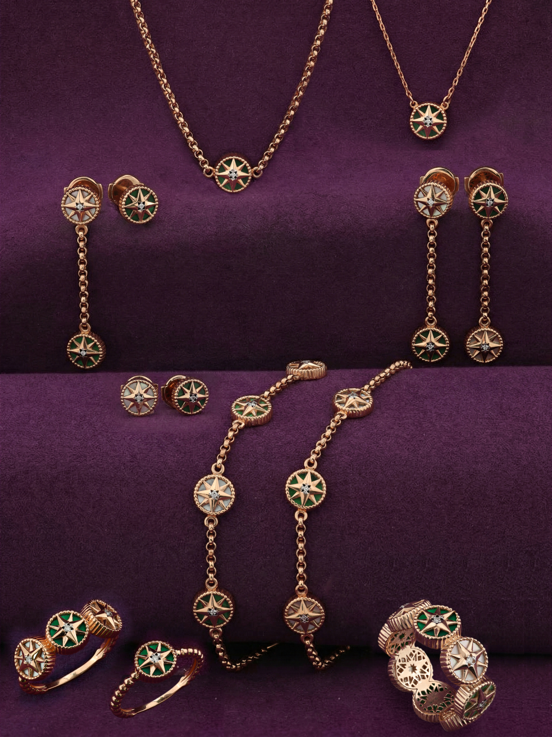 В центре композиции и декоративных элементов расположены 24 вставки круглой формы: сияющие бриллианты, глубокий зеленый малахит и нежный перламутр создают контрастный и притягательный визуальный ряд. Белый, зеленый и перламутровый цвета вставок подчеркивают мастерство исполнения и глубину дизайна. Это колье — универсальное украшение, которое одинаково гармонично дополнит стиль как женщин, так и мужчин, становясь ярким завершением любого образа.