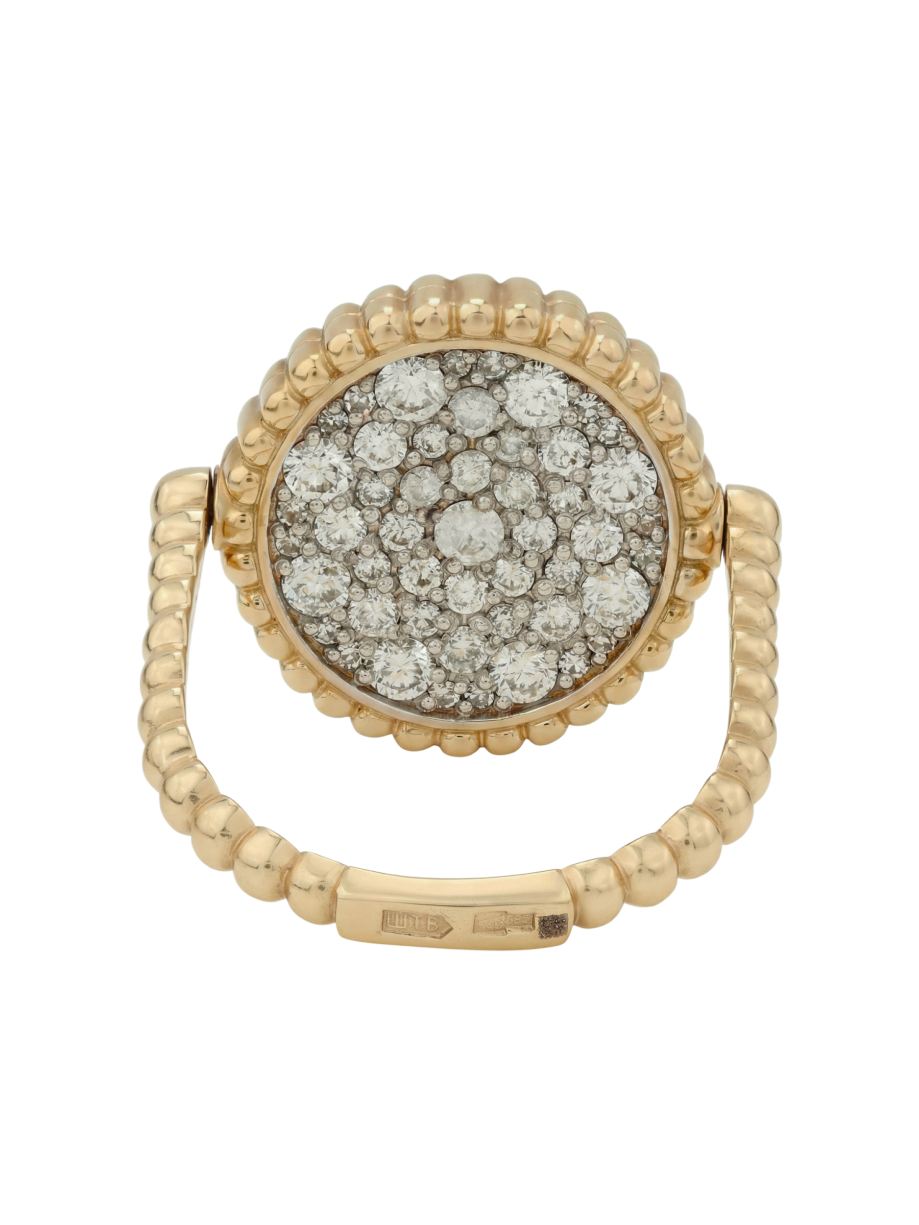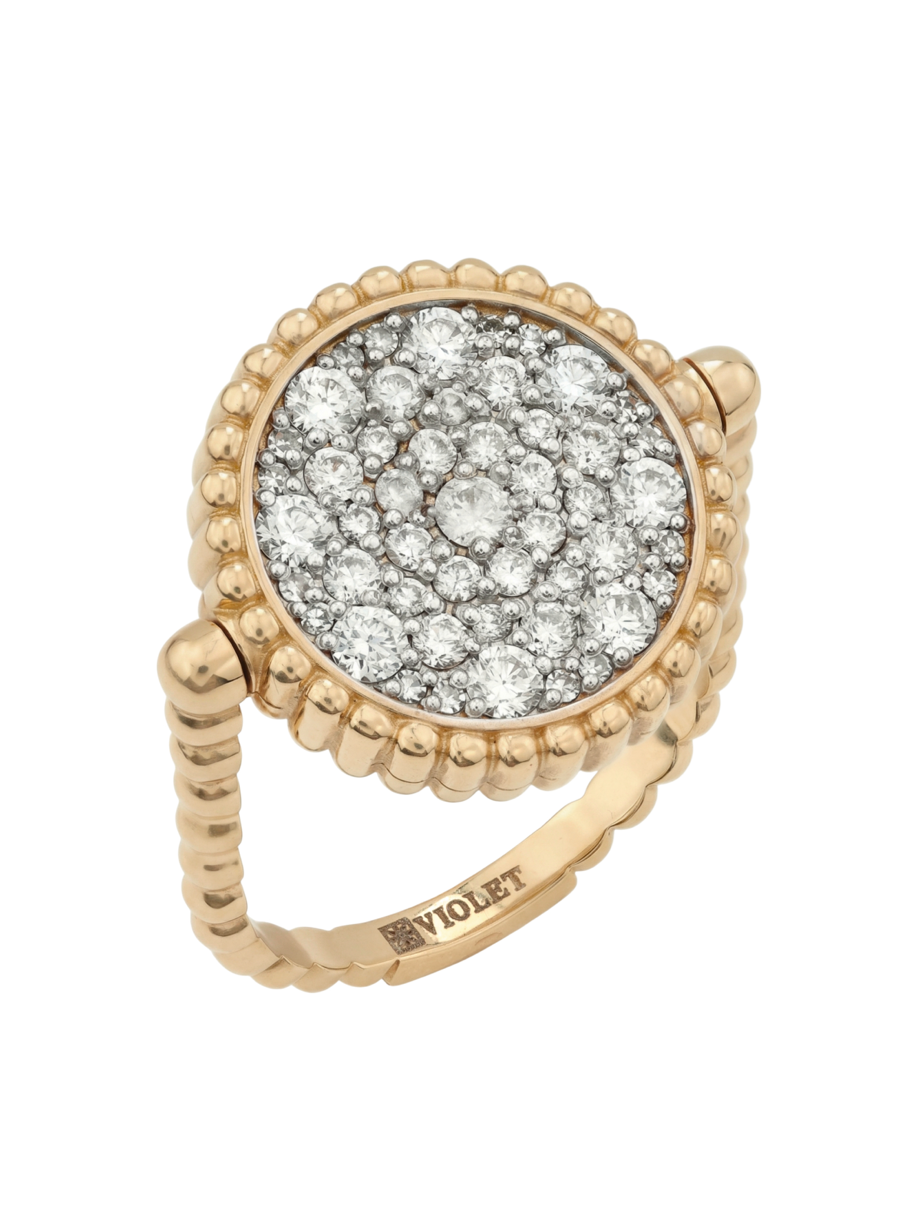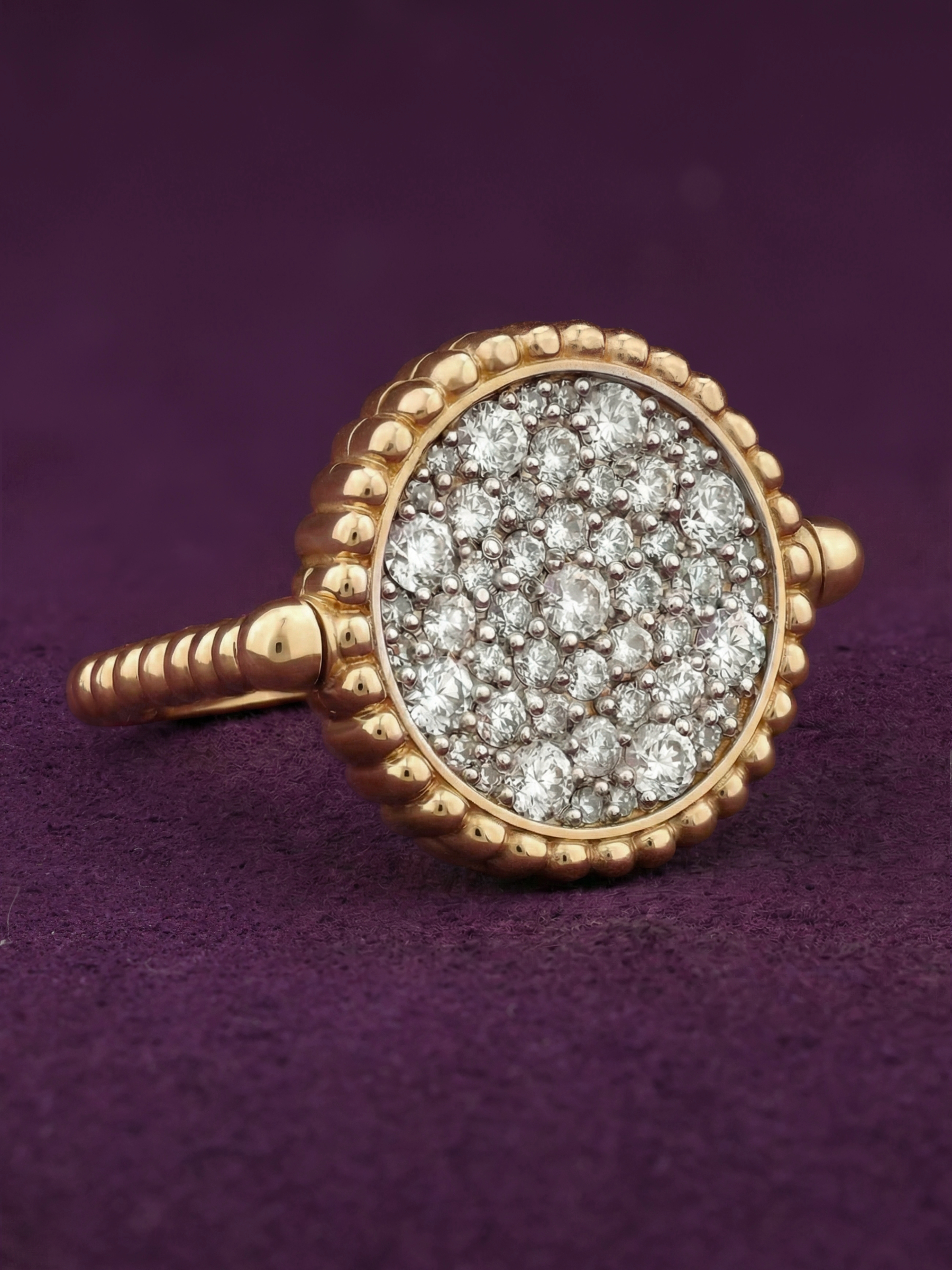 Ювелирное изделие инкрустировано 58 бриллиантами круглой огранки с безупречным белым сиянием. Россыпь камней добавляет украшению глубины и притягательности, заставляя его играть при каждом движении. Детализация элементов и внимание к качеству исполнения делают данное кольцо достойным выбором для тех, кто ценит эстетику высокого ювелирного искусства.