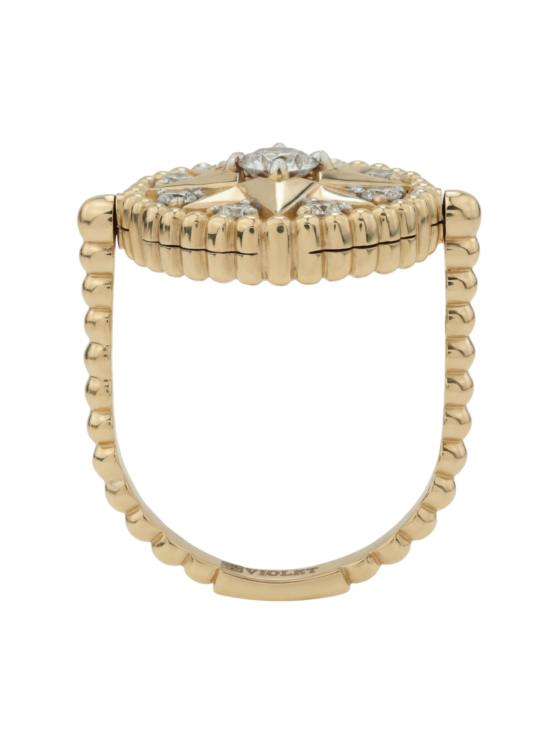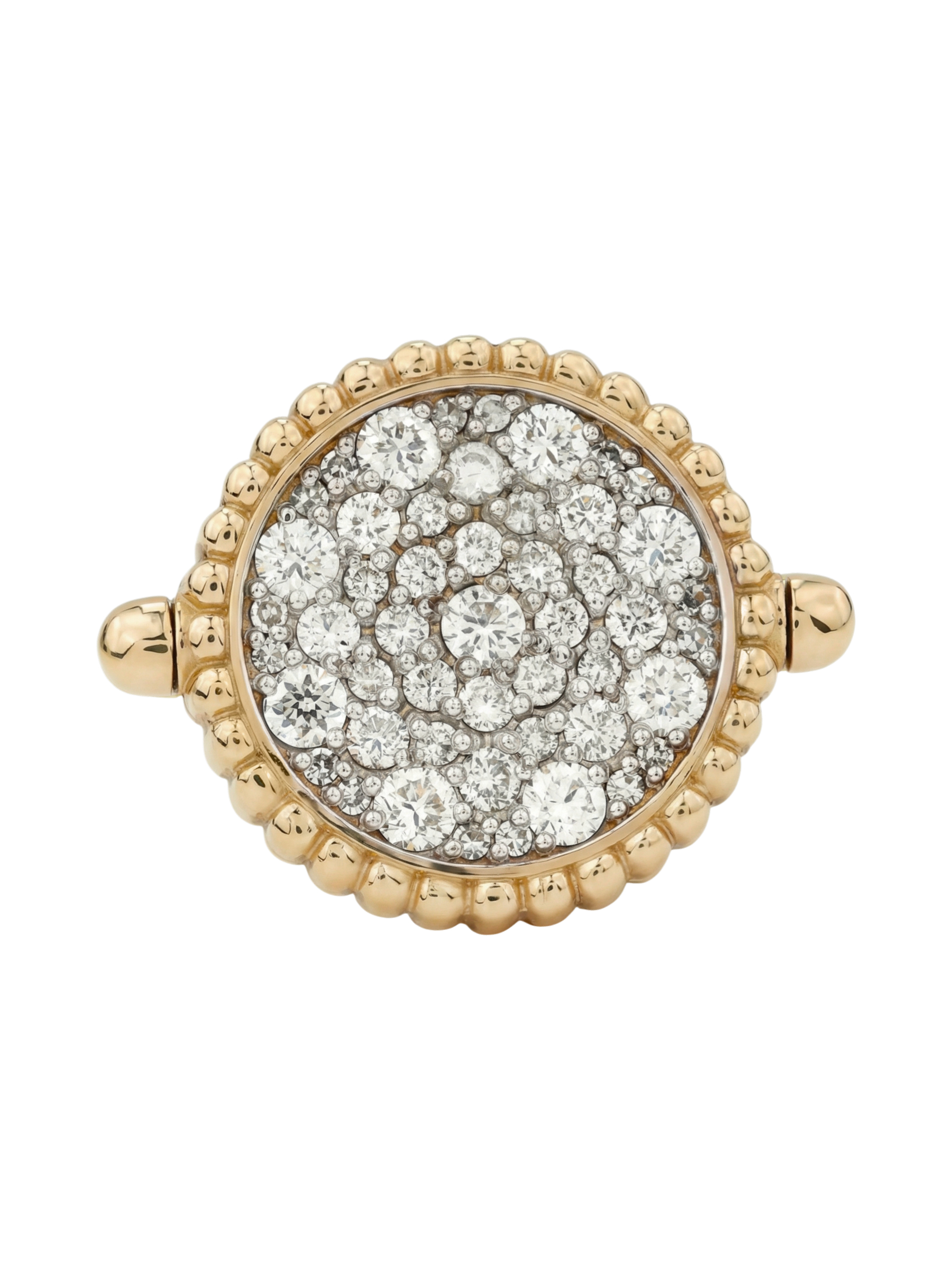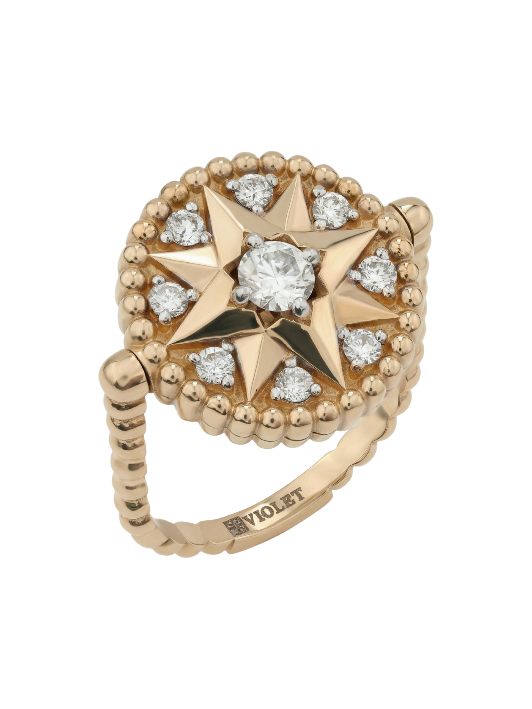 Ювелирное изделие инкрустировано 58 бриллиантами круглой огранки с безупречным белым сиянием. Россыпь камней добавляет украшению глубины и притягательности, заставляя его играть при каждом движении. Детализация элементов и внимание к качеству исполнения делают данное кольцо достойным выбором для тех, кто ценит эстетику высокого ювелирного искусства.