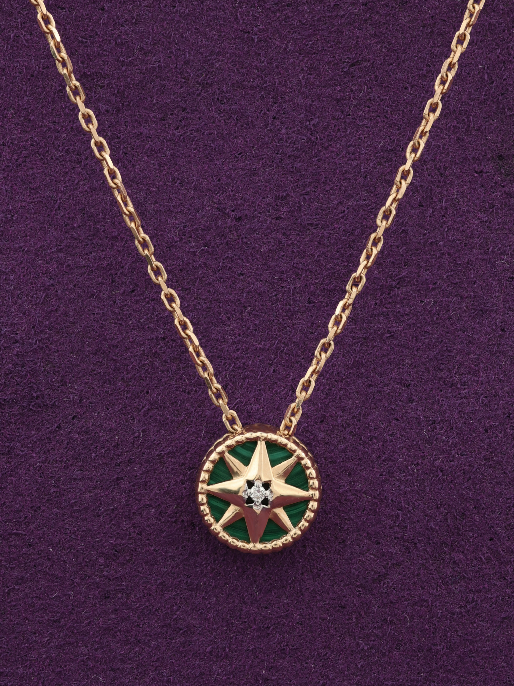 Мастерство ювелиров позволило объединить в одном изделии два контрастных материала: таинственный зеленый малахит круглой формы и сияющий белый бриллиант. Вставка из малахита придает колье глубину и насыщенный оттенок, а бриллиант добавляет благородный блеск. Такое сочетание делает украшение универсальным и запоминающимся.