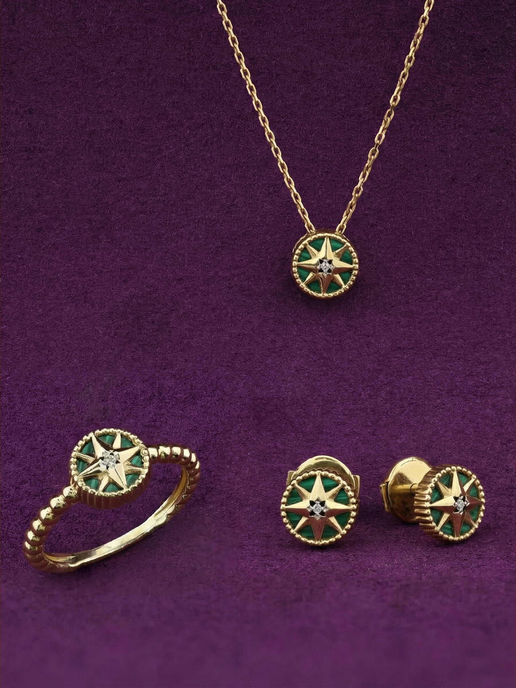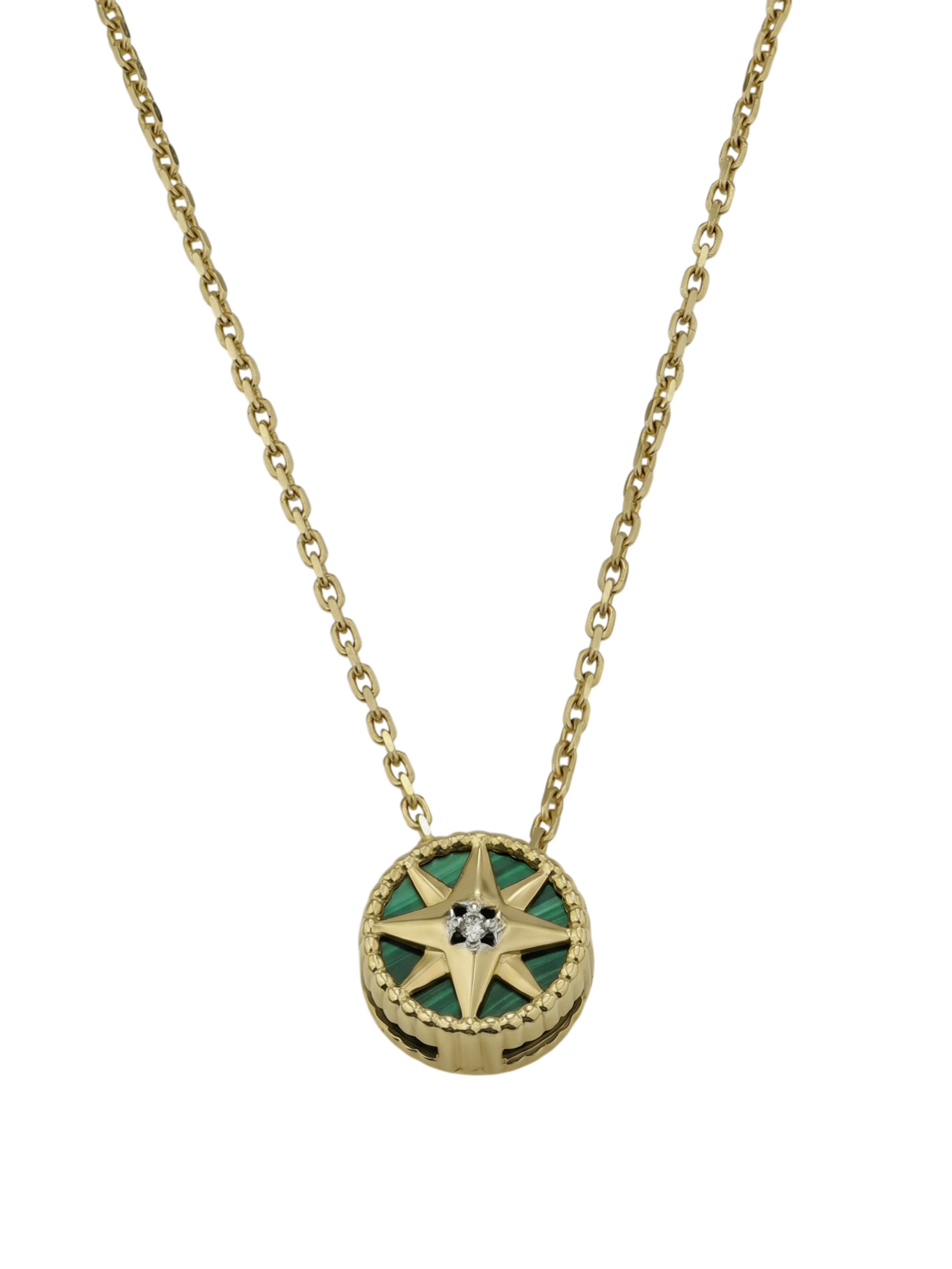 Элегантное колье из лимонного золота 585 пробы станет центральным акцентом вашего образа, подчеркивая безупречный вкус и статус. Это стильное украшение из коллекции De Luxe — Звёзды — Бриллианты выполнено в выразительном дизайне в виде звезды, символизирующей путеводный свет и успех. Центральным элементом ювелирного изделия является гармоничное сочетание теплых оттенков благородного металла и насыщенного малахита глубокого зеленого цвета. Фигурные вставки из малахита идеально дополняют облик колье, а контрастный блеск белого бриллианта круглой формы добавляет изделию роскошное сияние.