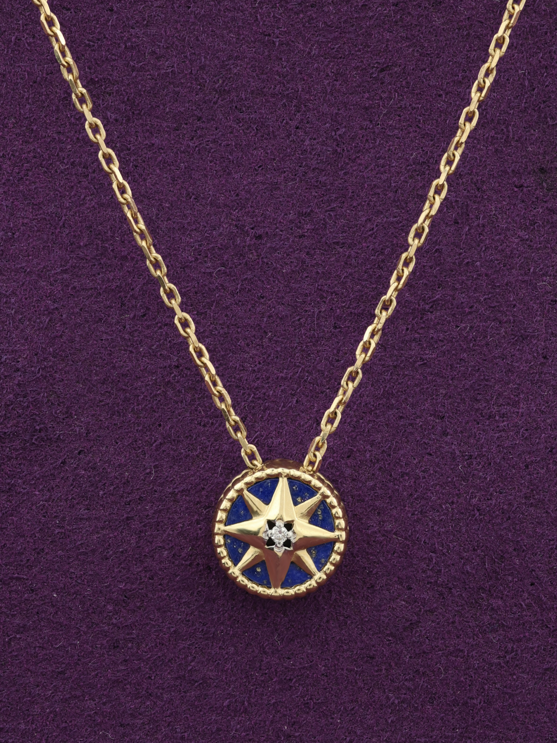 В центре композиции гармонично сочетаются две вставки: благородный лазурит синего цвета и сверкающий бриллиант белого оттенка. Обе вставки имеют правильную форму круга, создавая идеальный баланс между строгостью линий и роскошью драгоценных камней. Лимонное золото, из которого выполнено колье, добавляет изделию особого шарма и выразительности.