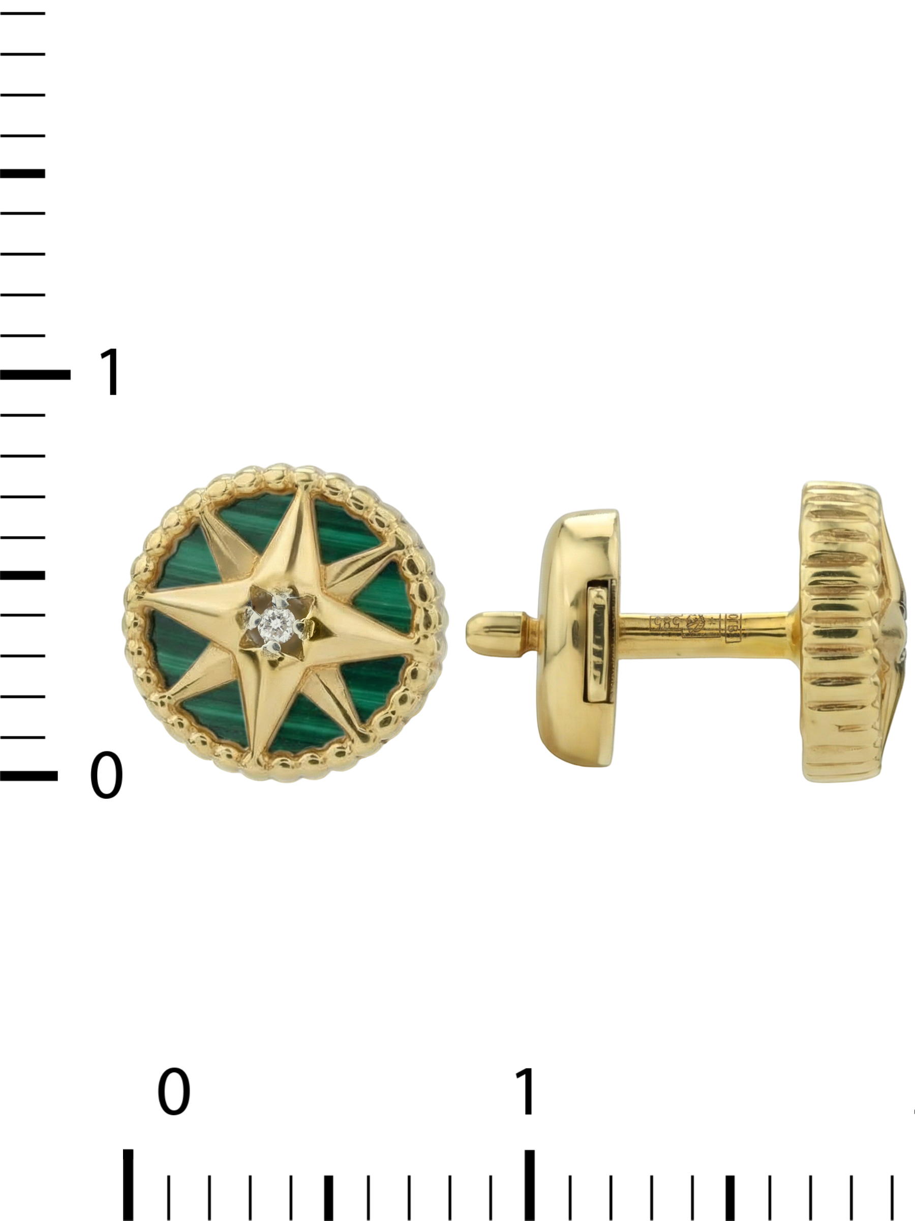 Центральным элементом композиции является яркое сочетание камней: насыщенный зеленый малахит круглой формы соседствует с искрящимся белым бриллиантом, расположенным в самом сердце звезды. Всего в украшении использовано 4 вставки, которые гармонично дополняют друг друга, создавая эффектный и статусный аксессуар. Универсальный дизайн позволяет носить эти серьги как женщинам, так и мужчинам, предпочитающим утонченные и символичные украшения.
