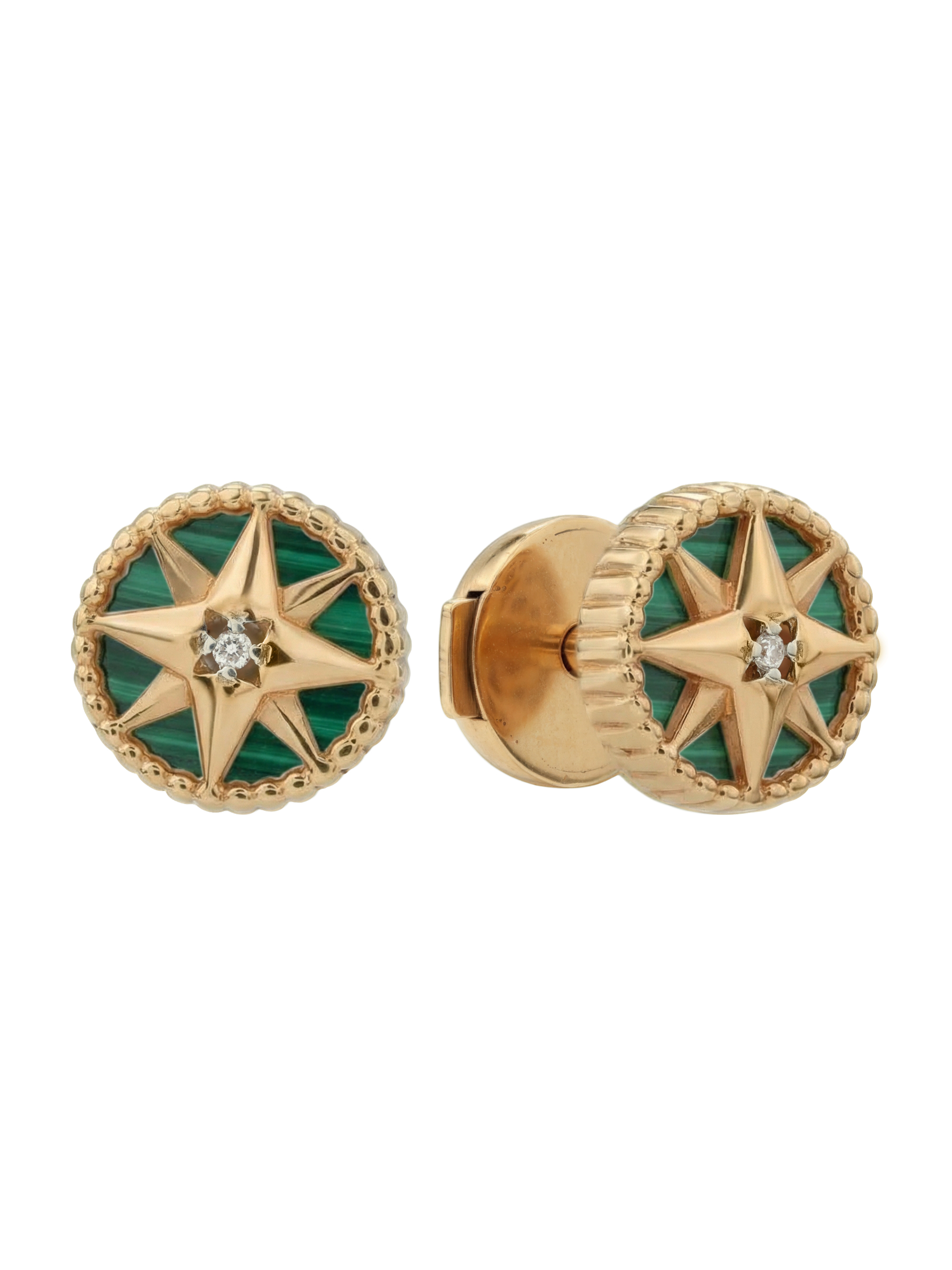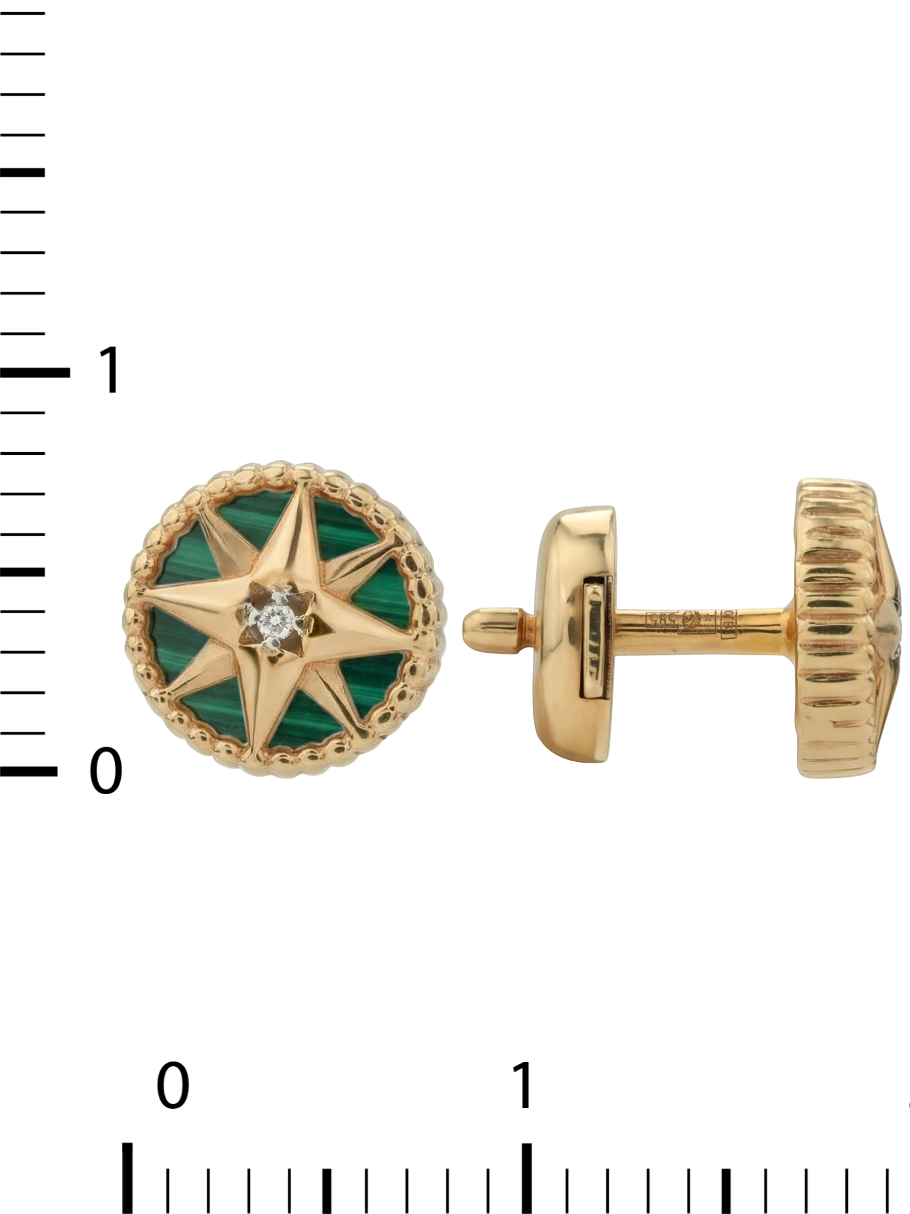 В центре каждого декоративного элемента расположена вставка из белого бриллианта круглой формы, создающая яркий и благородный контраст с глубоким оттенком малахита. Общее количество вставок в изделии составляет четыре единицы, что обеспечивает сбалансированную игру света. Тщательно проработанная форма звезд делает эти серьги заметным акцентом в любом образе.