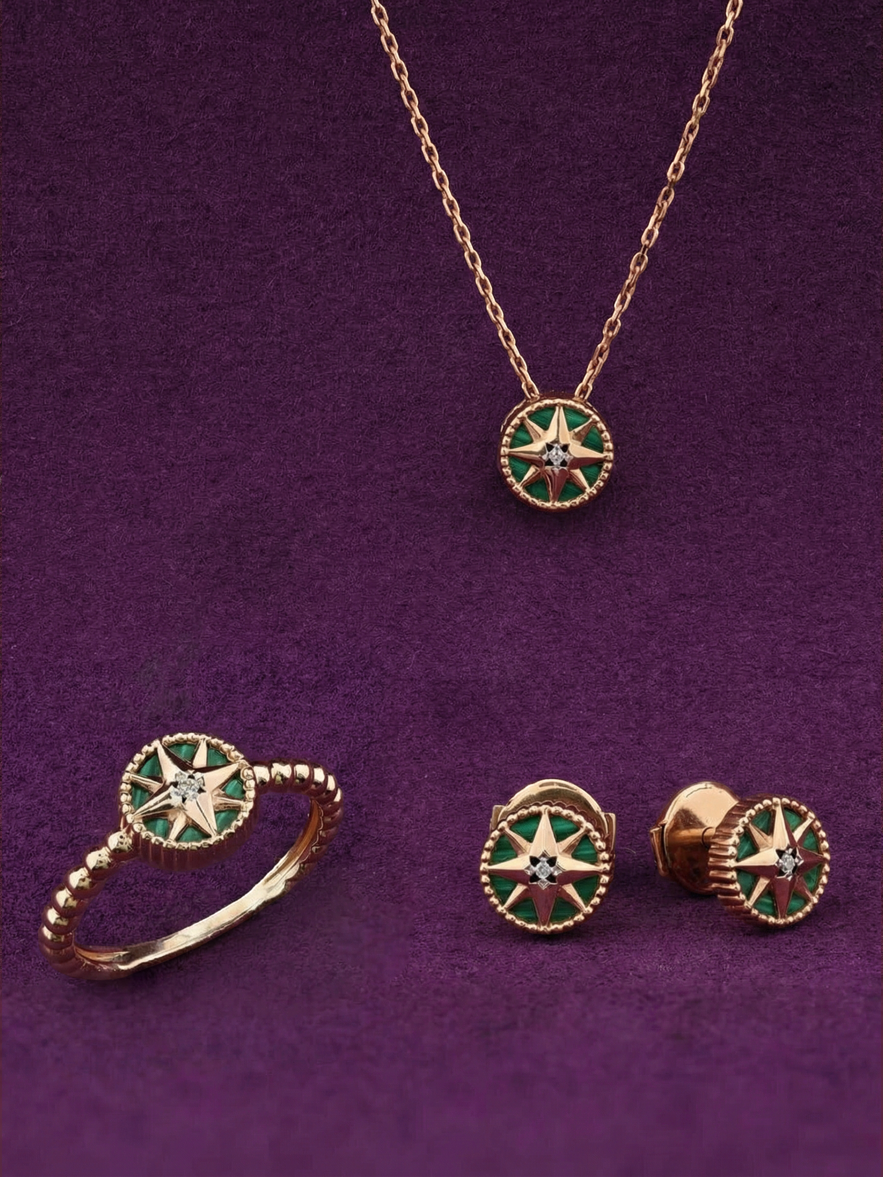 Серьги из красного золота 585 пробы из коллекции De Luxe — Звёзды — Бриллианты представляют собой воплощение изысканности и глубокого символизма. Дизайн изделия вдохновлен образом звезд, что придает аксессуару особенную выразительность. Основным акцентом композиции выступает насыщенный зеленый малахит, который гармонично сочетается с теплым блеском красного металла, подчеркивая статусность украшения.