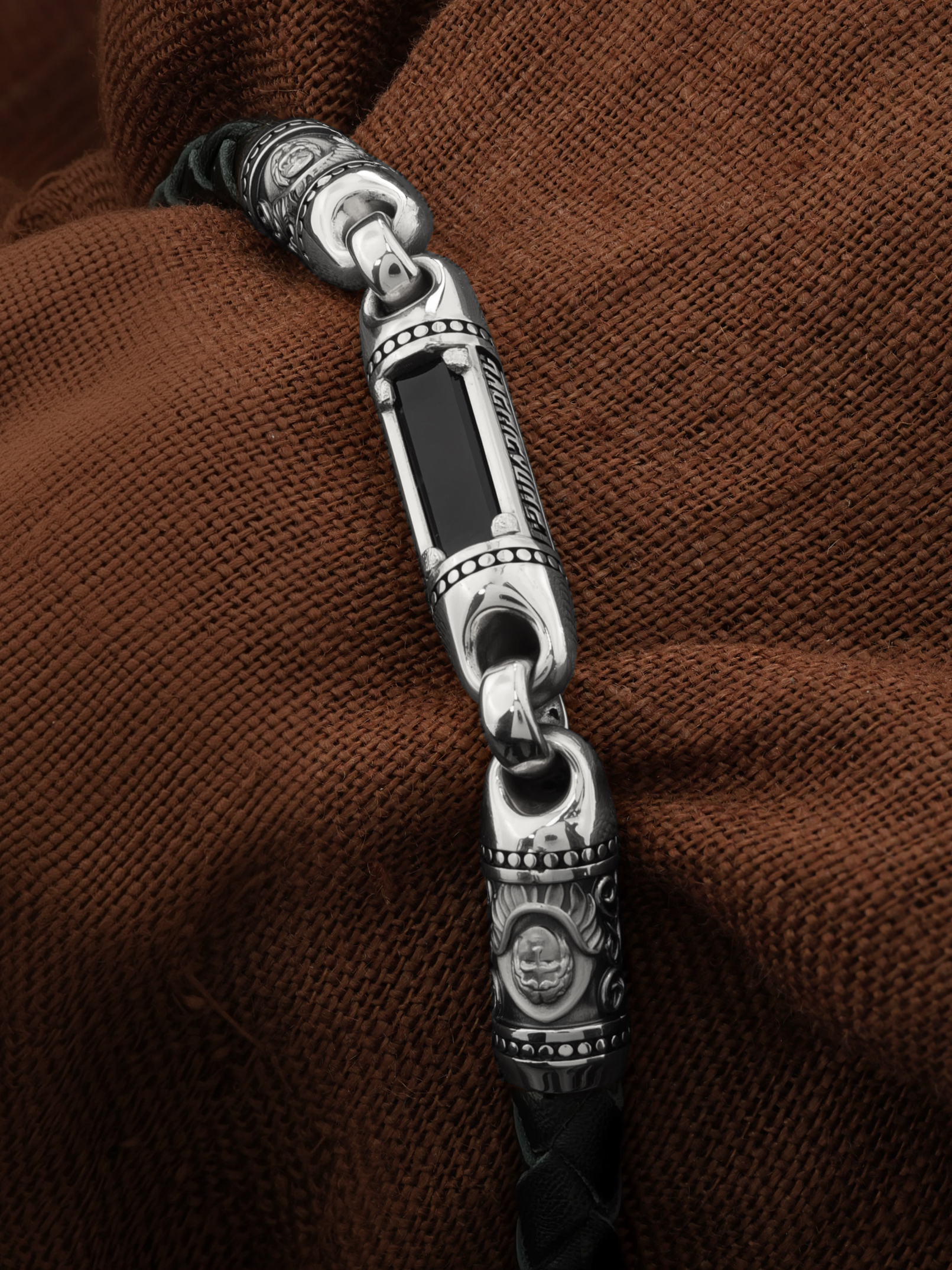 Браслет из белого золота c кожаным шнурком и ониксом