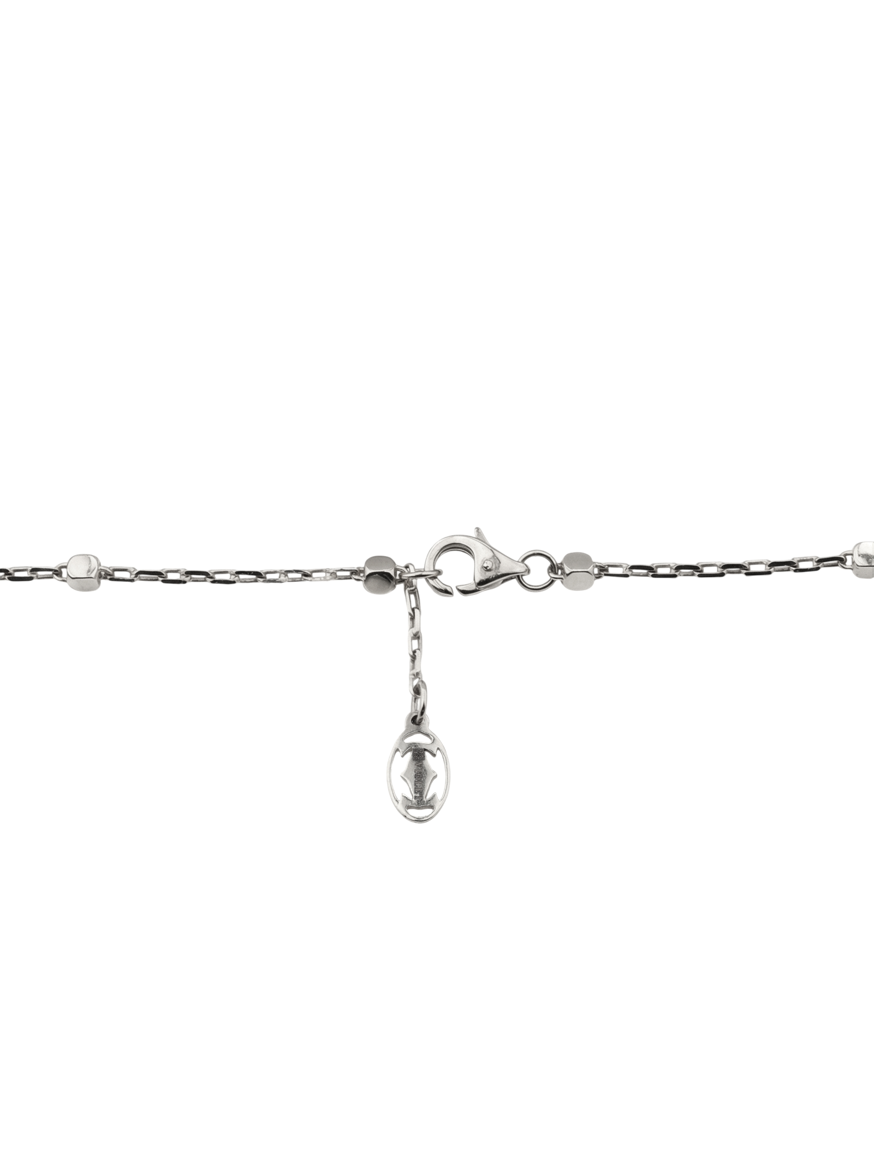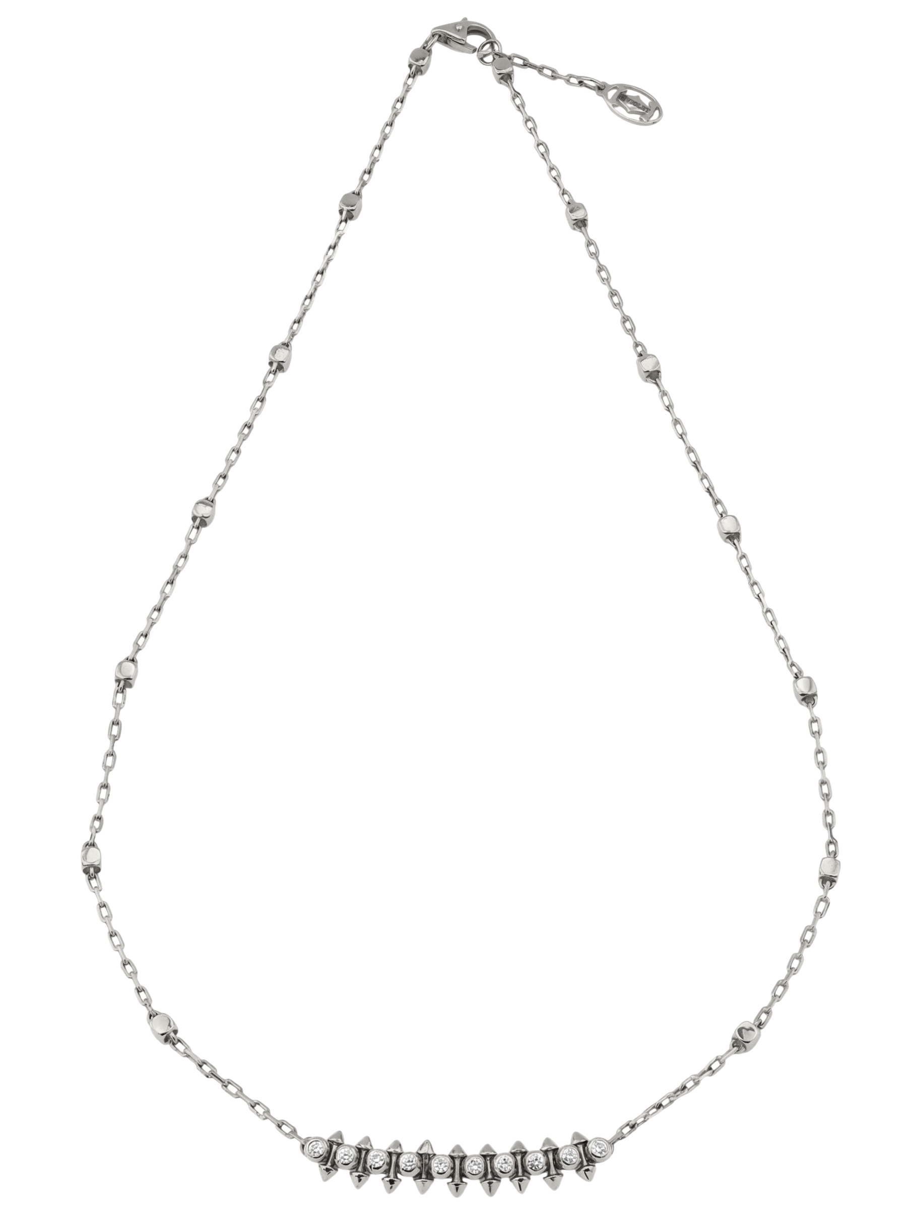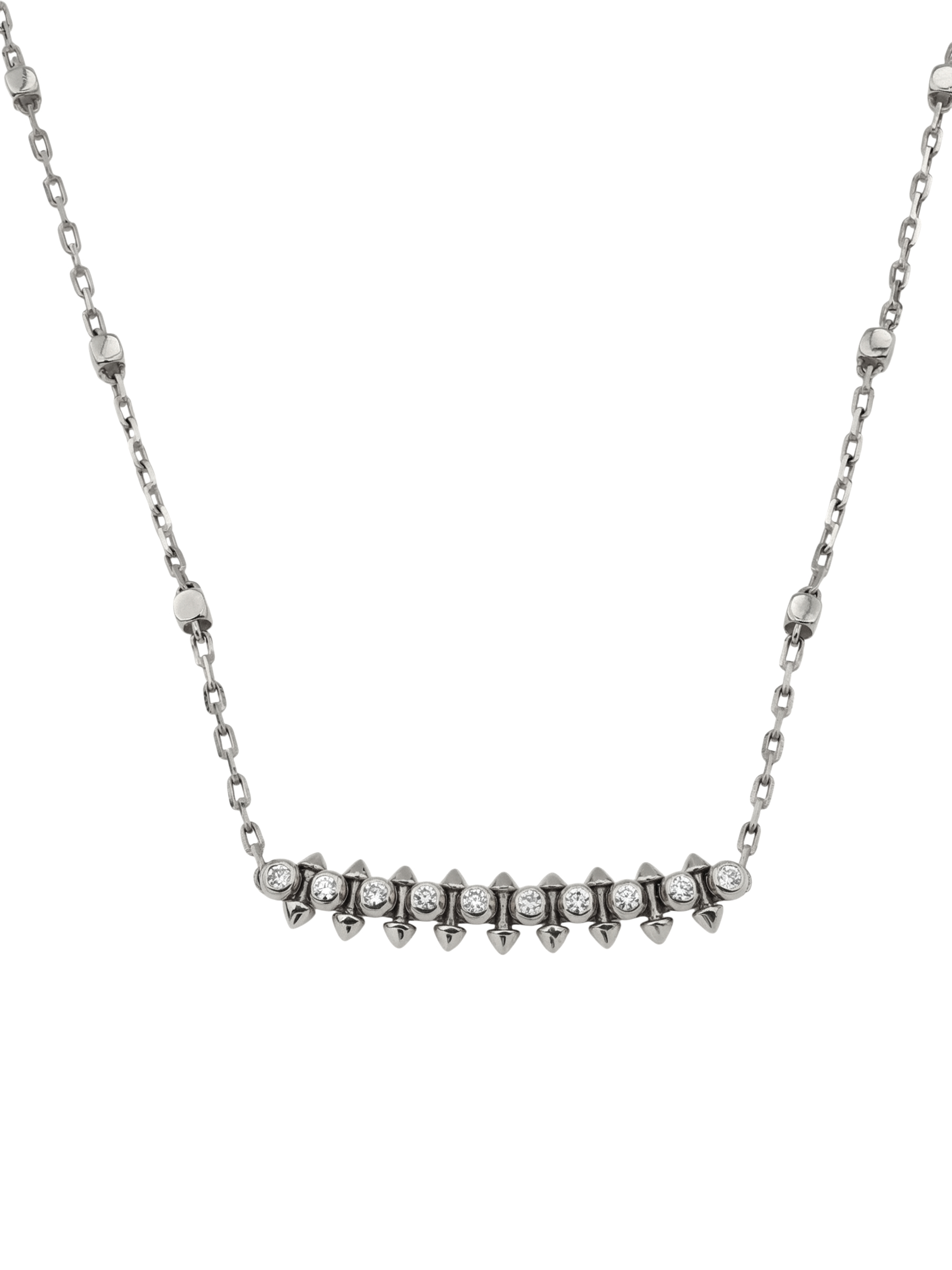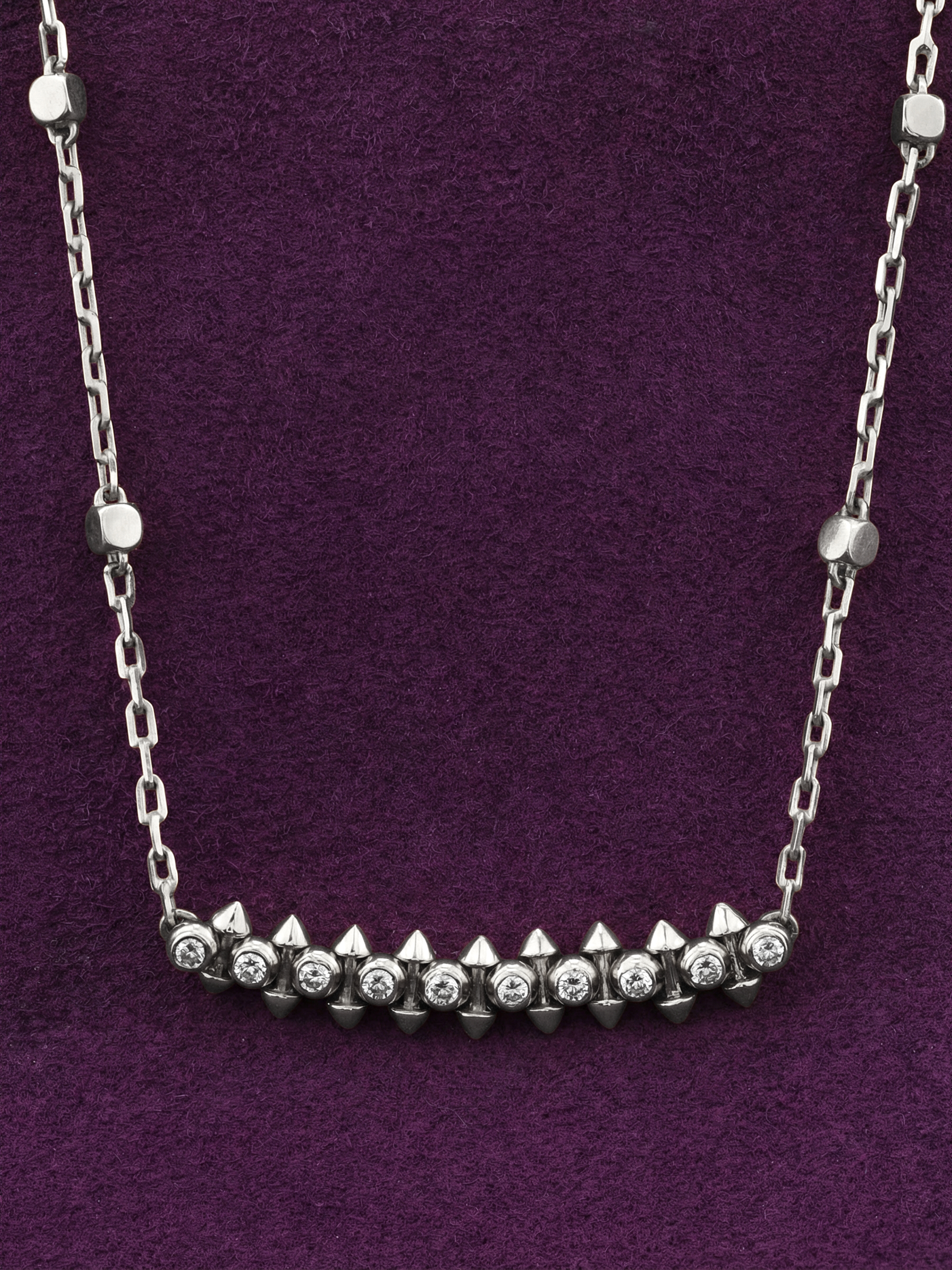 Основой колье служит благородное белое золото 585 пробы, которое придает изделию холодный, аристократичный блеск. Вдоль центральной части украшения расположено 20 белых бриллиантов идеальной круглой формы огранки. Их чистое сияние эффектно контрастирует с металлической текстурой шипов, делая изделие одновременно строгим и притягательным. Гармоничное чередование камней и металла делает колье уникальным аксессуаром, который одинаково гармонично смотрится как на женщинах, так и на мужчинах.