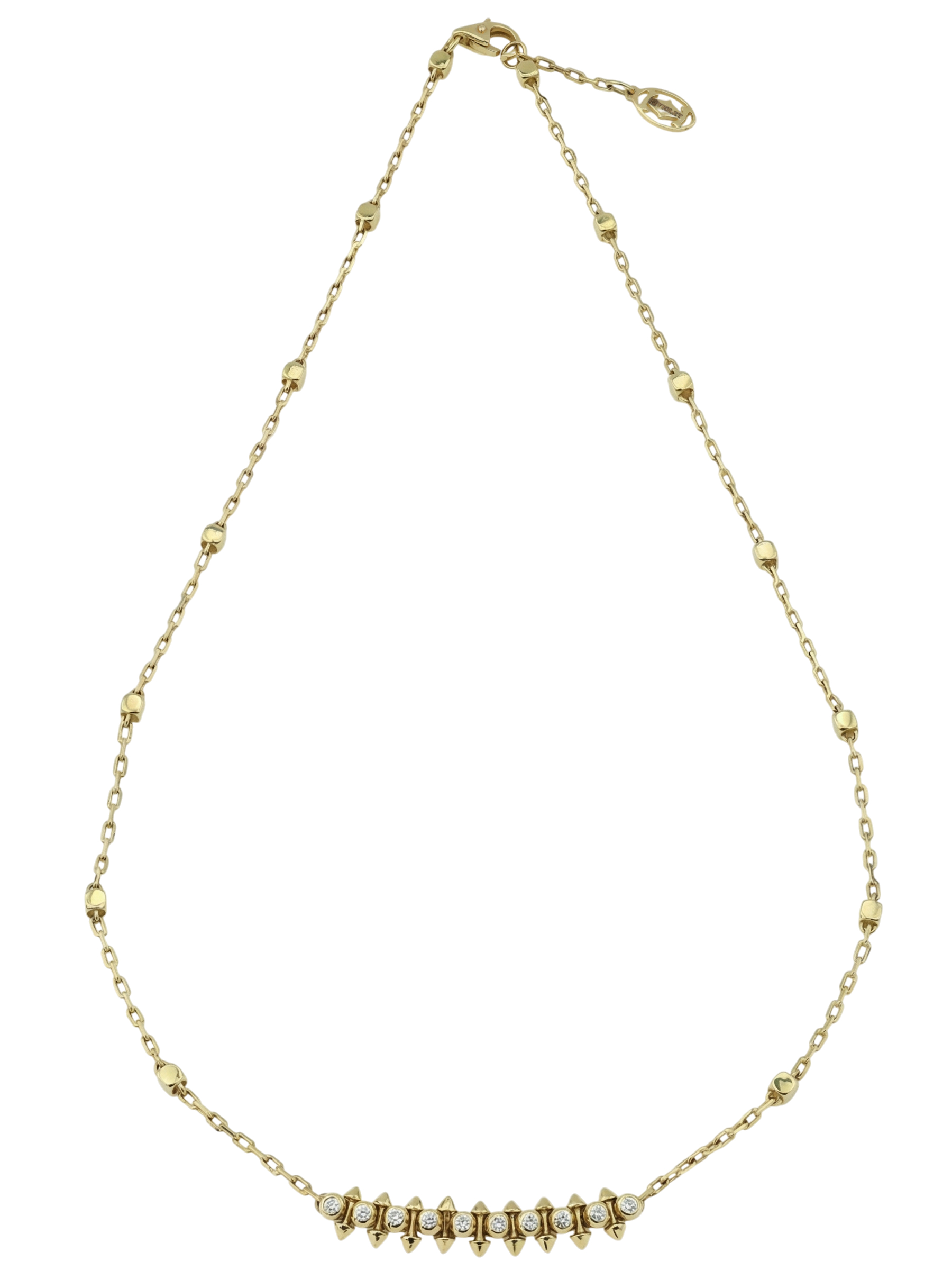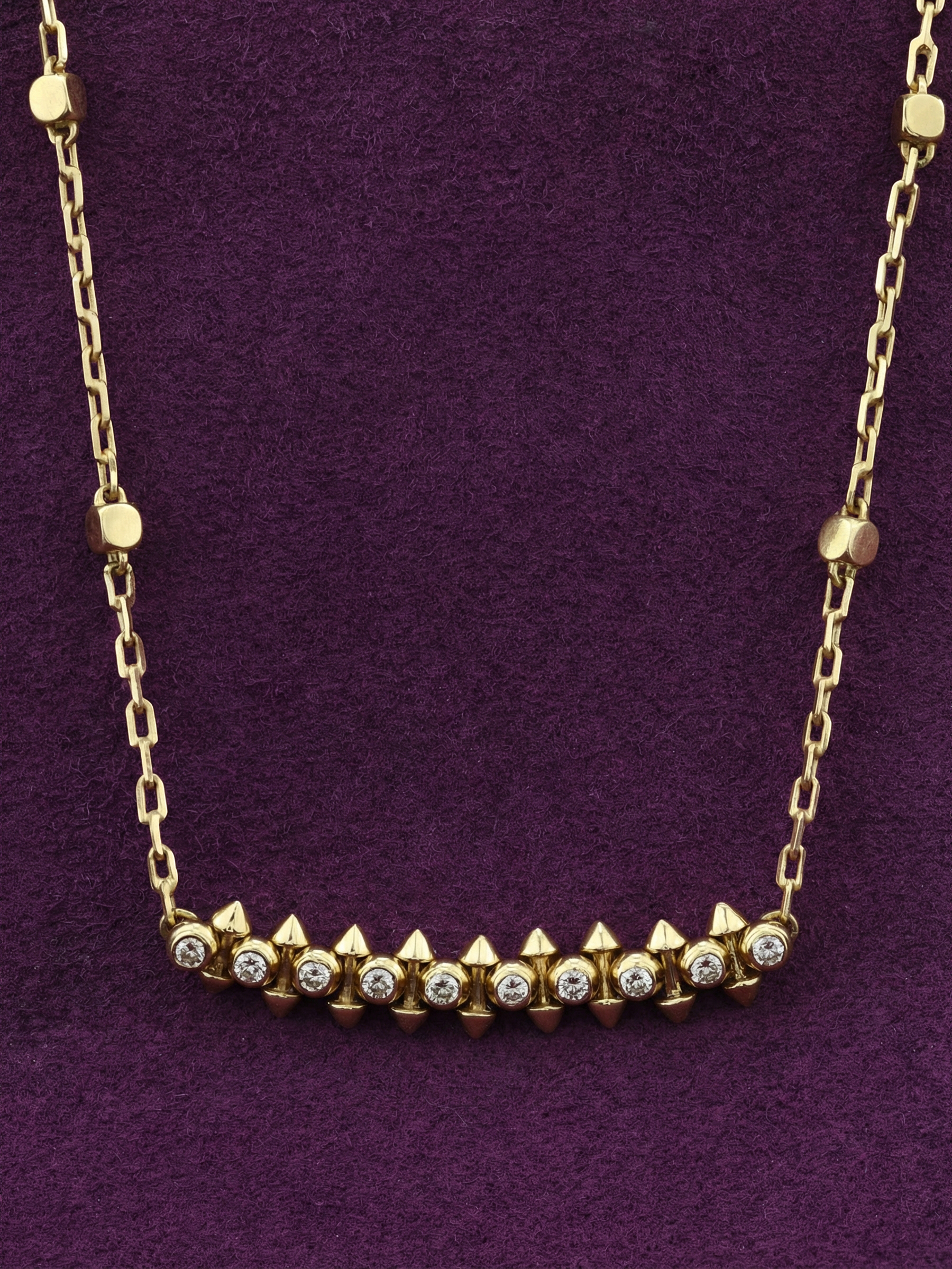 Колье из лимонного золота с бриллиантами — это воплощение смелого современного стиля и безупречного ювелирного мастерства. Изделие, представленное в коллекции De Luxe — Дерзость, создано для тех, кто ценит в украшениях характер и дерзость. Геометричный дизайн с элементами в виде шипов придает колье уникальную динамику и позволяет ему стать центральным акцентом вашего образа.