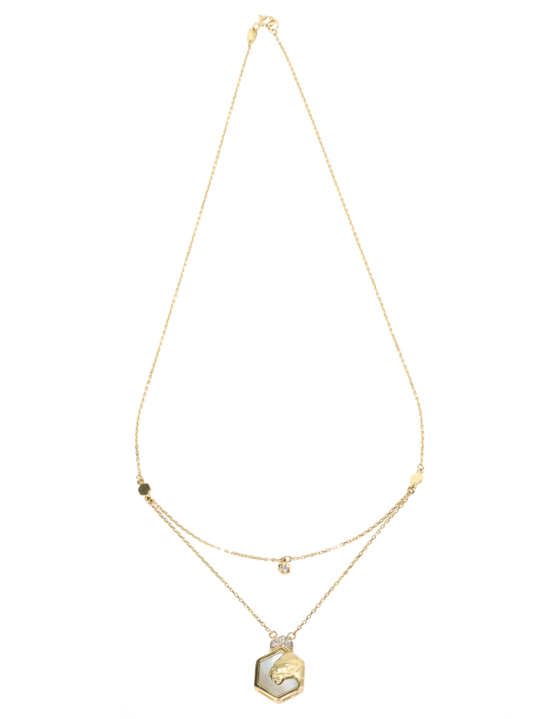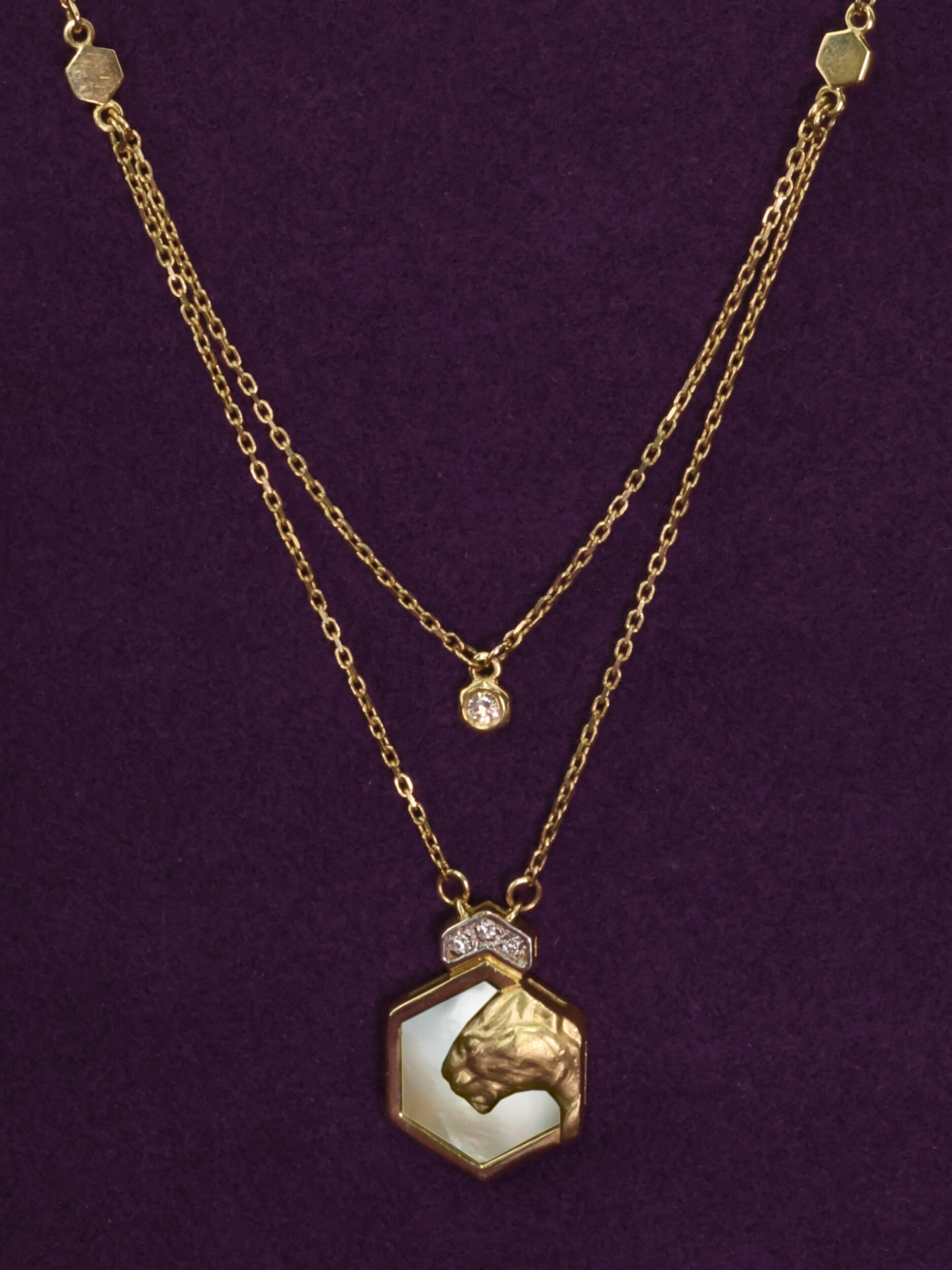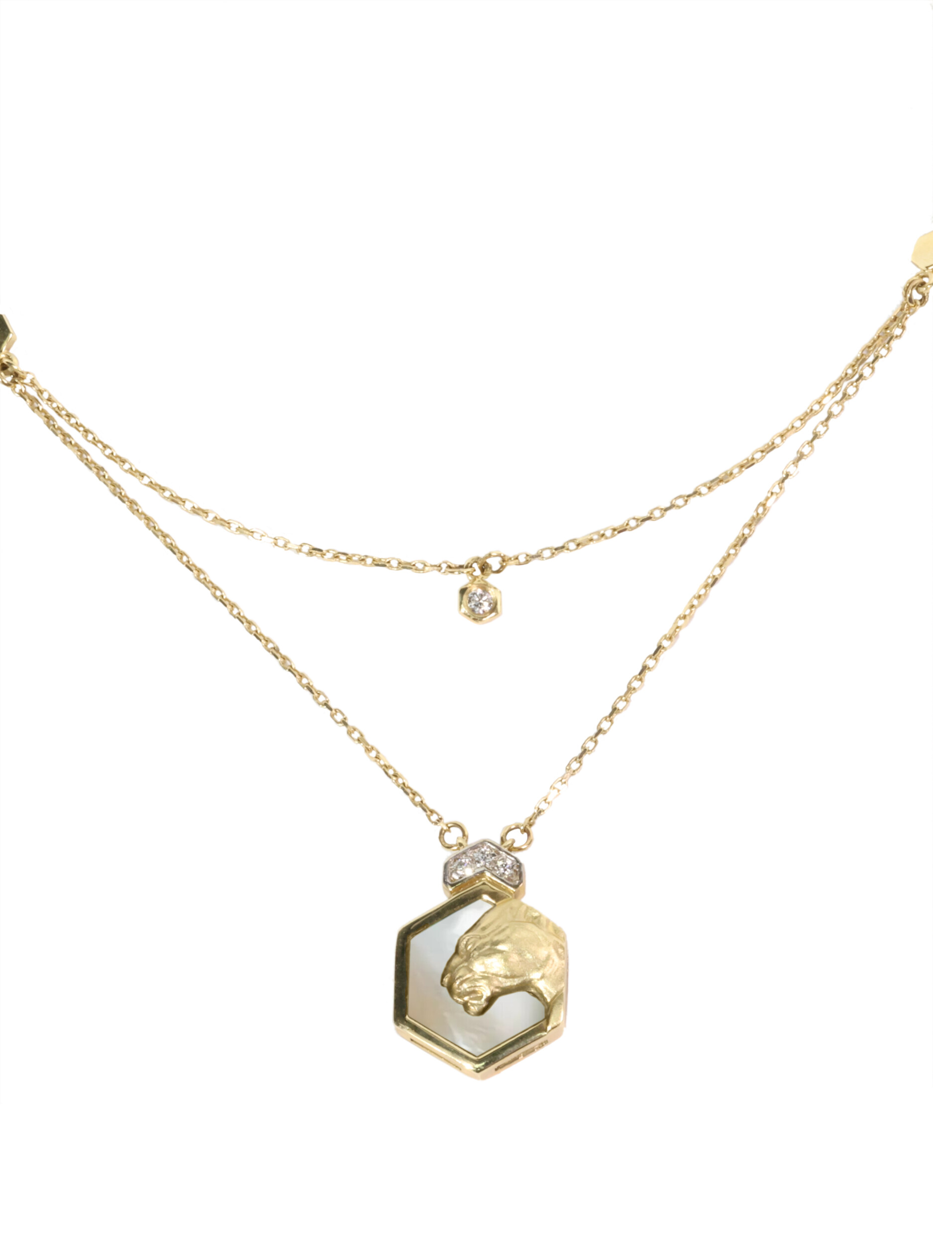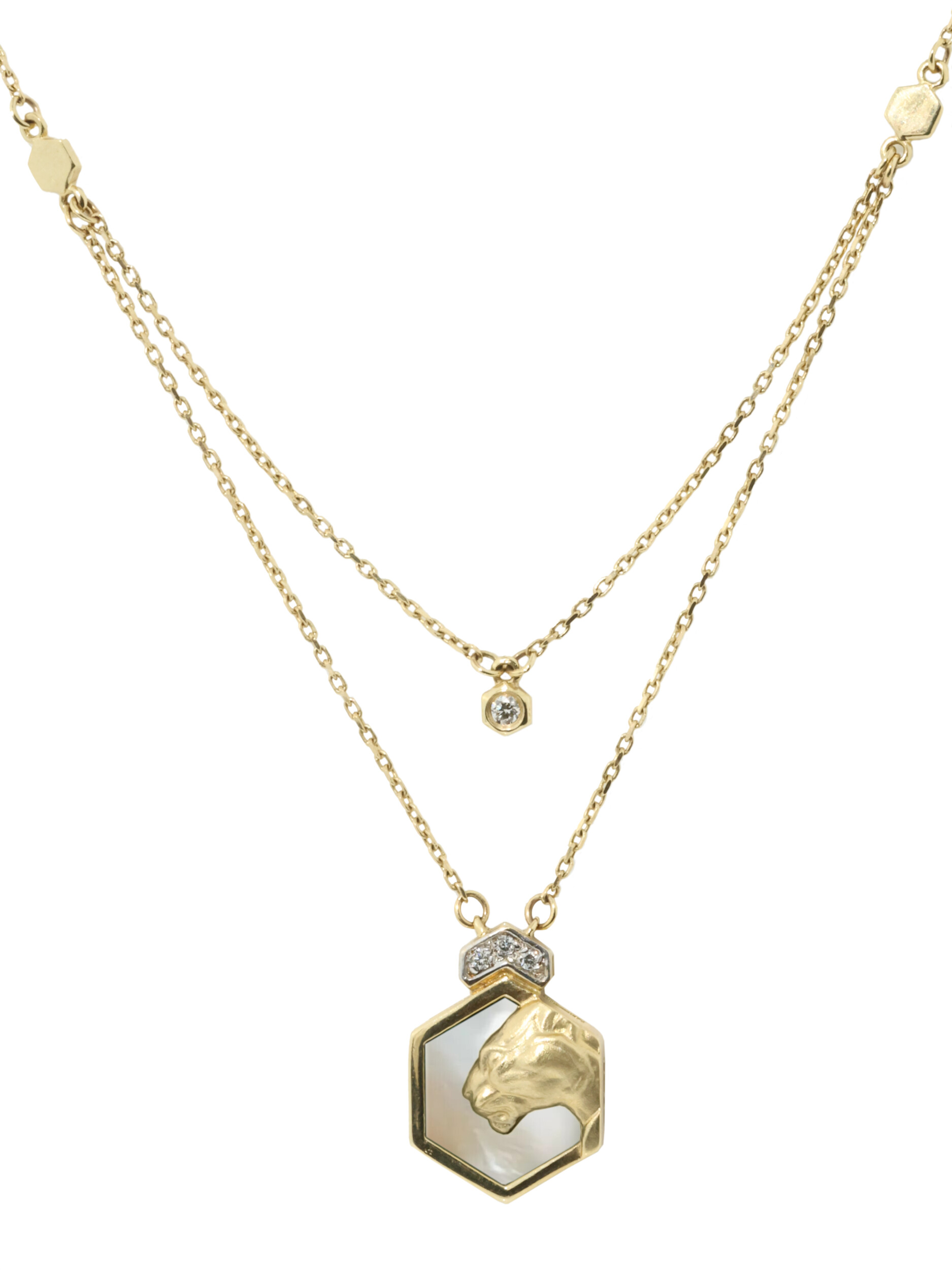 Колье из лимонного золота 585 пробы из коллекции De Luxe — Гексагон — это выразительное украшение, сочетающее в себе анималистические мотивы и современную геометрию. Центральным элементом дизайна выступает изящный шестигранник, внутри которого расположена искусно выполненная фигура пантеры. Этот образ хищника гармонично дополнен вставками из нежного перламутра, которые придают изделию особое внутреннее свечение.