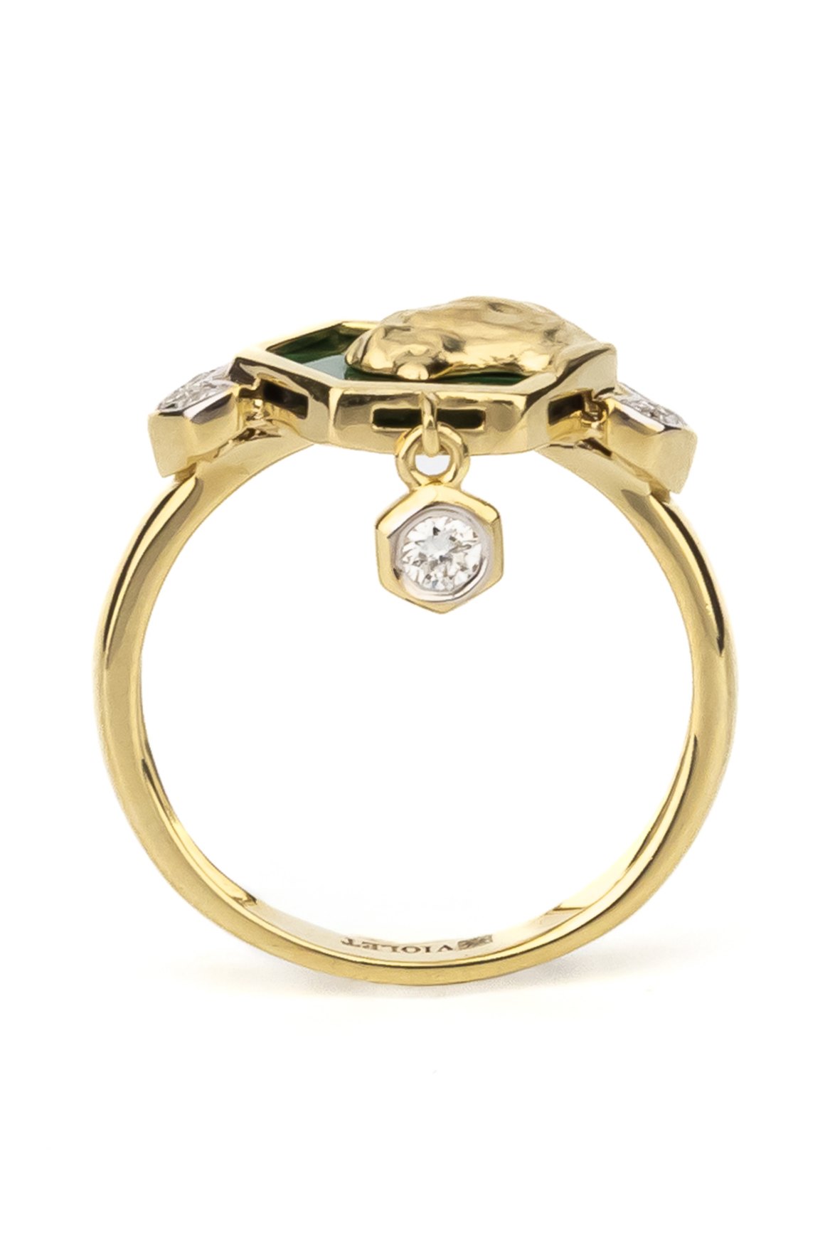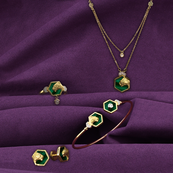Центральным элементом композиции выступает крупная вставка из малахита насыщенного зеленого цвета, обрамленная в геометричную форму шестигранника. Глубокий, природный оттенок камня идеально сочетается с благородным лимонным цветом золотого сплава. Дополнительное сияние изделию придают 8 вставок — прозрачные бриллианты классической круглой огранки, которые переливаются при каждом движении, создавая изысканный контраст с матовой текстурой металла. Эффектная подвижная деталь в виде небольшого шестигранника с бриллиантом добавляет украшению динамичности и подчеркивает сложную работу ювелиров.