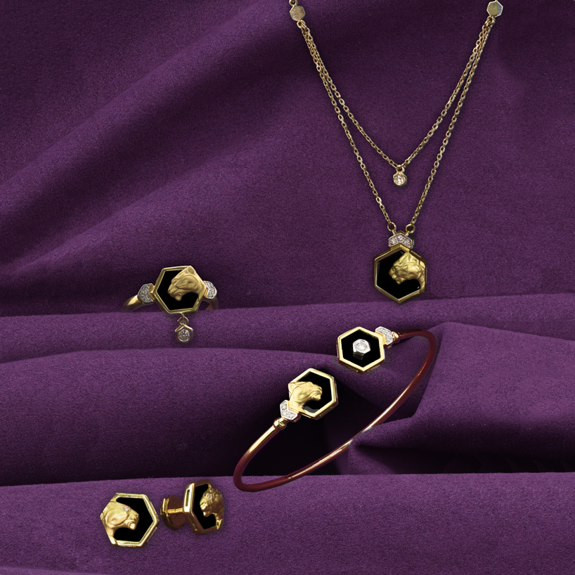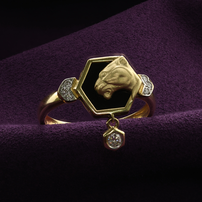 Представляем изысканное кольцо, способное подчеркнуть вашу индивидуальность и статус. Это ювелирное украшение из коллекции De Luxe — Гексагон выполнено из благородного лимонного золота 585 пробы. Уникальный дизайн, вдохновленный грацией пантеры, делает изделие по-настоящему притягательным и выразительным. В центре композиции расположен глубокий черный оникс в форме шестигранника, на фоне которого эффектно выделяется объемная фигура хищника.