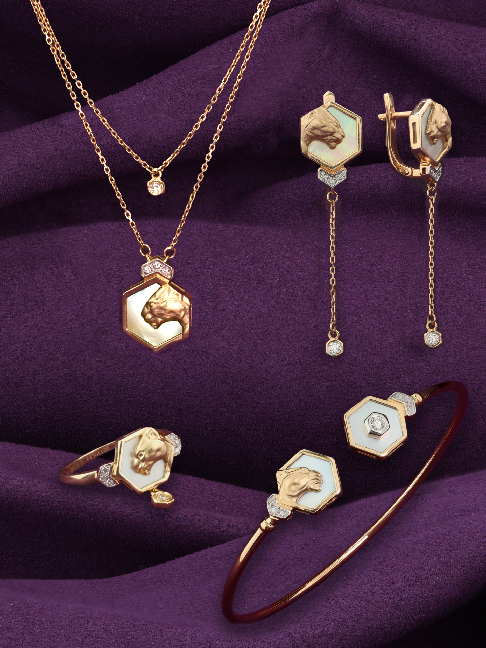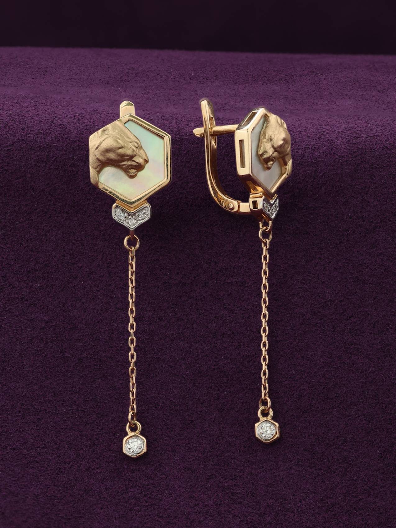 Эффектные серьги из коллекции De Luxe — Гексагон станут выразительным акцентом в образе, сочетающим в себе грацию дикой природы и премиальный блеск драгоценных камней. Изделие выполнено из благородного красного золота 585 пробы, что обеспечивает украшению долговечность и теплый, глубокий оттенок металла. Дизайн модели вдохновлен эстетикой хищников — центральным элементом композиции является изящное изображение пантеры, гармонично дополненное вставками из перламутра с нежным переливом.