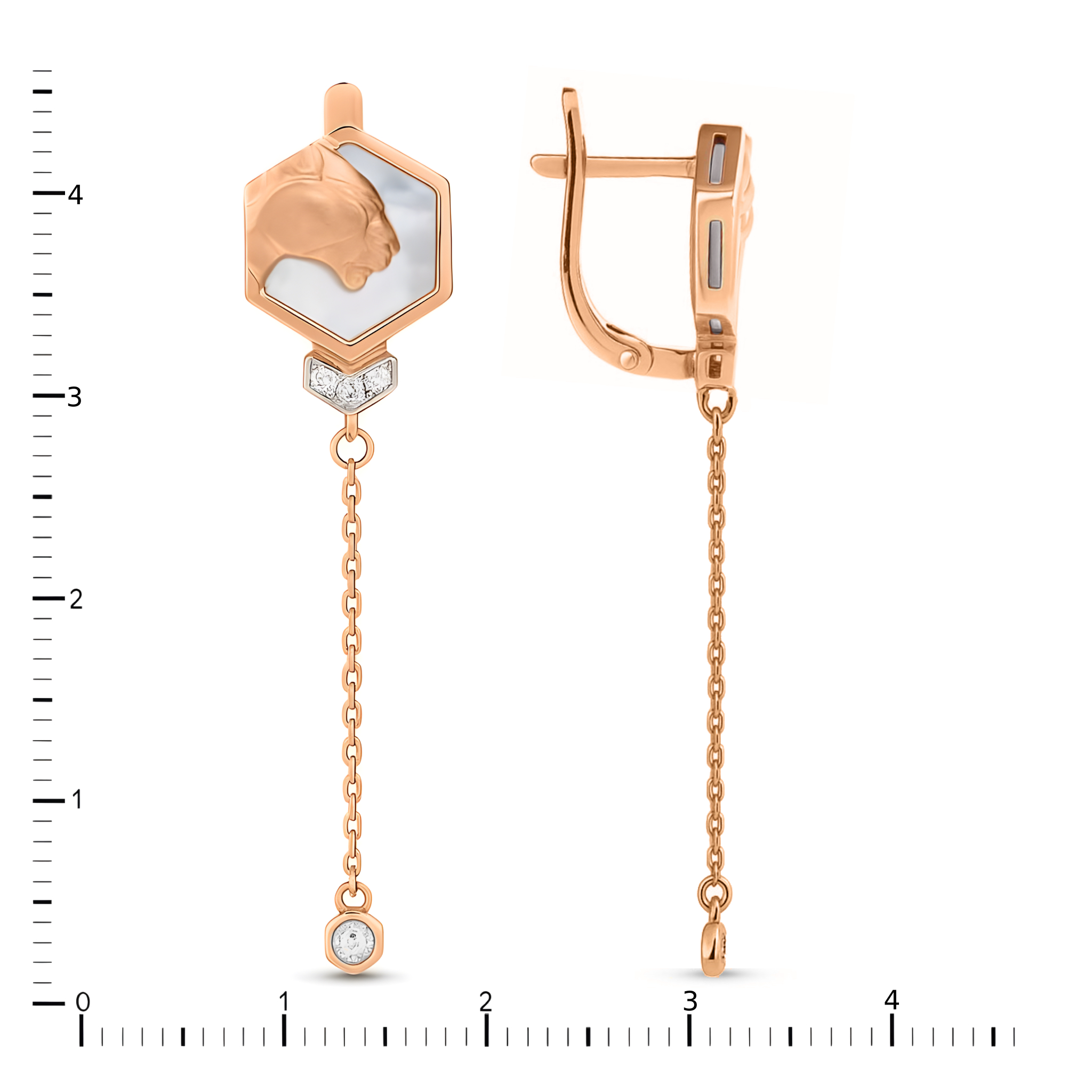 Особую изысканность серьгам придает сочетание форм: классический круг и строгий шестигранник создают оригинальную геометрию, подчеркнутую сиянием восьми бриллиантов. Белый цвет вставок эффектно контрастирует с теплым красным золотом, а подвесная часть на изящной цепочке добавляет украшению динамики и легкости при каждом движении. Общая композиция выглядит сбалансировано и статуснo, привлекая внимание мастерством исполнения и продуманными деталями.