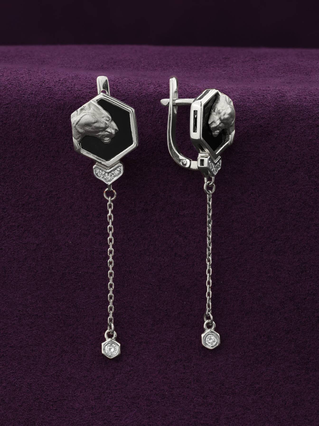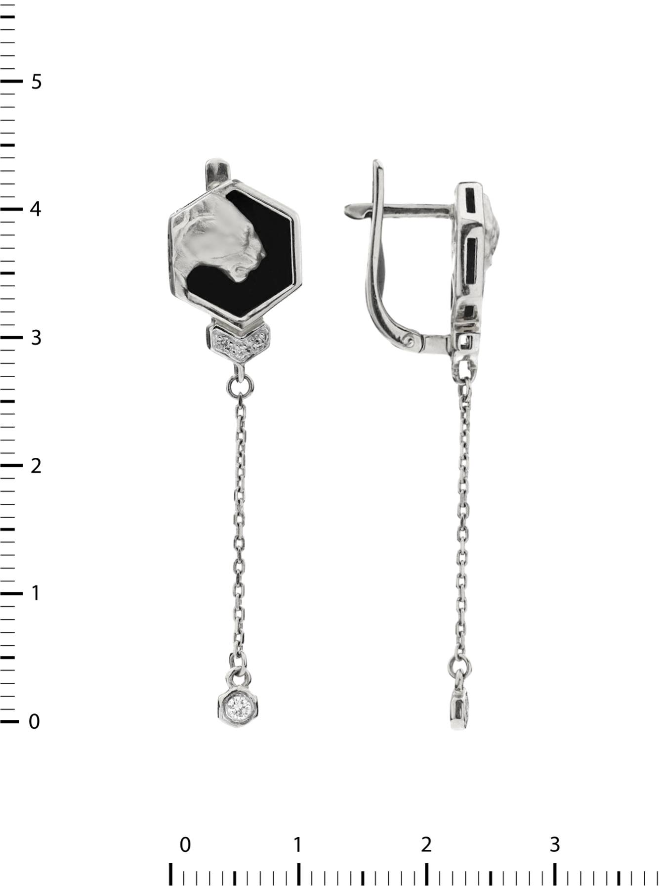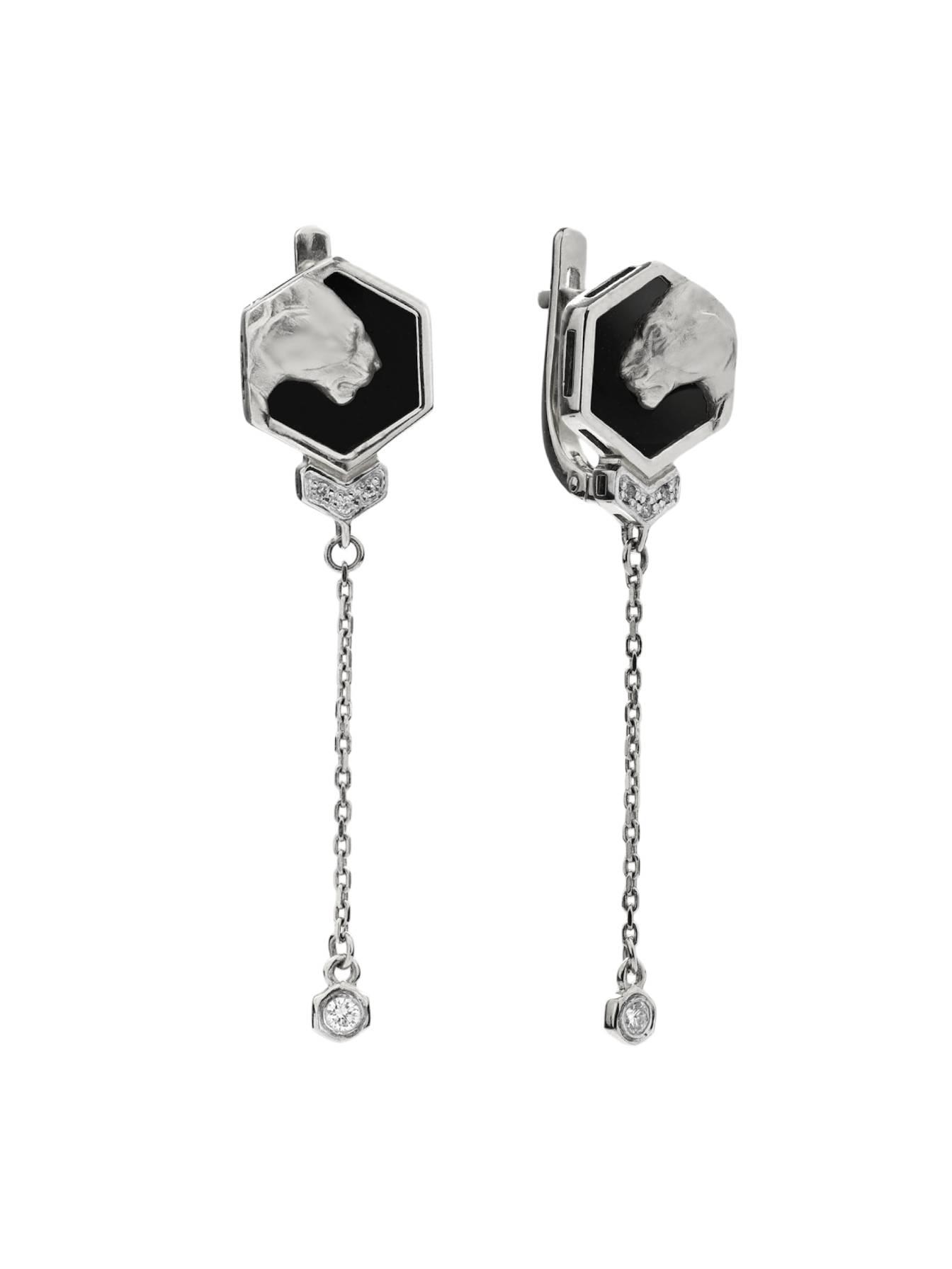 Серьги из белого золота 585 пробы из коллекции De Luxe — Гексагон представляют собой воплощение дерзкого дизайна и ювелирного мастерства. В центре композиции — выразительные головы пантер, выполненные из светлого металла, которые гармонично сочетаются с глубоким черным ониксом, имеющим форму шестигранника. Этот контрастный дуэт подчеркивает глубину каждого элемента и придает украшению статусный вид.