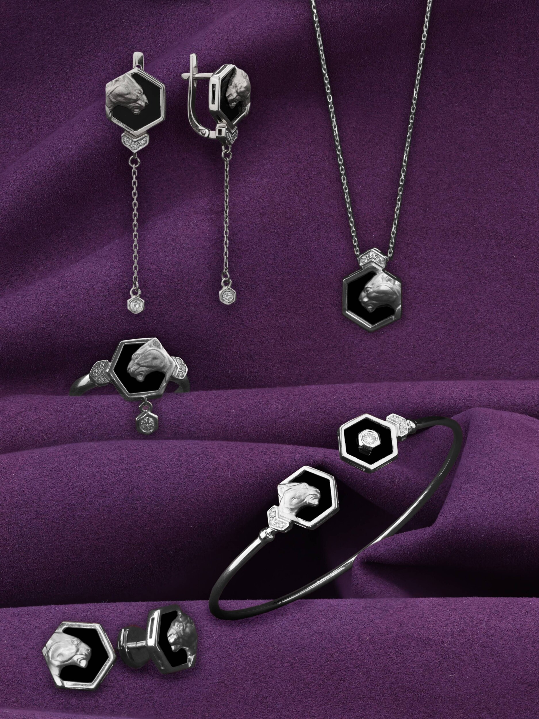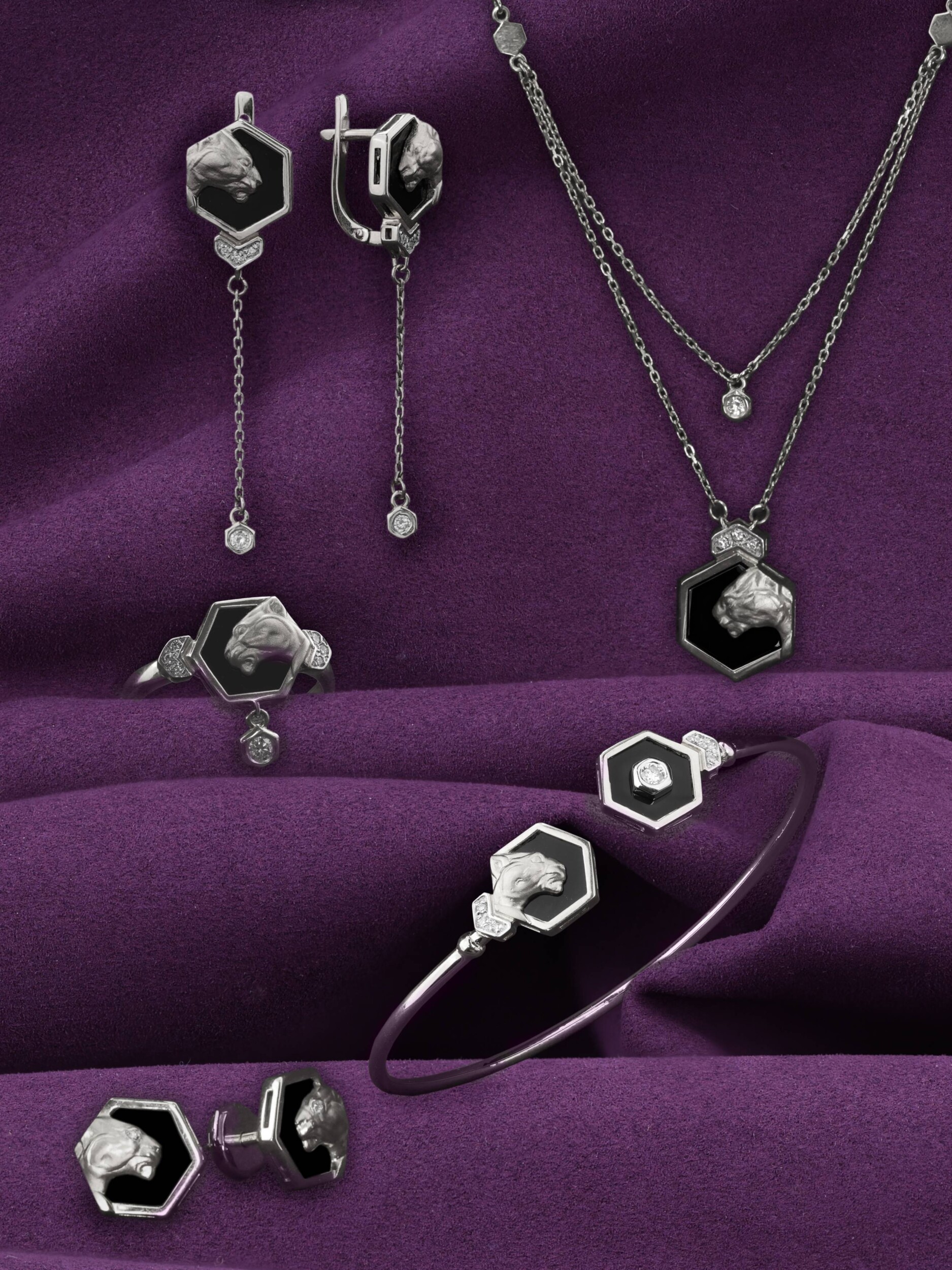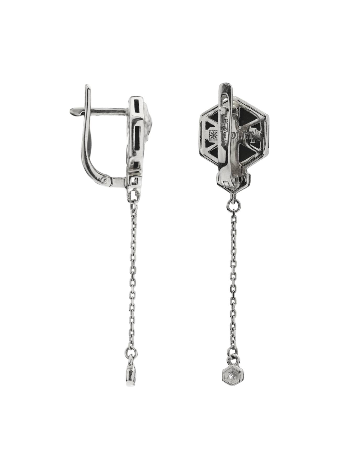 Серьги из белого золота 585 пробы из коллекции De Luxe — Гексагон представляют собой воплощение дерзкого дизайна и ювелирного мастерства. В центре композиции — выразительные головы пантер, выполненные из светлого металла, которые гармонично сочетаются с глубоким черным ониксом, имеющим форму шестигранника. Этот контрастный дуэт подчеркивает глубину каждого элемента и придает украшению статусный вид.