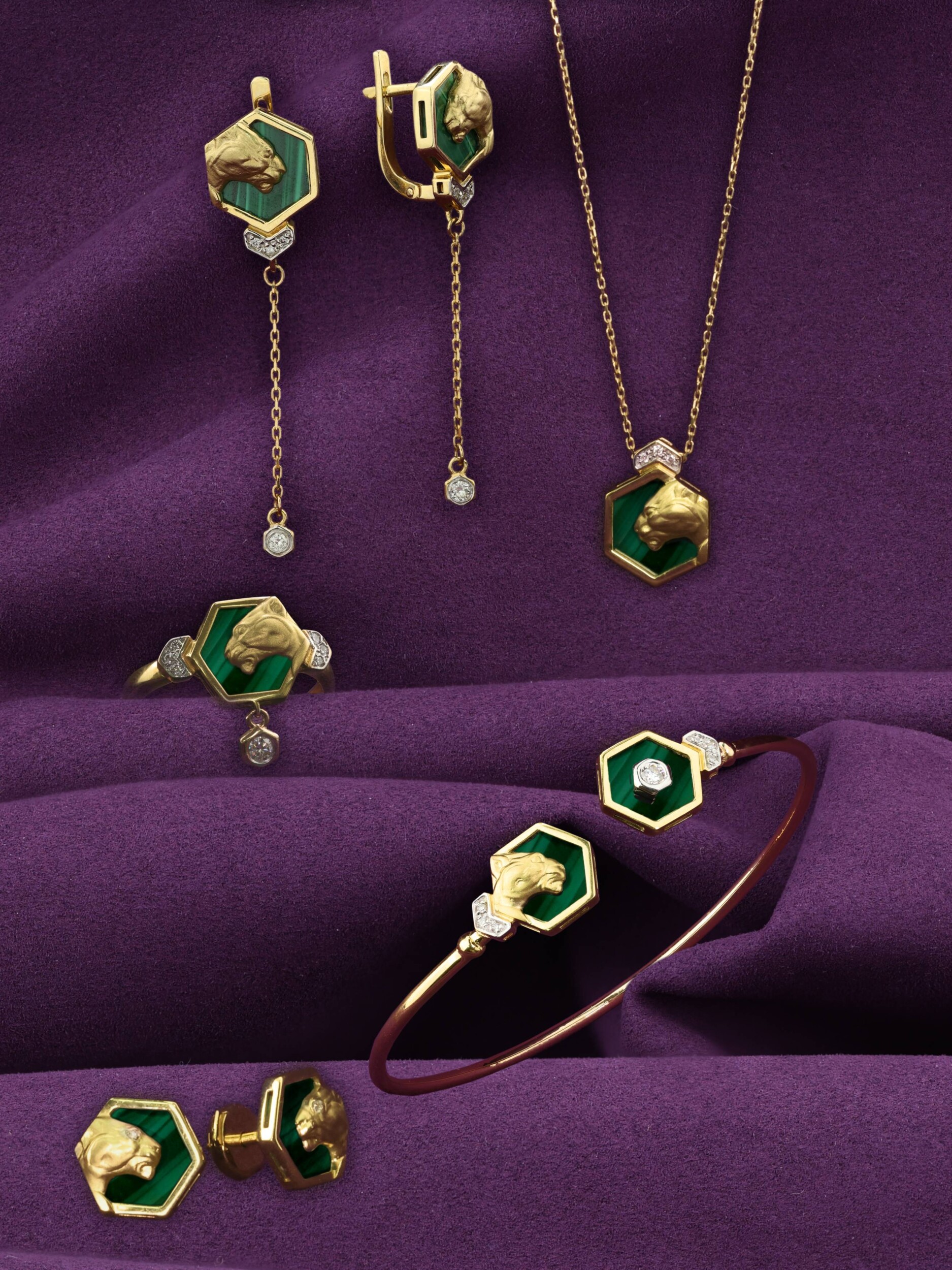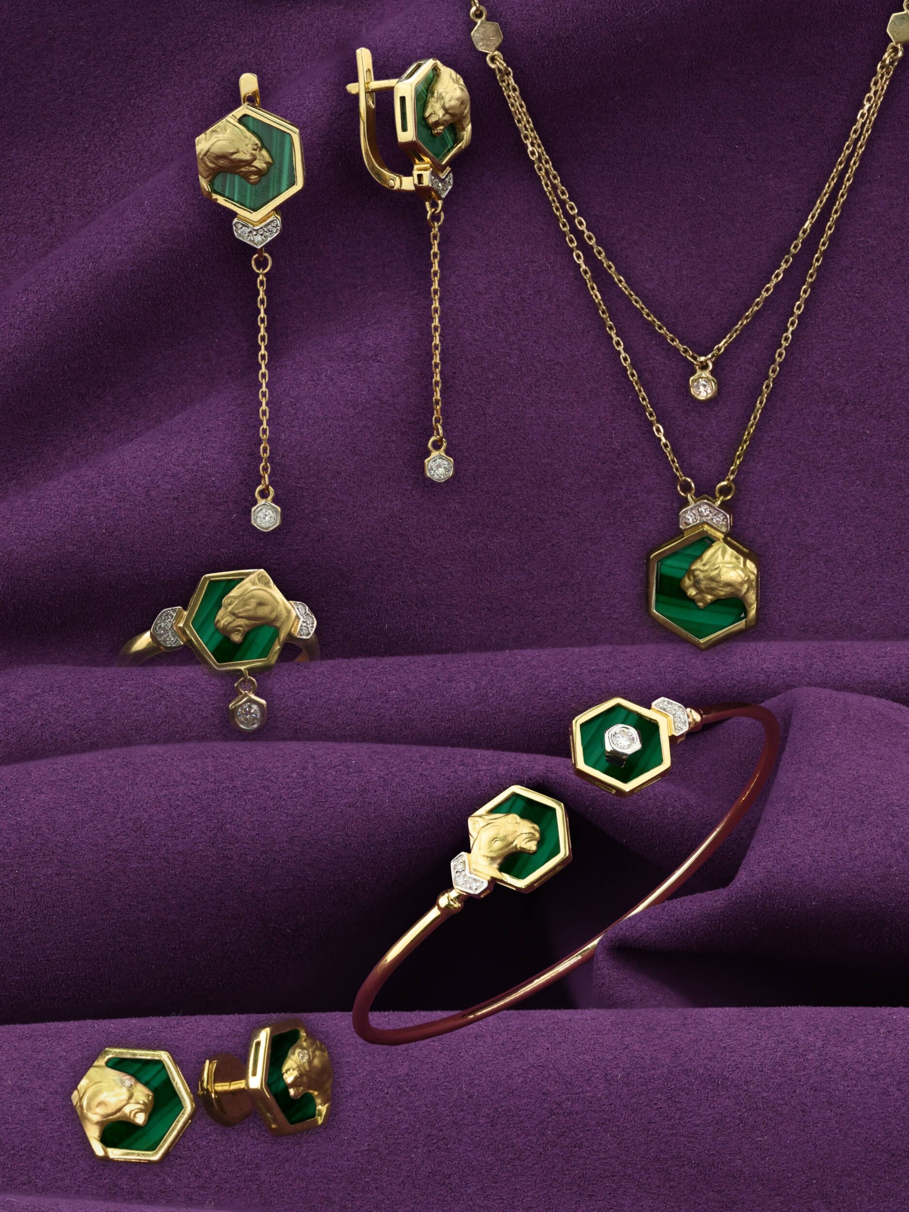 Серьги из лимонного золота 585 пробы из коллекции De Luxe — Гексагон представляют собой образец ювелирного искусства, сочетающий смелый дизайн и благородные материалы. Центральным элементом украшения является эффектный шестигранник из глубокого зелёного малахита, на фоне которого рельефно расположился образ грациозной пантеры. Литой дизайн с изображением пумы добавляет изделию характер и подчеркивает статус владельца.
