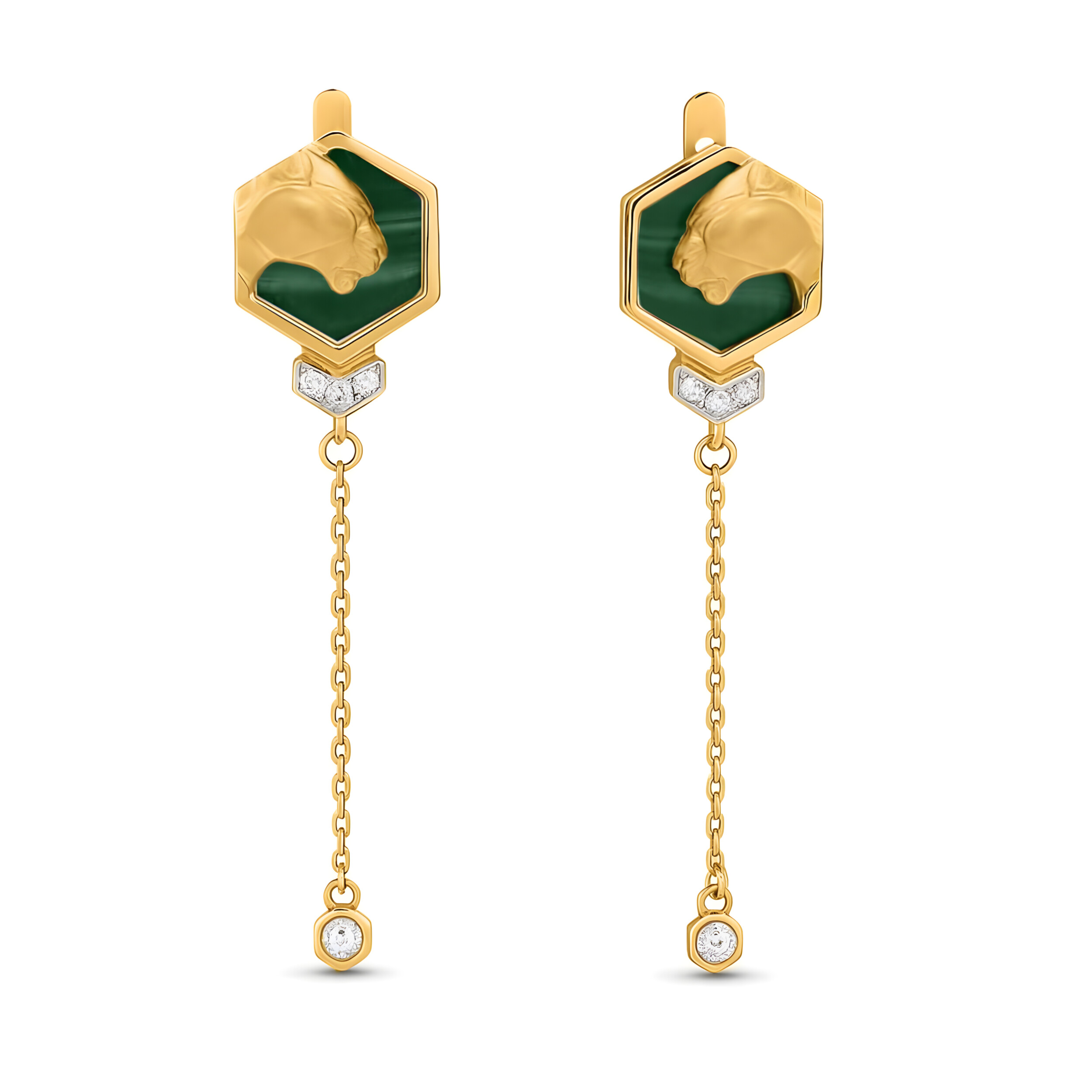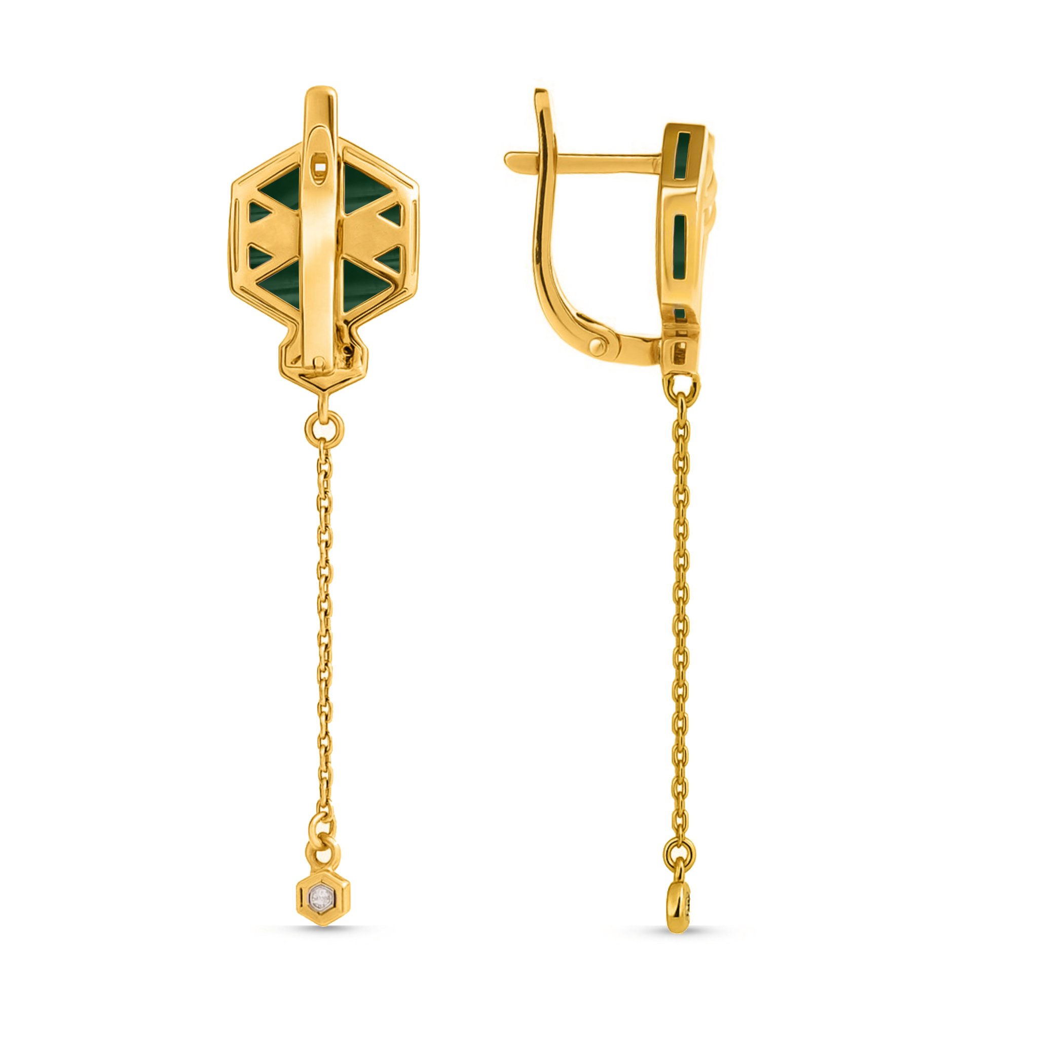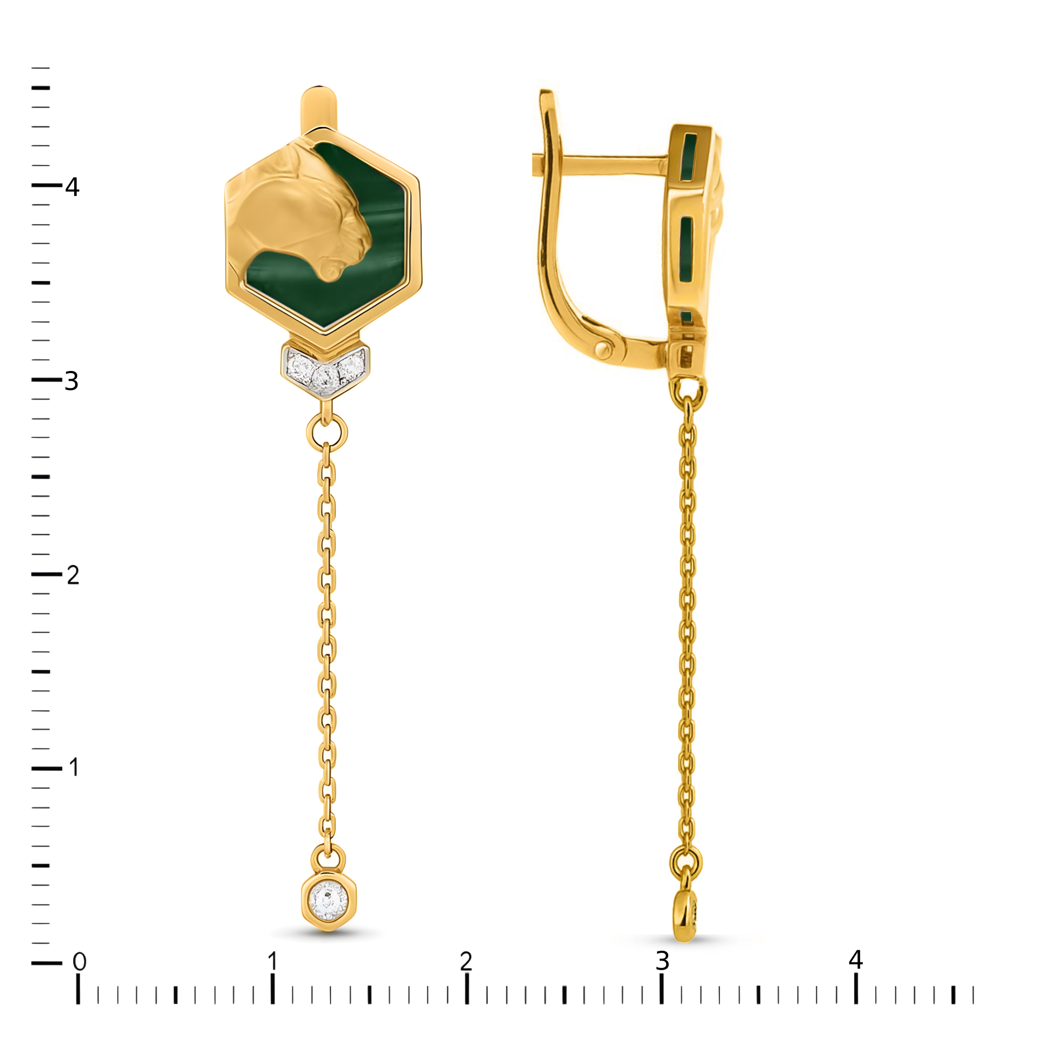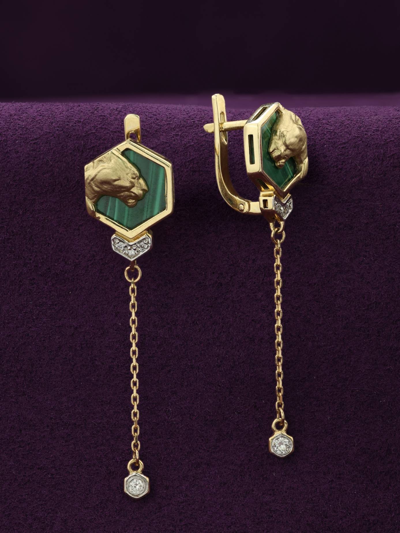 Конструкция дополнена подвижной цепочкой, на конце которой закреплен искрящийся белый бриллиант круглой формы. Всего в изделии использовано 10 вставок, которые создают завораживающую игру света при каждом движении. Лимонный оттенок золота гармонично контрастирует с природным узором малахита и блеском драгоценных камней, делая эти серьги выразительным аксессуаром как для женщин, так и для мужчин, предпочитающих статусные украшения.