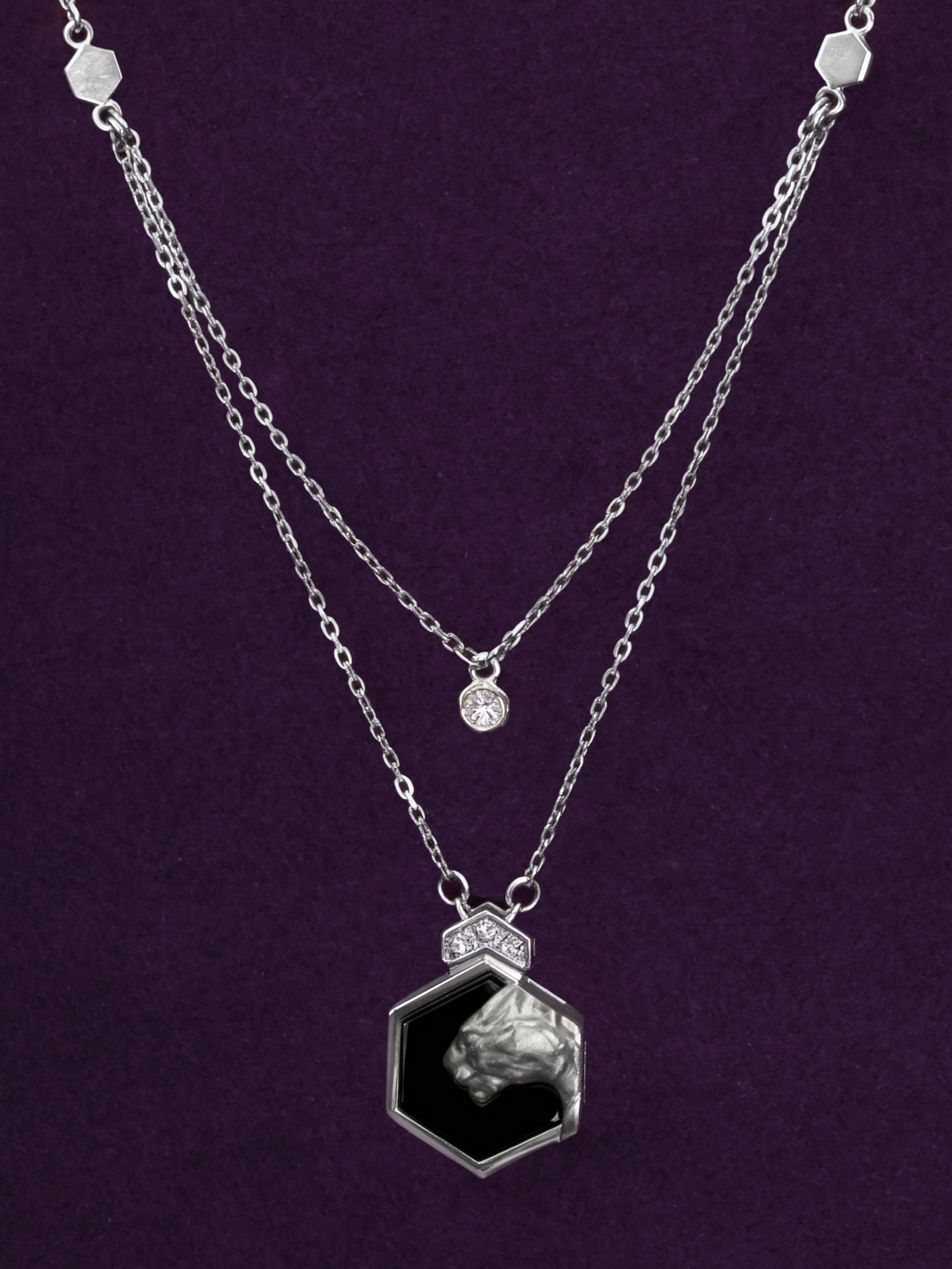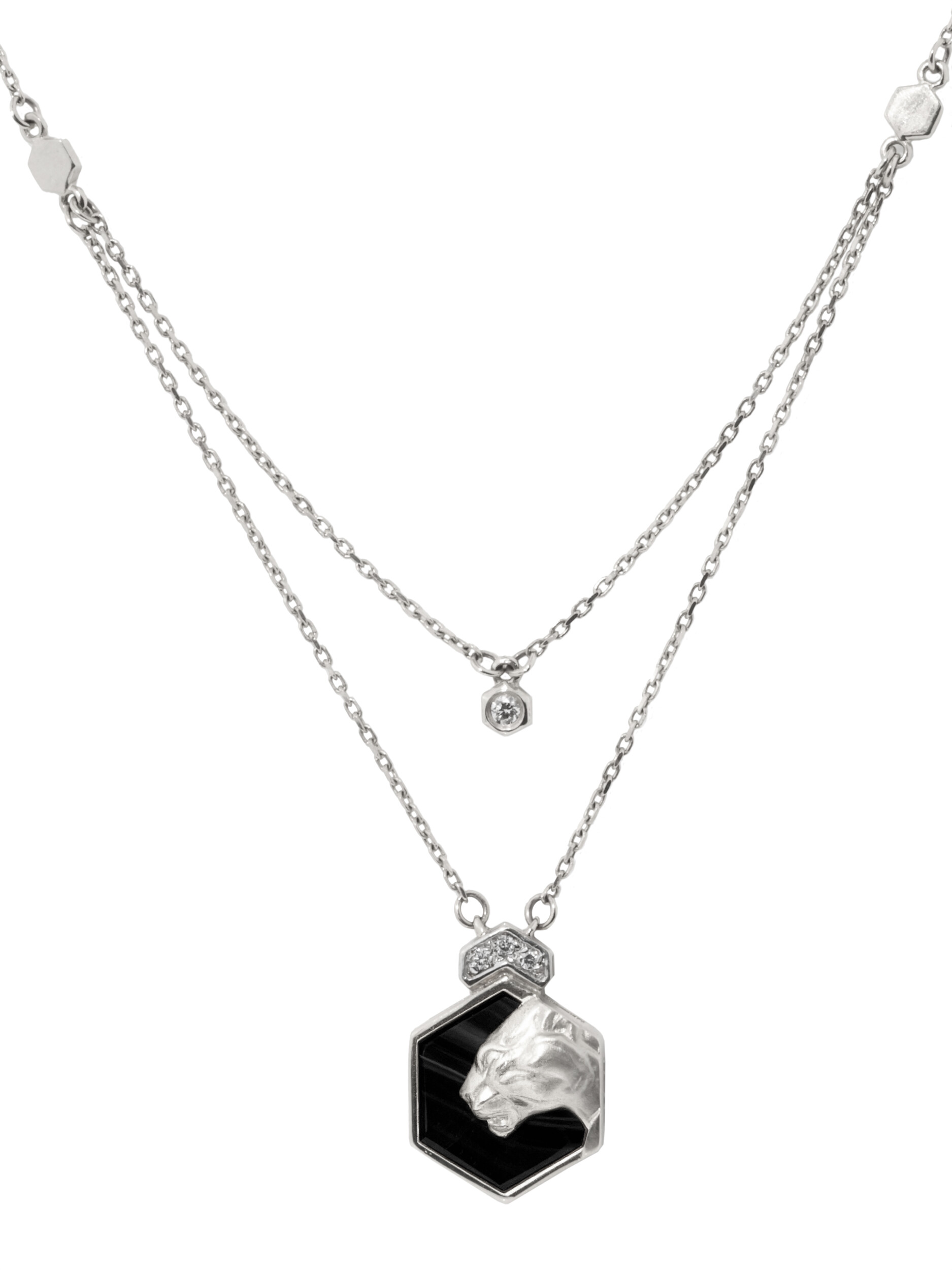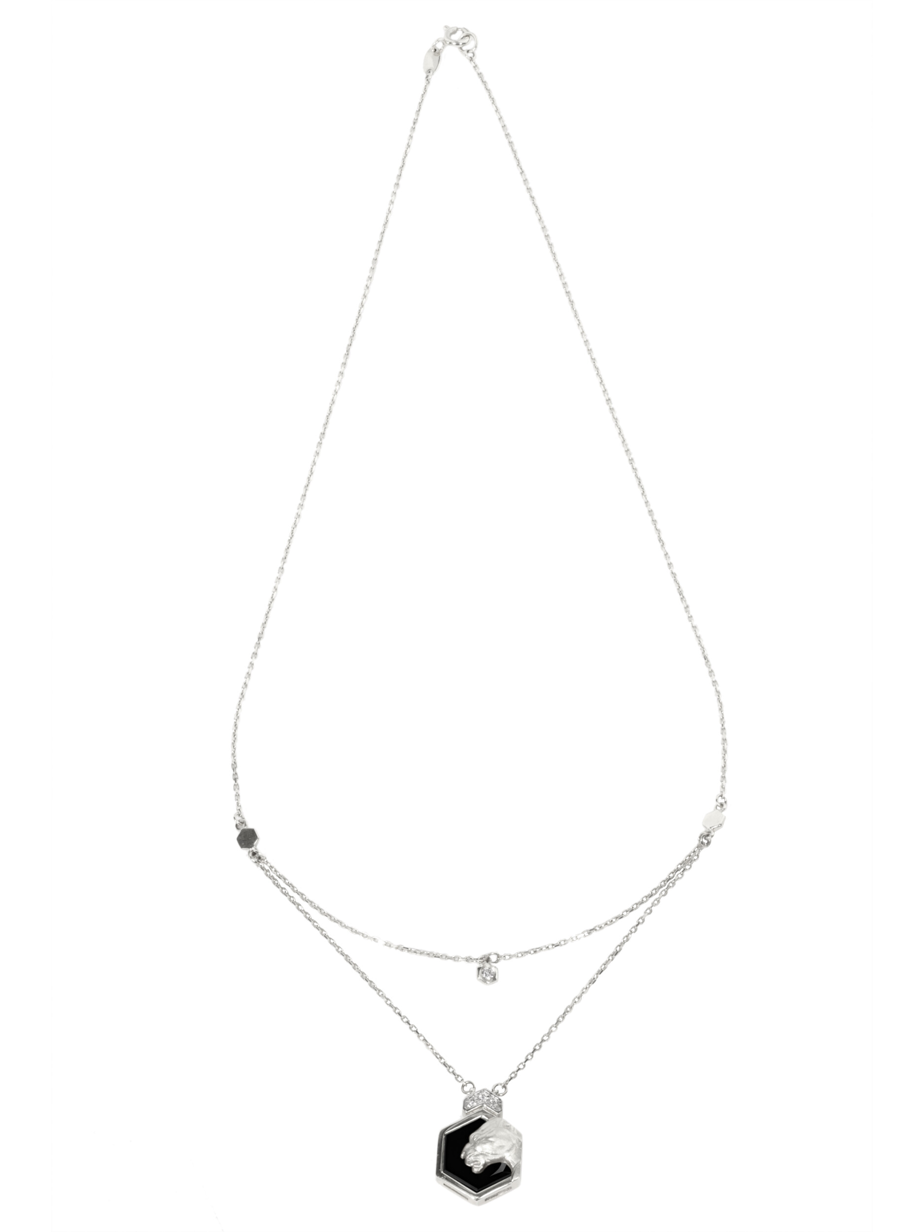 Центральный элемент композиции выполнен в форме шестигранника, внутри которого расположена вставка из оникса. В дополнение к нему в колье инкрустировано 5 вставок: сияющие бриллианты круглой формы подчеркивают роскошь изделия и добавляют ему благородного блеска. Многослойная структура цепи придает украшению динамику и делает его заметным аксессуаром.