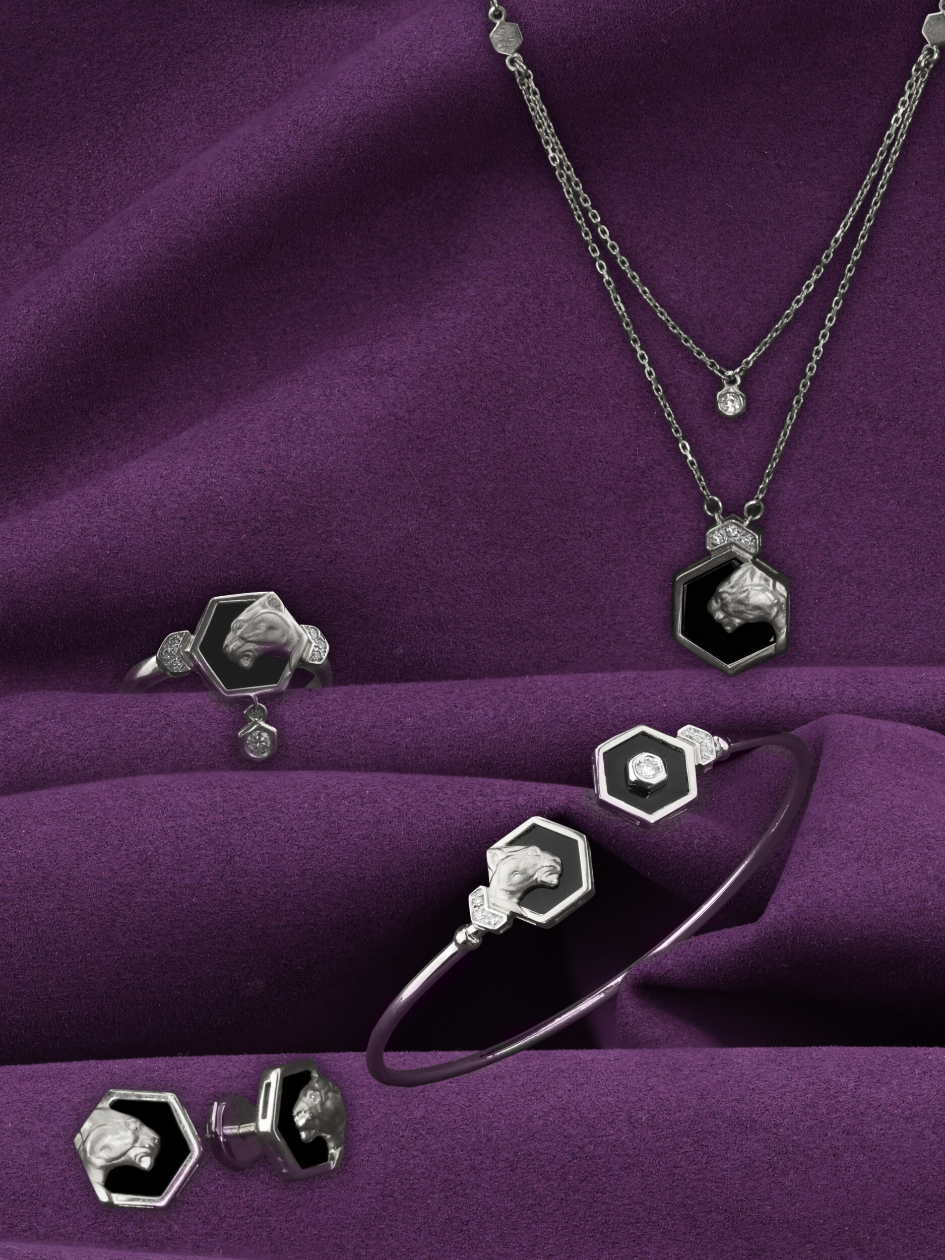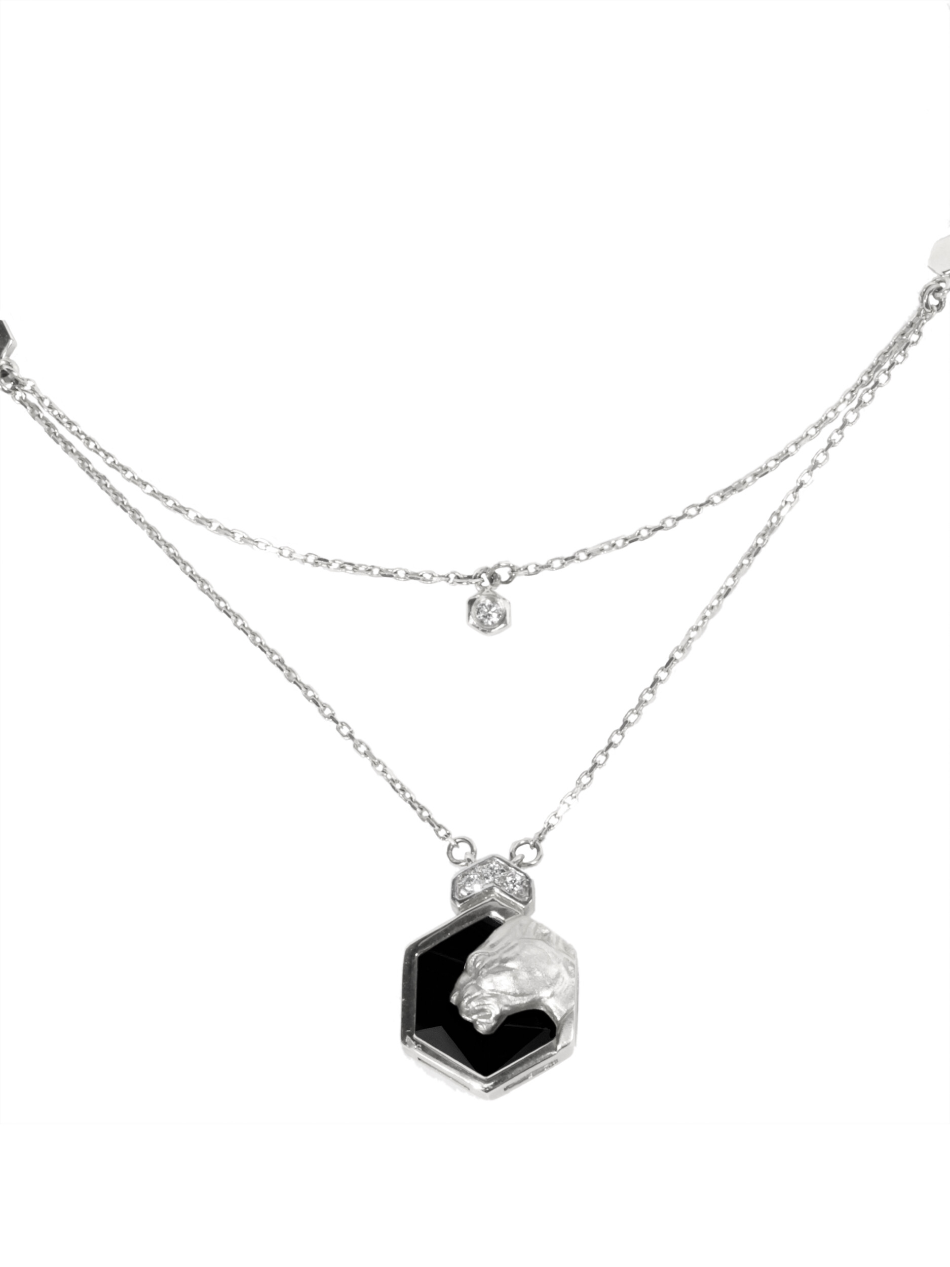 Изысканное колье из белого золота 585 пробы из коллекции De Luxe — Гексагон станет безупречным акцентом вашего образа. Дизайн украшения воплощает в себе грацию и мощь дикой природы, демонстрируя стилизованный образ пантеры, который притягивает взгляд своей утонченностью. Гармоничное сочетание холодного блеска белого металла с глубоким черным цветом оникса создает роскошный контраст, подчеркивающий статус и вкус владельца.