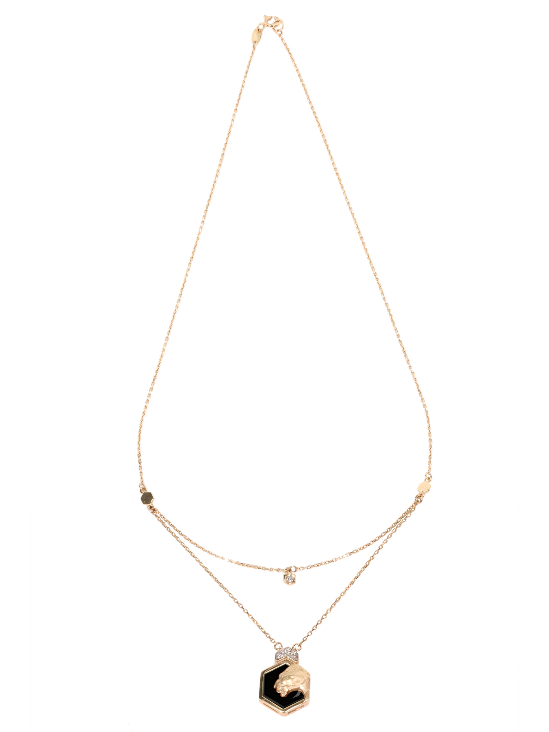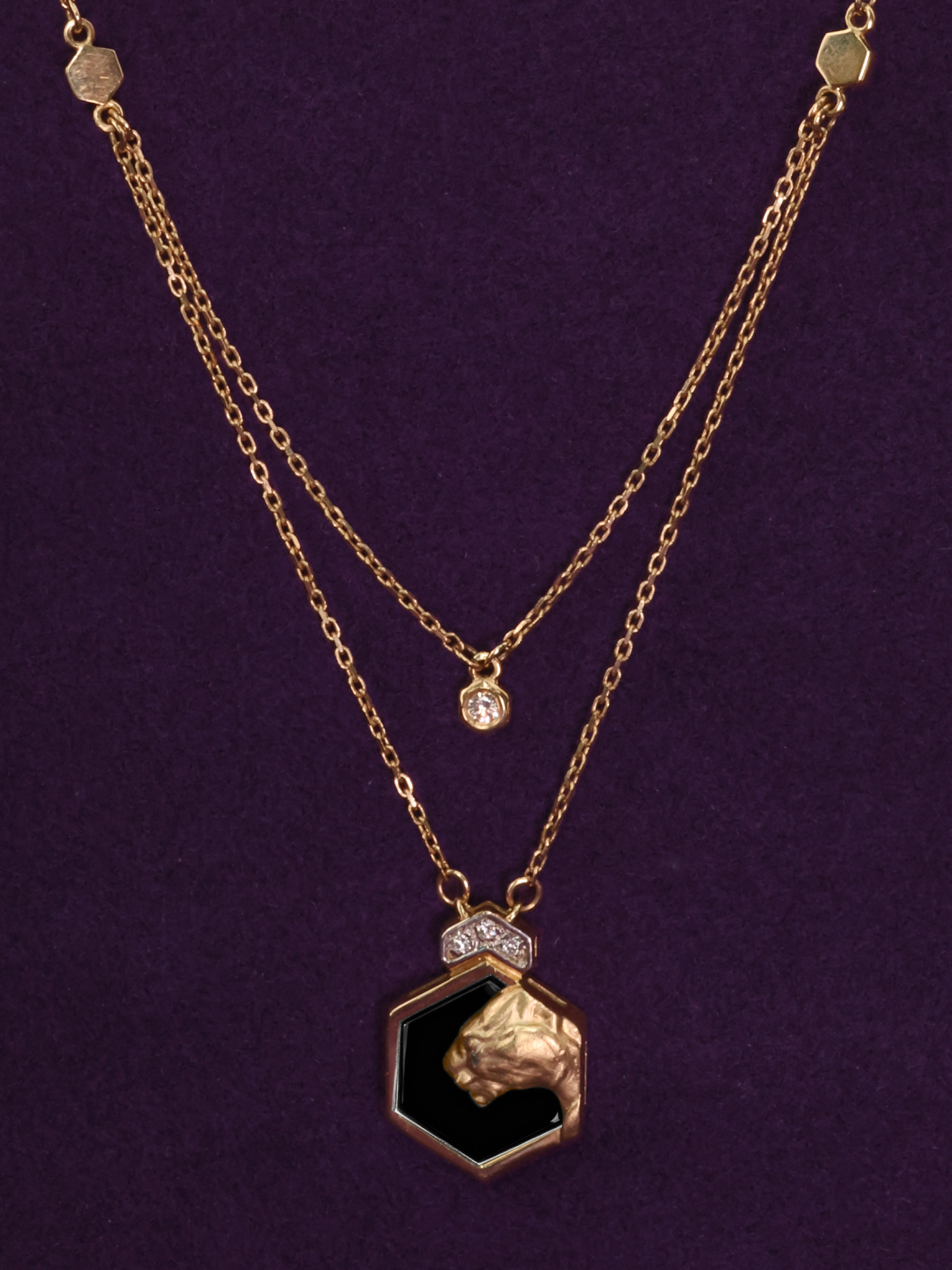 Эффектное колье из красного золота 585 пробы из коллекции De Luxe — Гексагон станет безупречным акцентом вашего образа. Дизайн украшения, вдохновленный грацией диких кошек, объединяет в себе смелую эстетику и премиальные материалы. Центральным элементом изделия является подвеска в форме шестигранника, внутри которой гармонично расположился черный оникс. На этом контрастном фоне размещен рельефный образ головы пантеры, выполненный из красного золота, что придает колье особую выразительность и глубину.