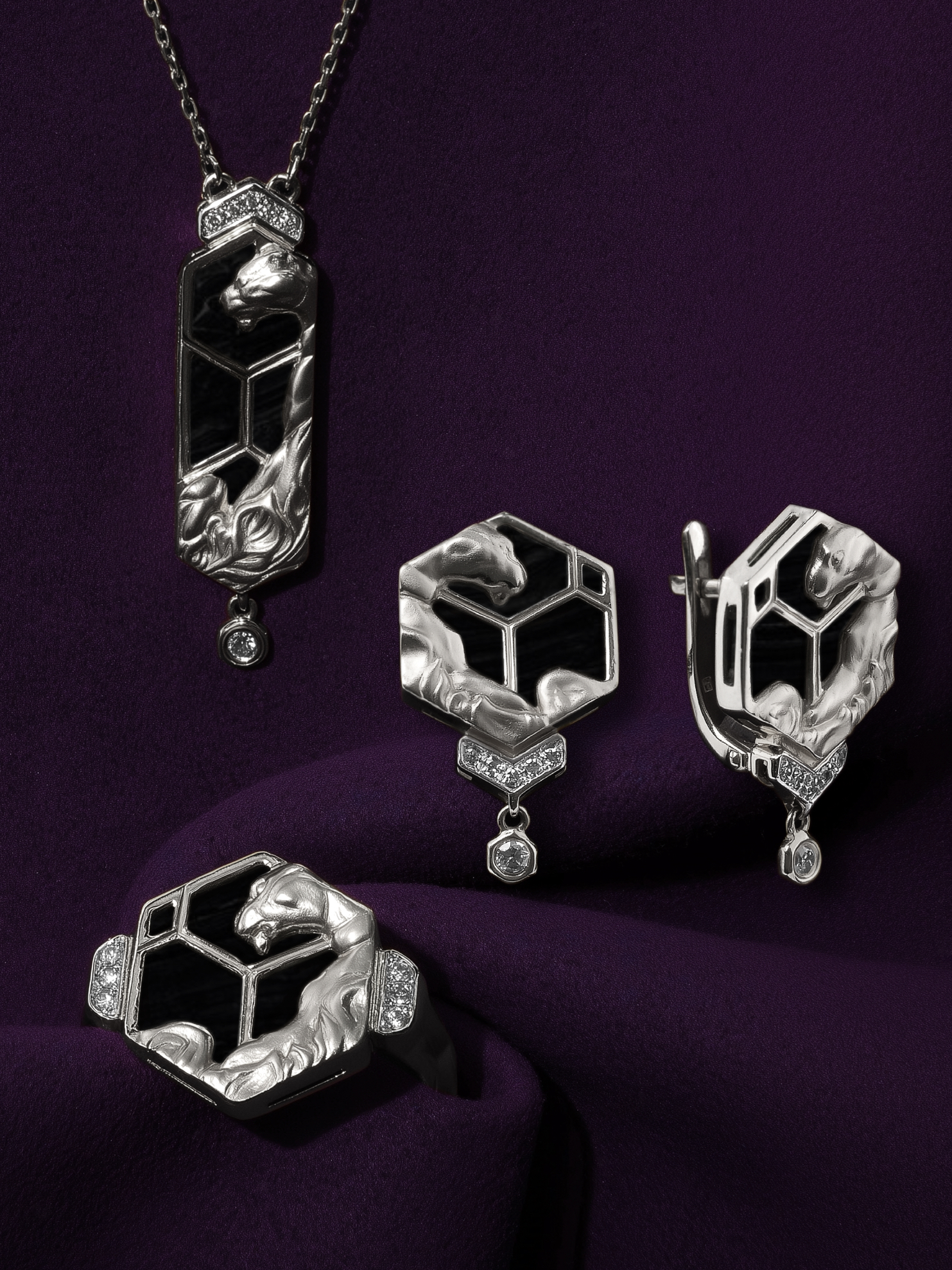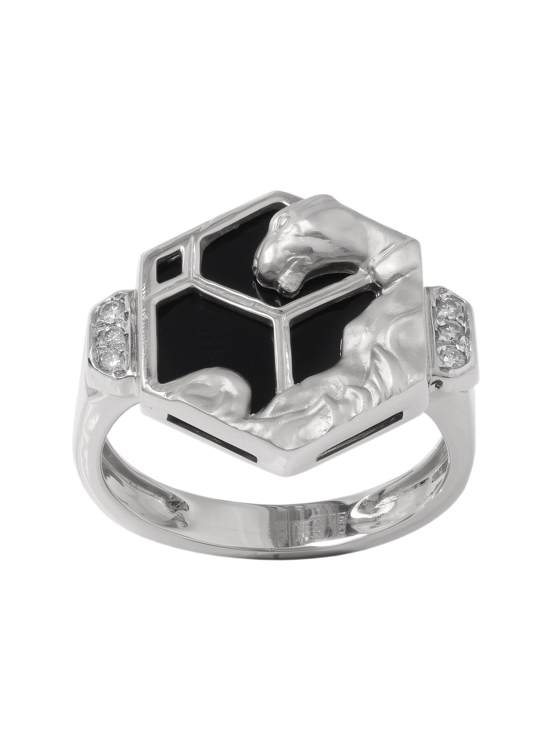 Кольцо из белого золота 585 пробы из коллекции De Luxe — Гексагон — это воплощение смелого дизайна и безупречного стиля. В центре композиции находится декоративный элемент в форме шестигранника, украшенный глубоким черным ониксом. Эффектный образ дополняет искусная фигура пантеры, выполненная из белого золота, которая придает украшению динамику и характер. Ювелиры гармонично сочетали контрастные цвета вставок: глубокий черный оникс и искрящиеся белые бриллианты.