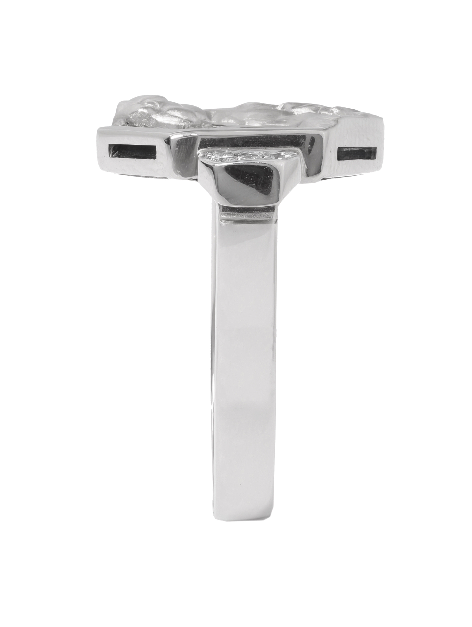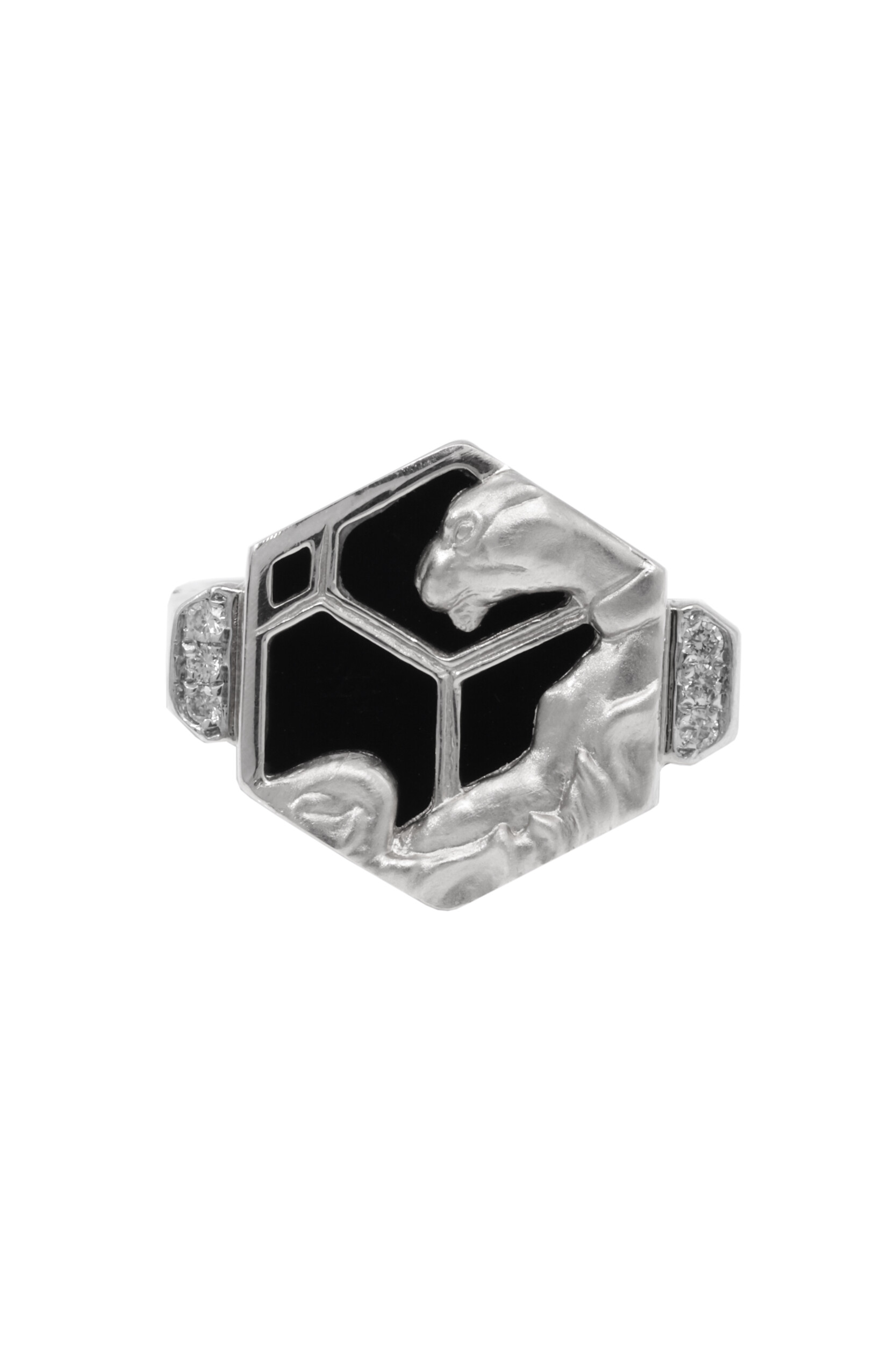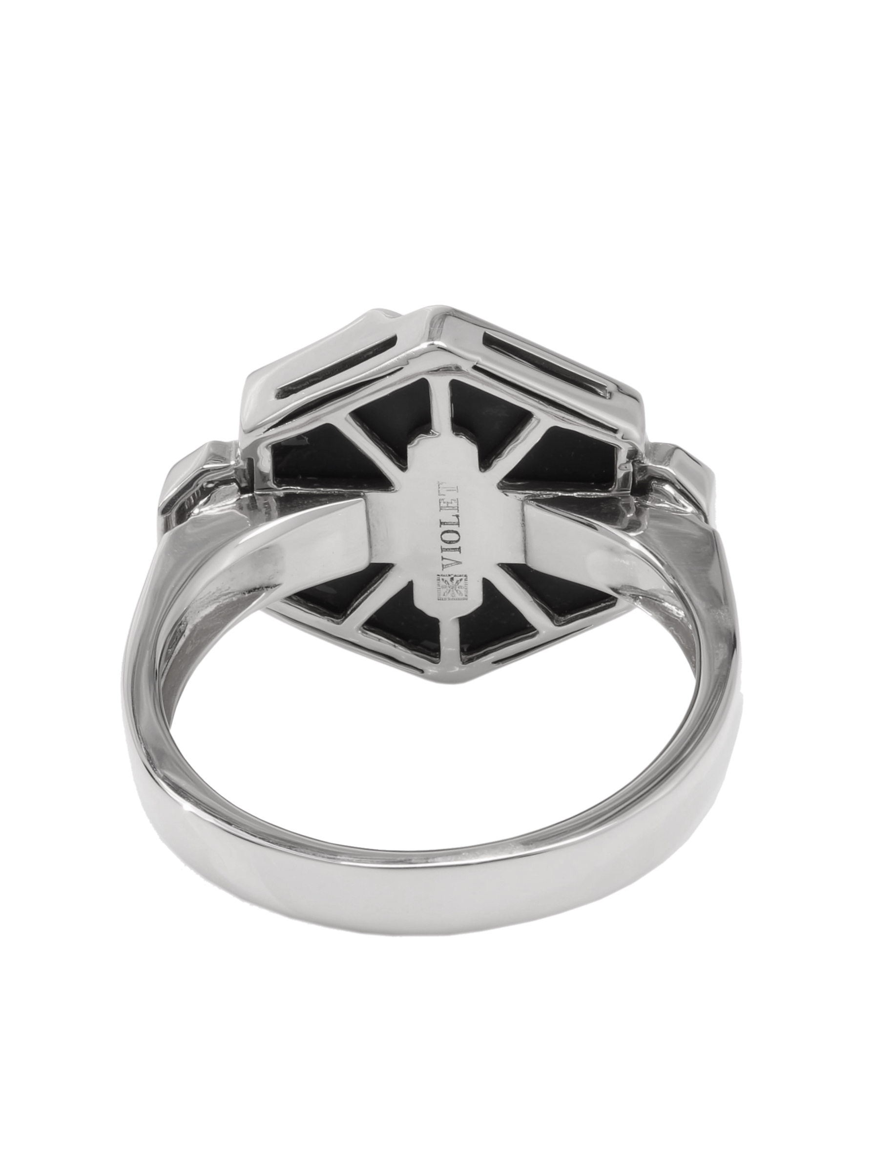 Всего в изделии использовано 7 вставок разной формы — круглые бриллианты и геометричный шестигранник оникса, создающие завораживающую игру света на металле. Благодаря выразительному исполнению, это кольцо станет акцентным аксессуаром как для женщин, так и для мужчин, предпочитающих премиальные украшения. Изделие органично смотрится самостоятельно, но при желании может стать частью ювелирного комплекта.