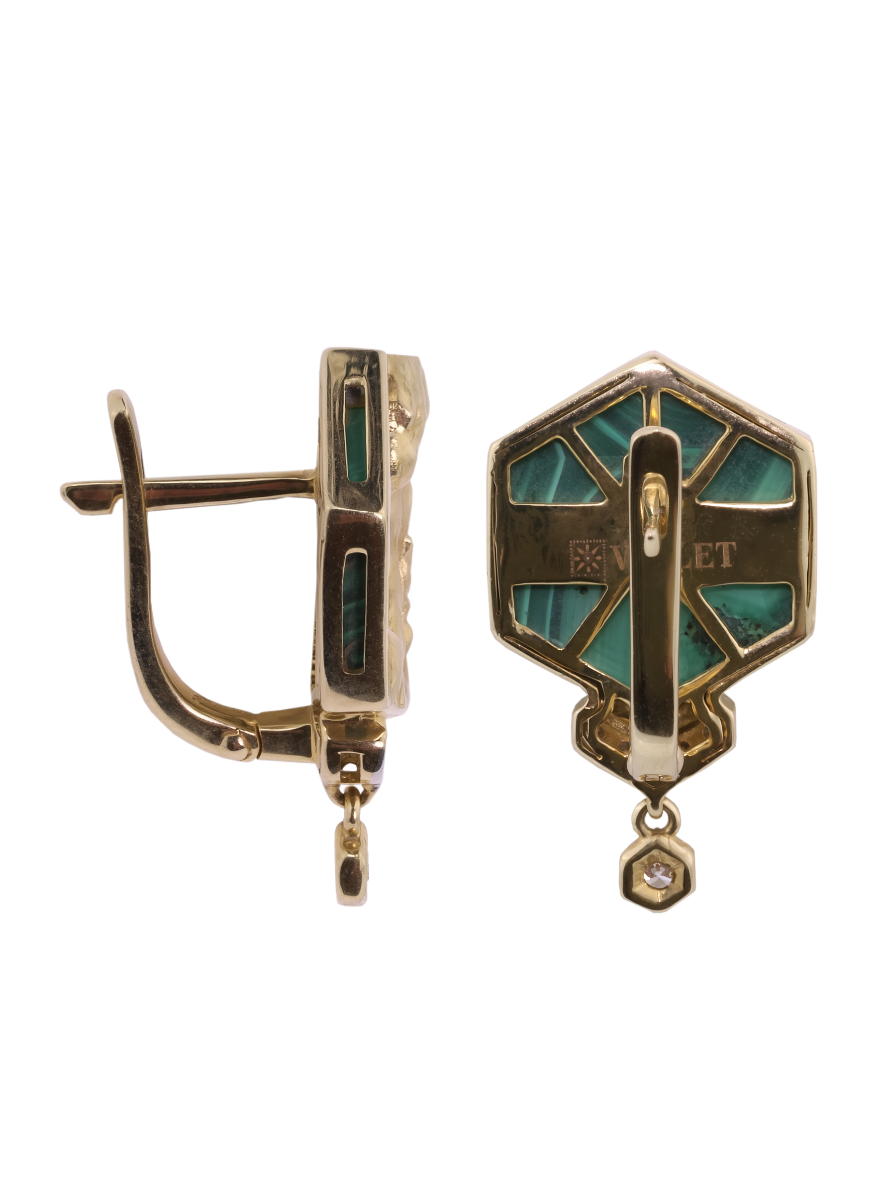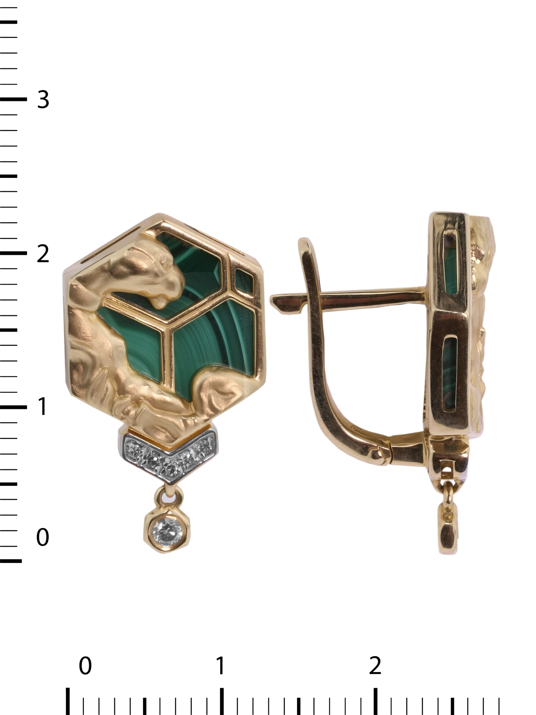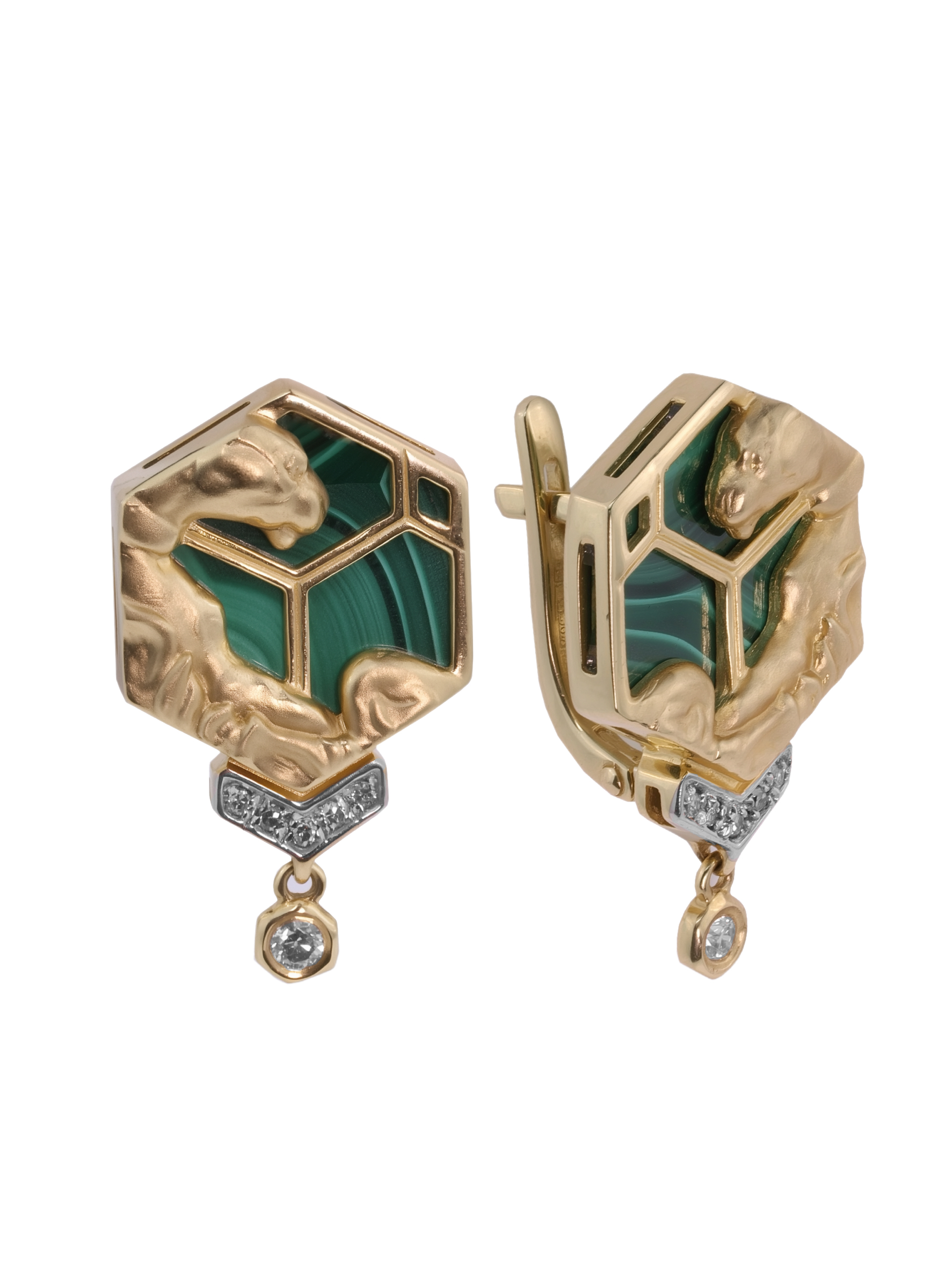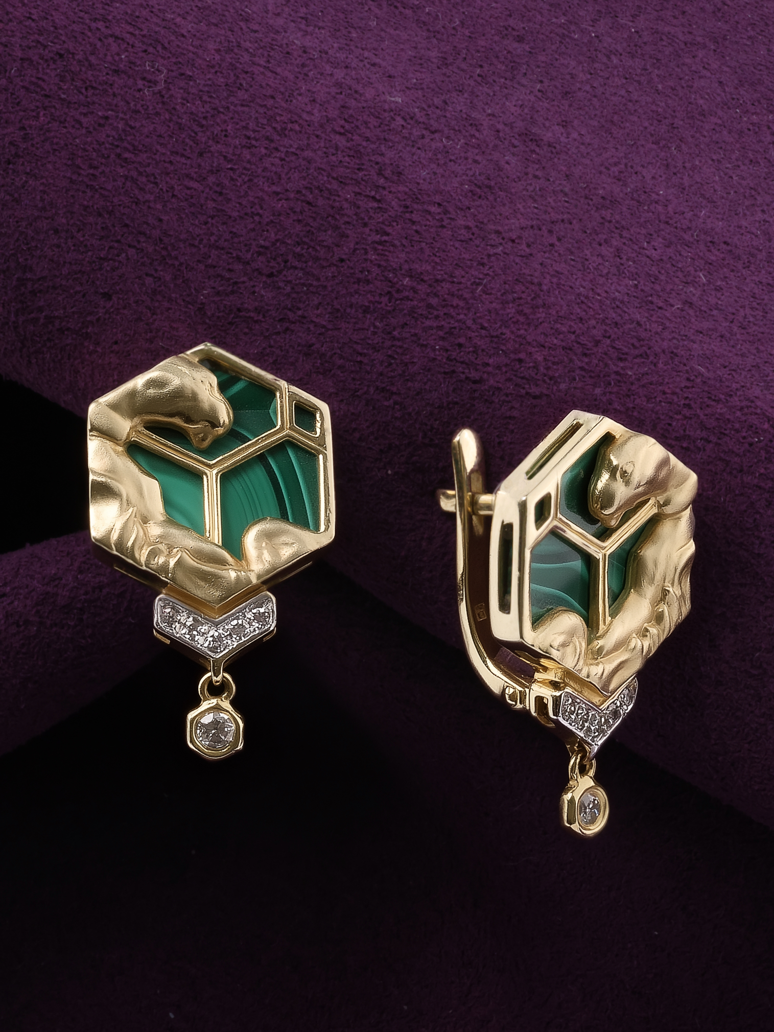 Центральным элементом композиции является вставка из малахита насыщенного зелёного цвета, ограненная в форме шестигранника, что подчеркивает геометрическую эстетику всей линии. Контраст благородного лимонного золота и глубокого оттенка малахита дополняется сиянием 14 бриллиантов белого цвета круглой формы, которые мягко обрамляют основную часть изделия и создают эффектное мерцание при каждом движении. Продуманный дизайн позволяет этим серьгам гармонично дополнить как женский, так и мужский образ, подчеркивая индивидуальность владельца.
