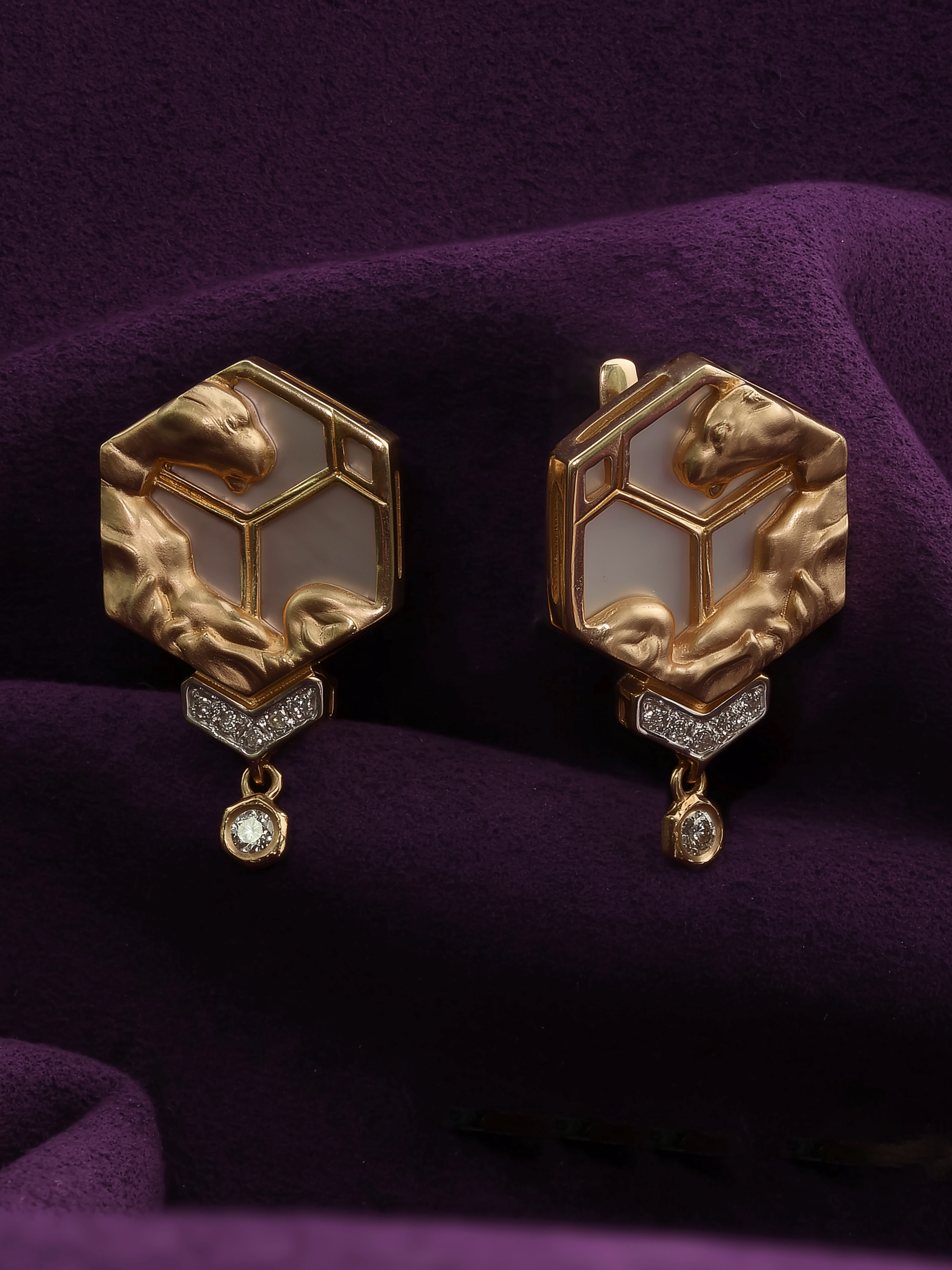 Особое внимание привлекает детальная проработка дизайна: искусная фигура пантеры, обнимающая основание, придает украшению хищную грацию и особый статус. Общая композиция включает 12 вставок, среди которых сияющие бриллианты круглой огранки, расставляющие яркие акценты. Эти серьги сочетают в себе эстетику дикой природы и строгую геометрию, что делает их универсальным выбором как для женщин, так и для мужчин.