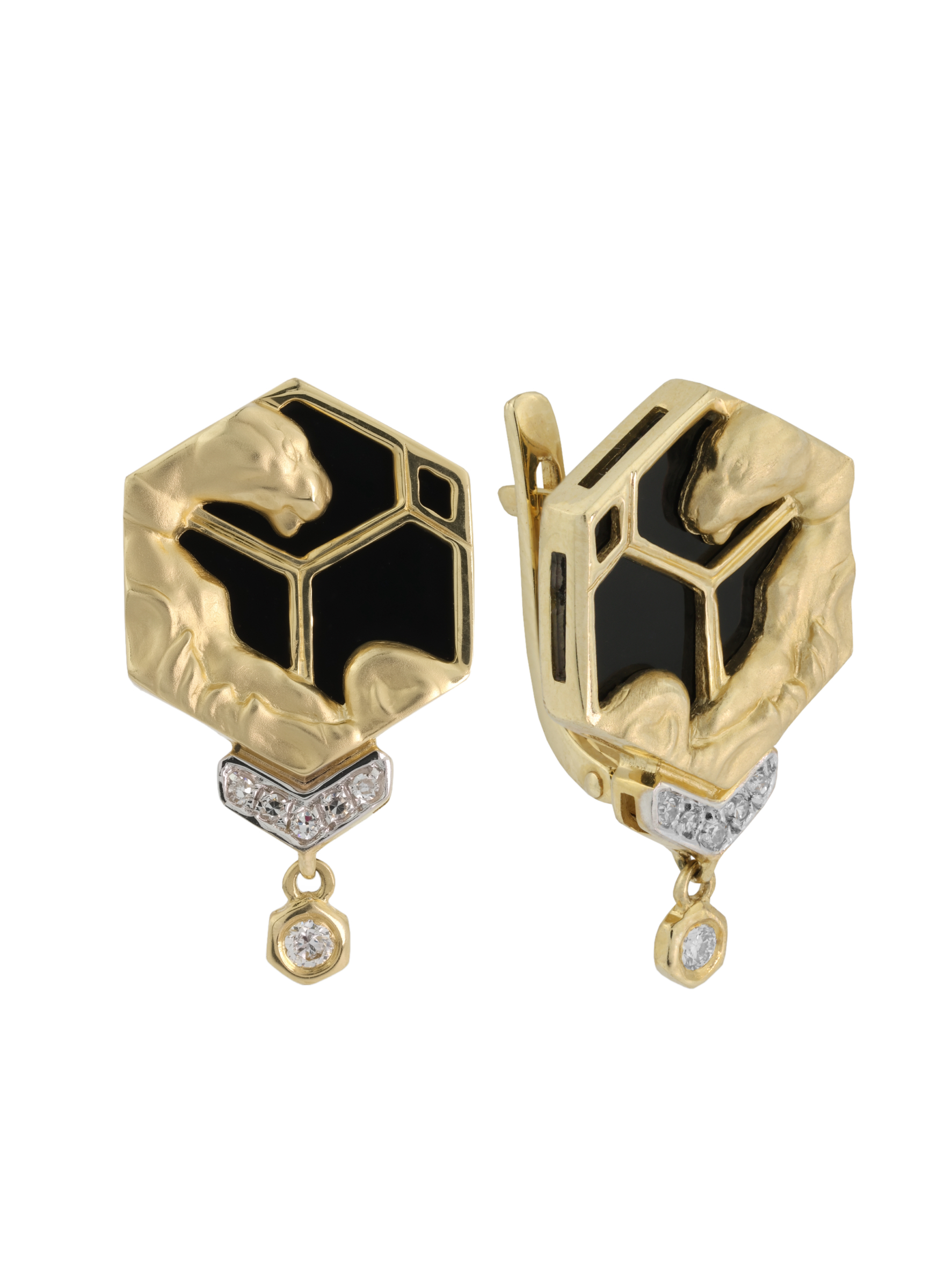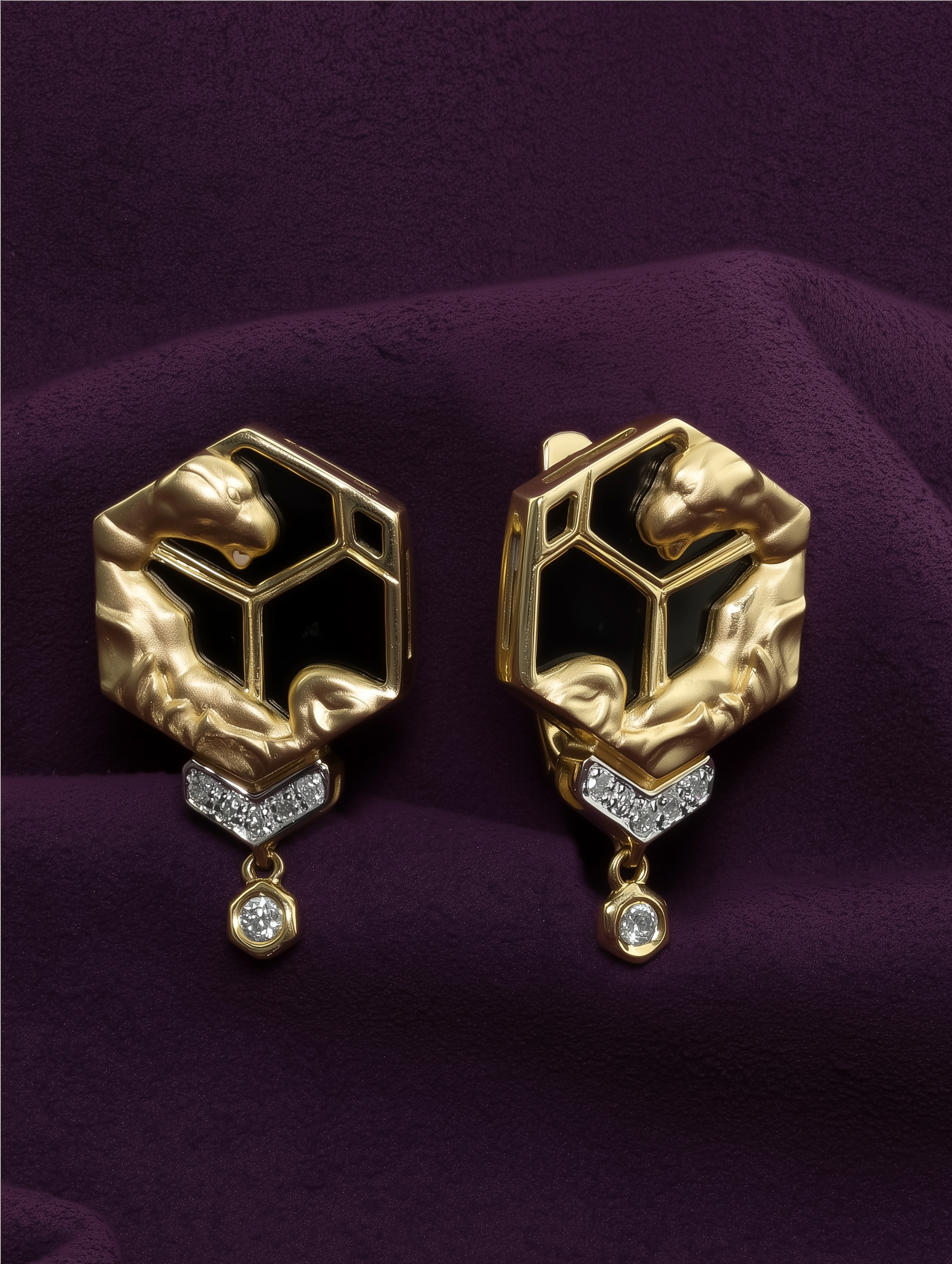 Эти серьги из коллекции De Luxe — Гексагон представляют собой смелое сочетание ювелирного мастерства и современного дизайна. Украшение выполнено из лимонного золота 585 пробы, чей мягкий, теплый оттенок идеально подчеркивает контраст вставок. Центральным элементом композиции стали вставки из глубокого черного оникса шестигранной формы, которые обрамлены искусными фигурками пантер. Грациозные силуэты хищников, выполненные из золота, словно охраняют драгоценную геометрию изделия.