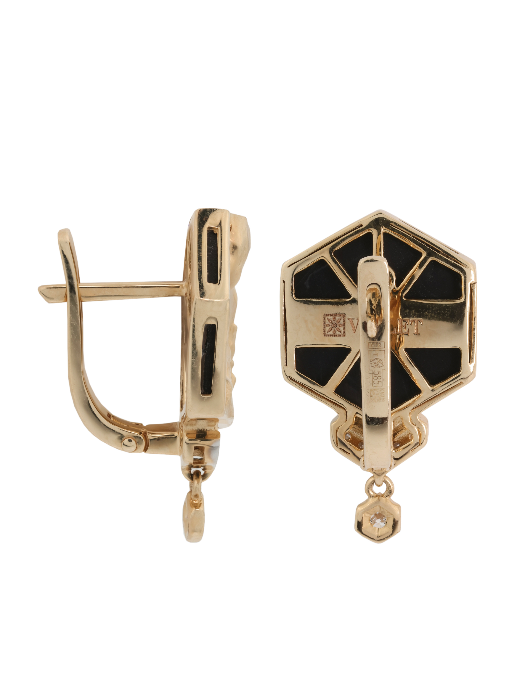 Серьги из красного золота 585 пробы из коллекции De Luxe — Гексагон представляют собой воплощение дерзкого стиля и ювелирного мастерства. В дизайне украшения центральное место занимает анималистичный мотив в виде грациозных пантер, которые изящно обрамляют вставку из глубокого черного оникса. Геометрическая форма шестигранника придает изделию современный и узнаваемый облик, объединяя строгость линий и природную эстетику.
