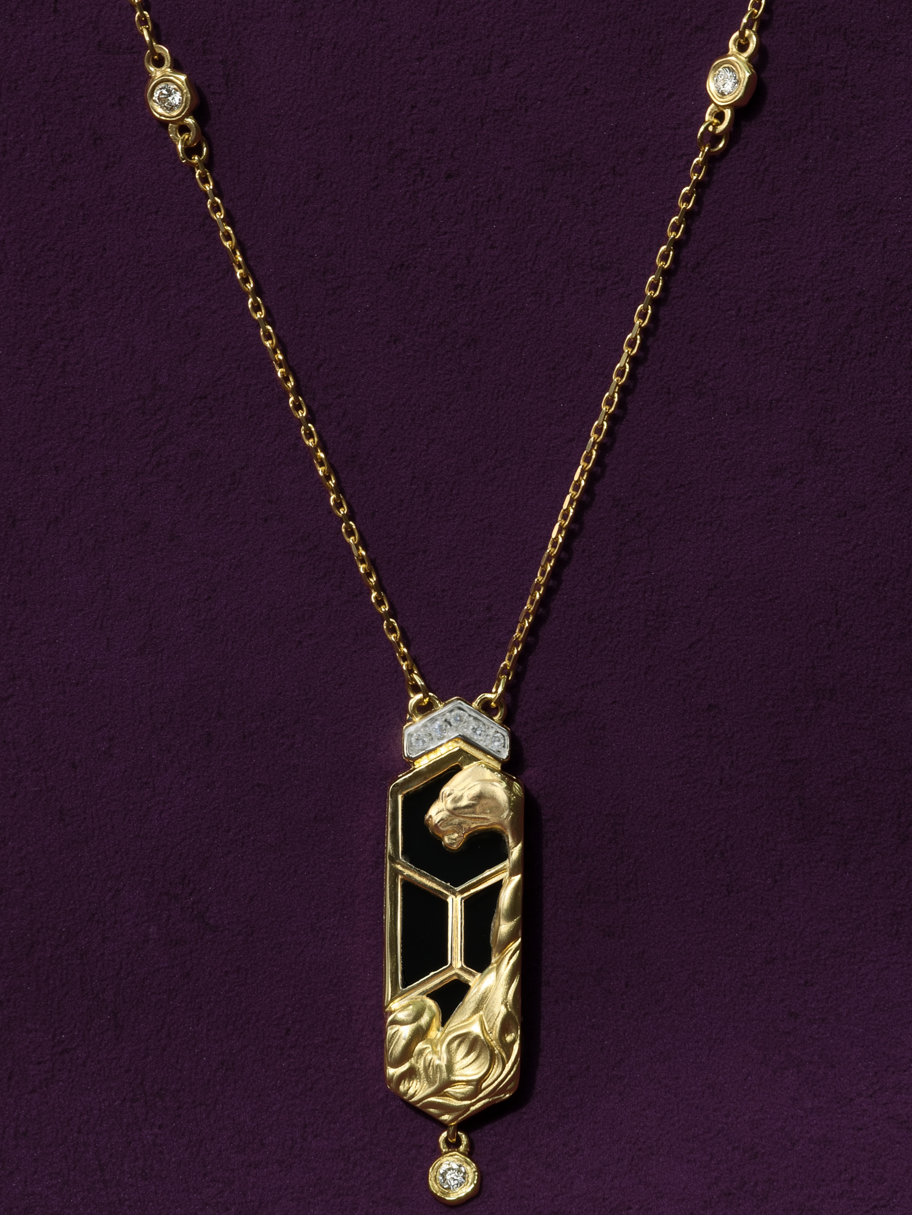 Изысканное колье из лимонного золота 585 пробы станет центральным акцентом вашего образа, подчеркивая статус и безупречный вкус. Данное украшение, представленное в коллекции De Luxe — Гексагон, выполнено в концептуальном дизайне с элементами пантеры и пумы, что придает ему особенный характер и выразительность. В центре композиции находится благородный черный оникс, который эффектно контрастирует с теплым сиянием лимонного золота.