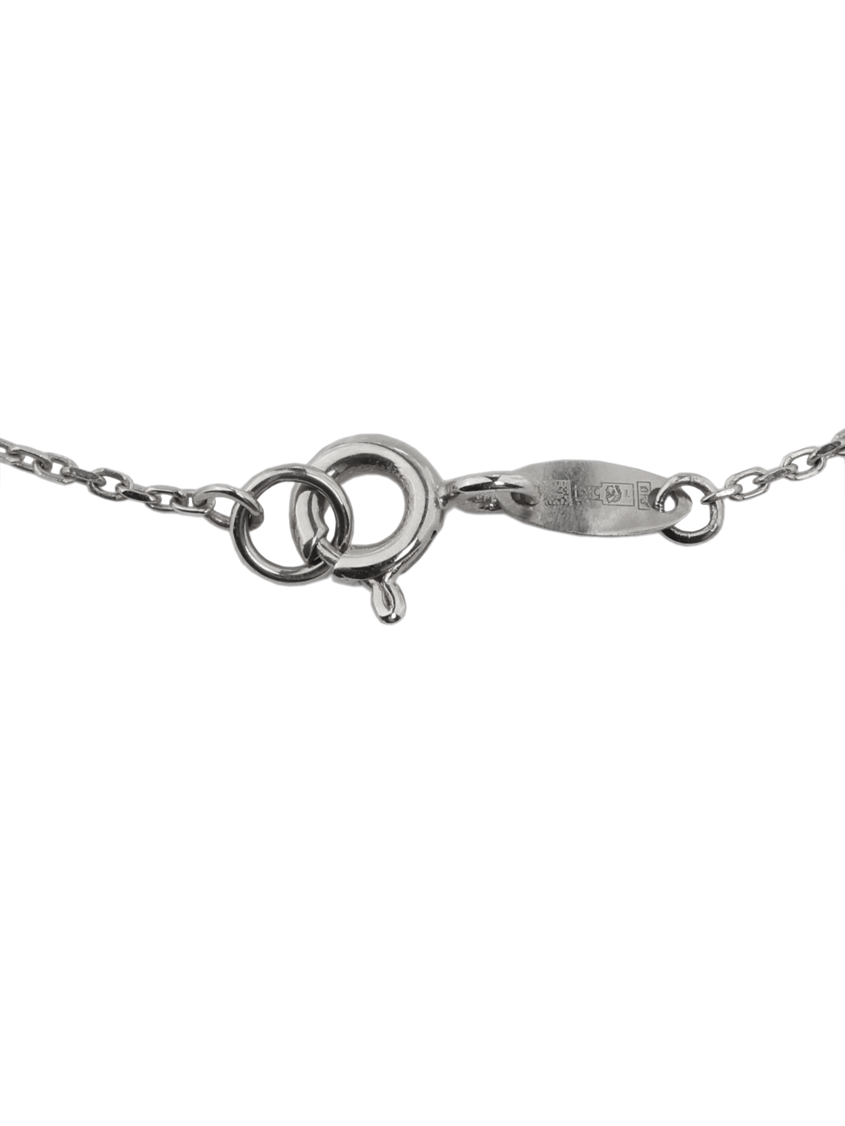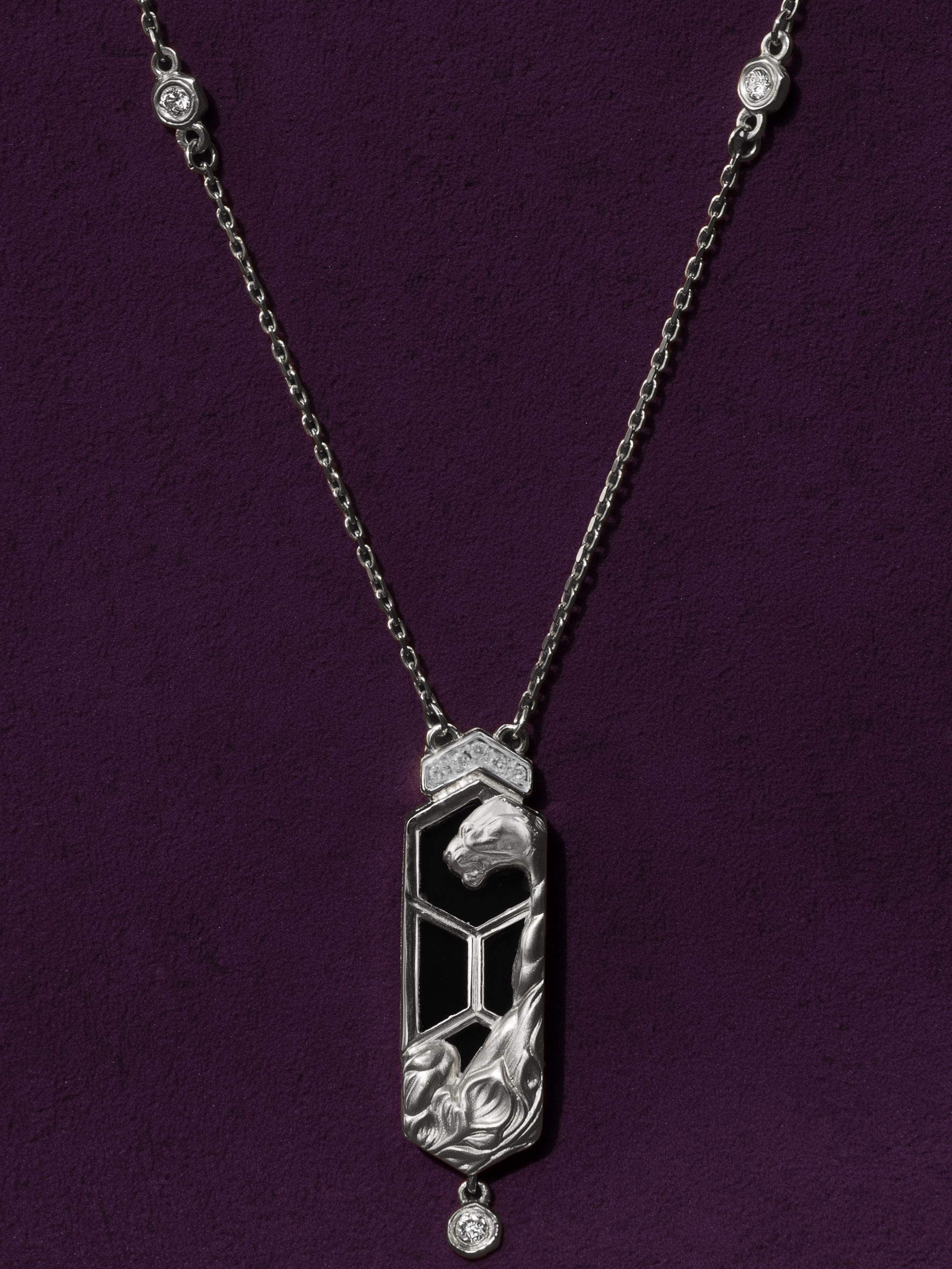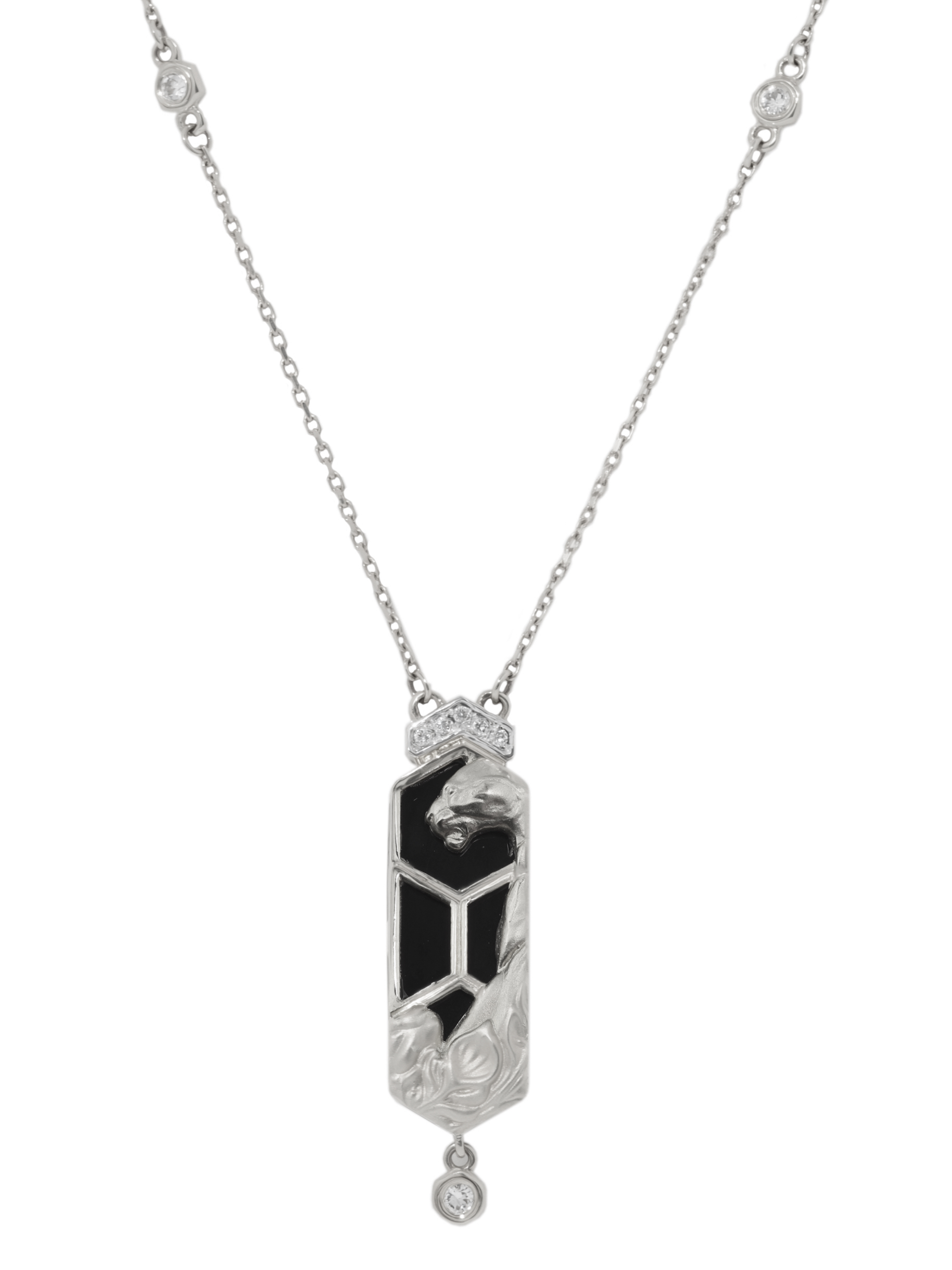 Ювелирная композиция дополнена контрастными вставками: благородный черный оникс шестигранной формы эффектно выделяется на фоне белого золота. Изысканность украшения подчеркивают 18 вставок, среди которых сияющие белые бриллианты круглой формы, рассыпанные по декору и цепочке. Такая игра света и текстур делает это колье заметным и статусным дополнением вашего образа.