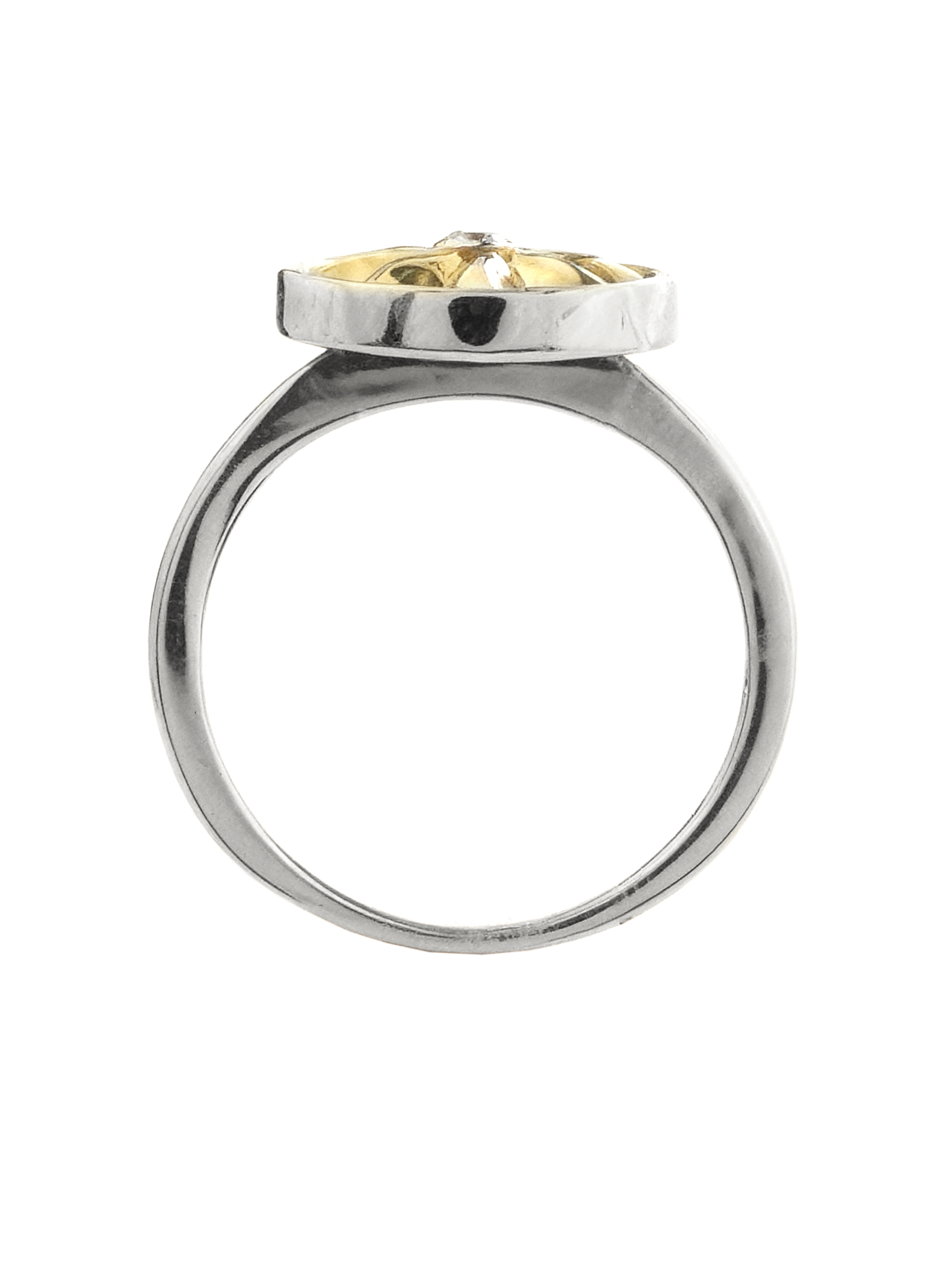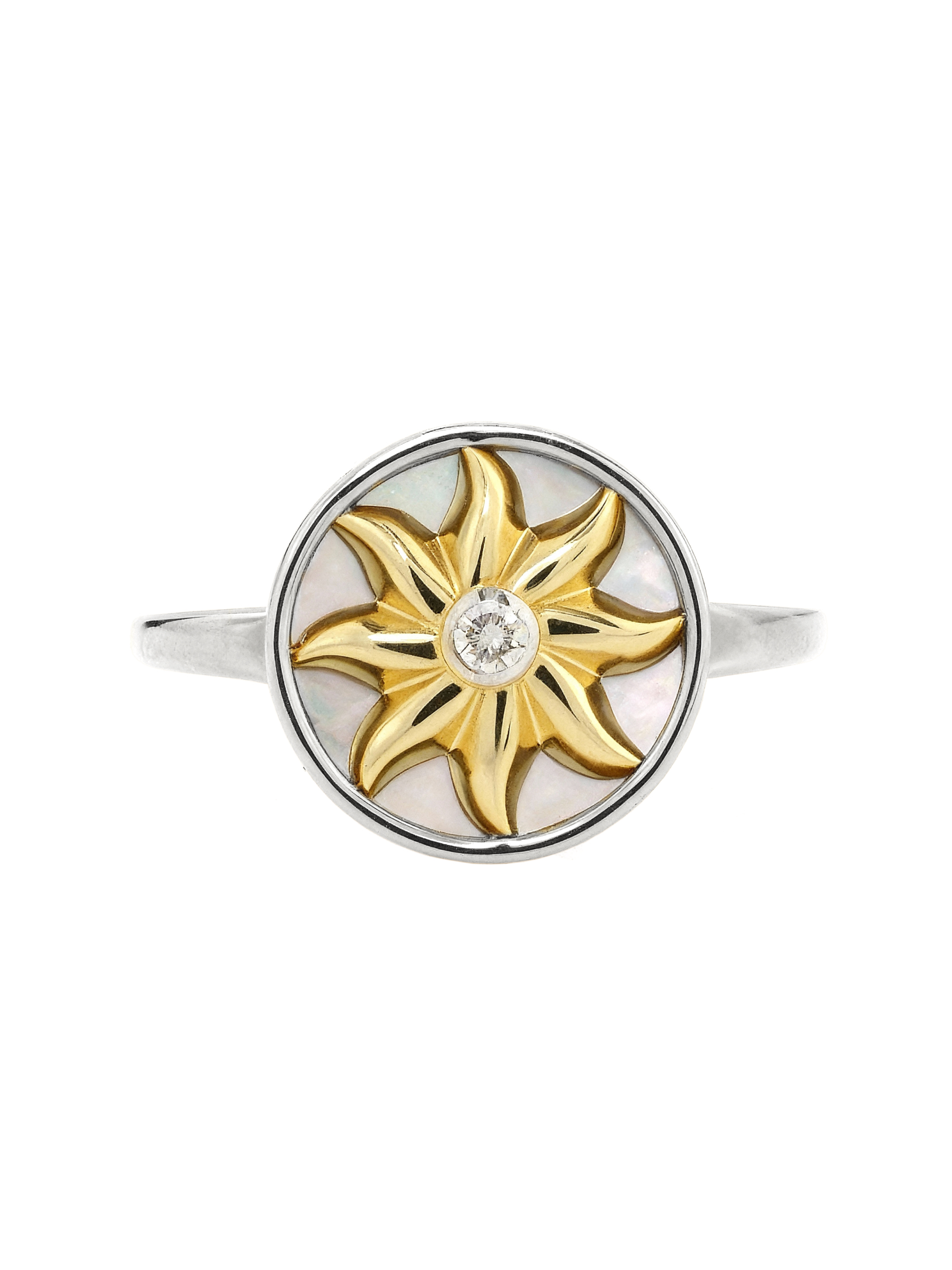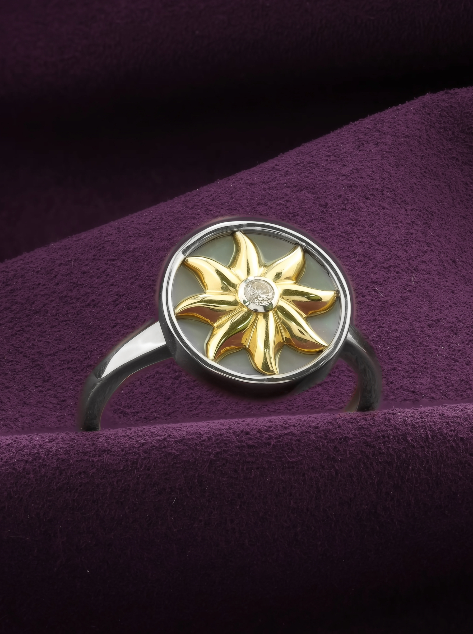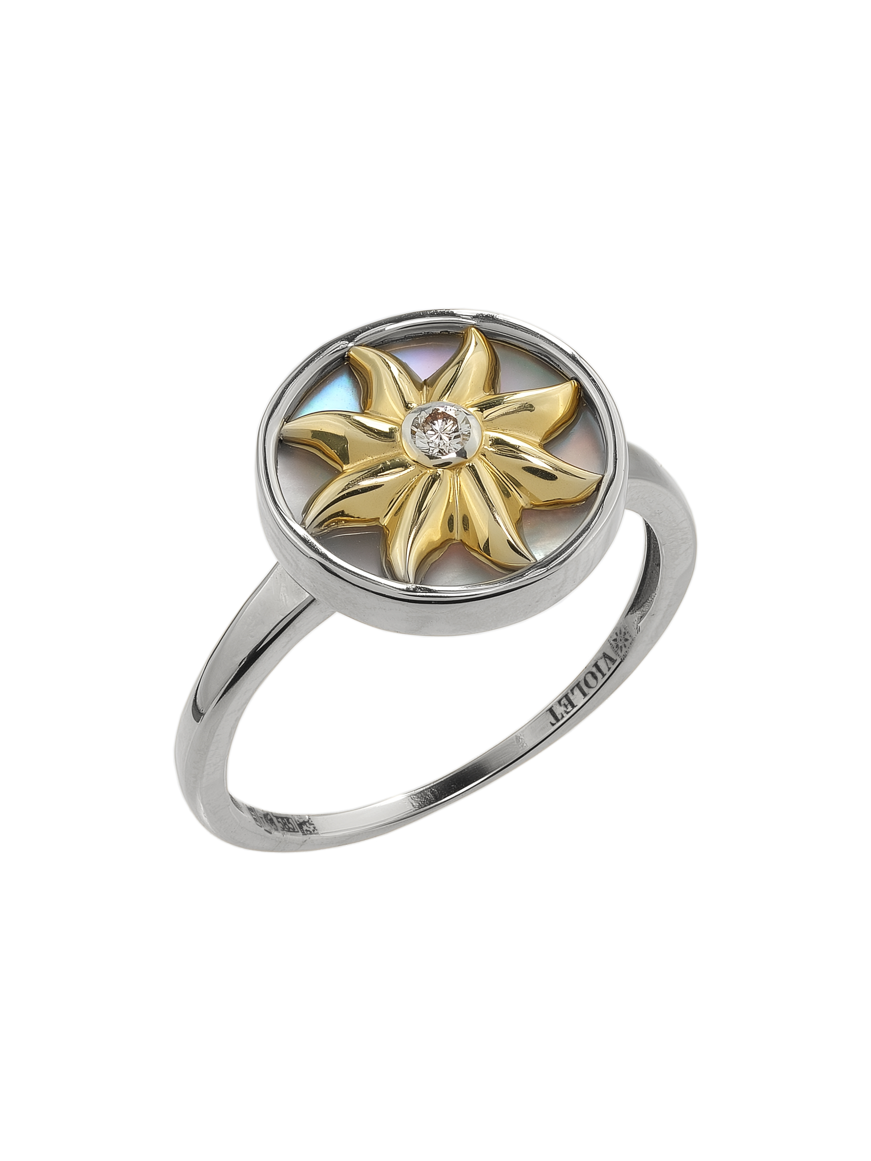 Кольцо из белого золота 585 пробы из коллекции De Luxe — Солнце и Луна — это воплощение гармонии и небесной красоты. Дизайн украшения, вдохновленный образом Солнца и Луны, притягивает взгляды своим изысканным контрастом. В центре композиции, на фоне нежного белого перламутра, распускается сияющий золотой цветок, сердцевину которого венчает безупречный бриллиант круглой огранки.