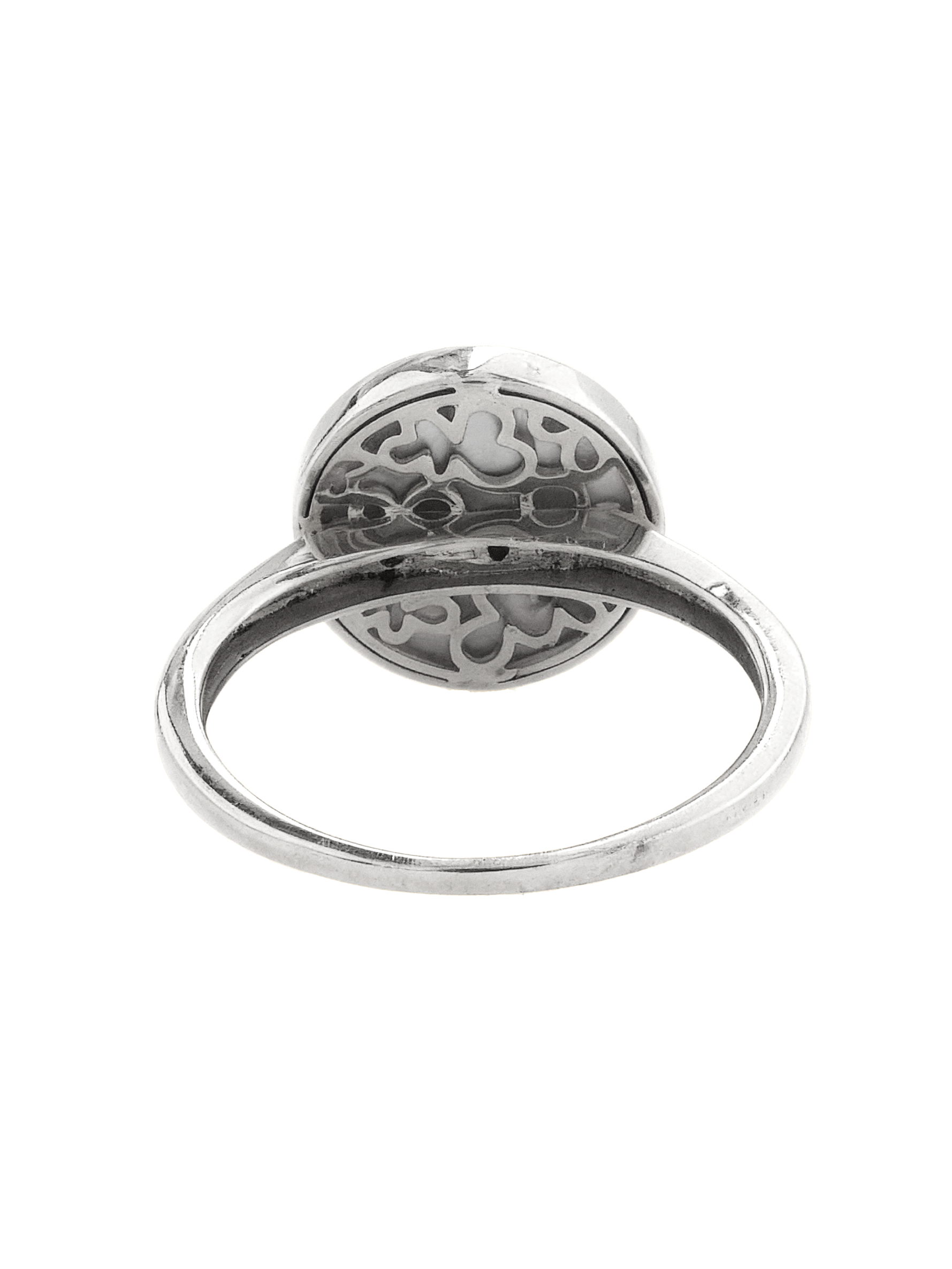 Это ювелирное изделие выполнено из качественного белого золота, которое подчеркивает холодный блеск бриллианта и мягкое переливчатое сияние перламутра. Комбинация драгоценных материалов создает эффект глубины и объема, делая кольцо идеальным аксессуаром как для женщин, так и для мужчин, которые ценят оригинальные и значимые украшения. Модель универсальна и станет отличным дополнением к повседневному образу или изысканным акцентом вечернего наряда.