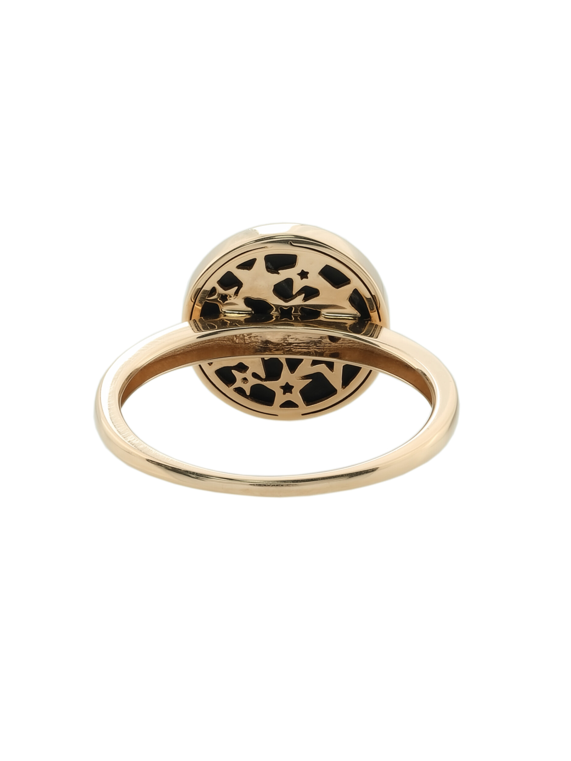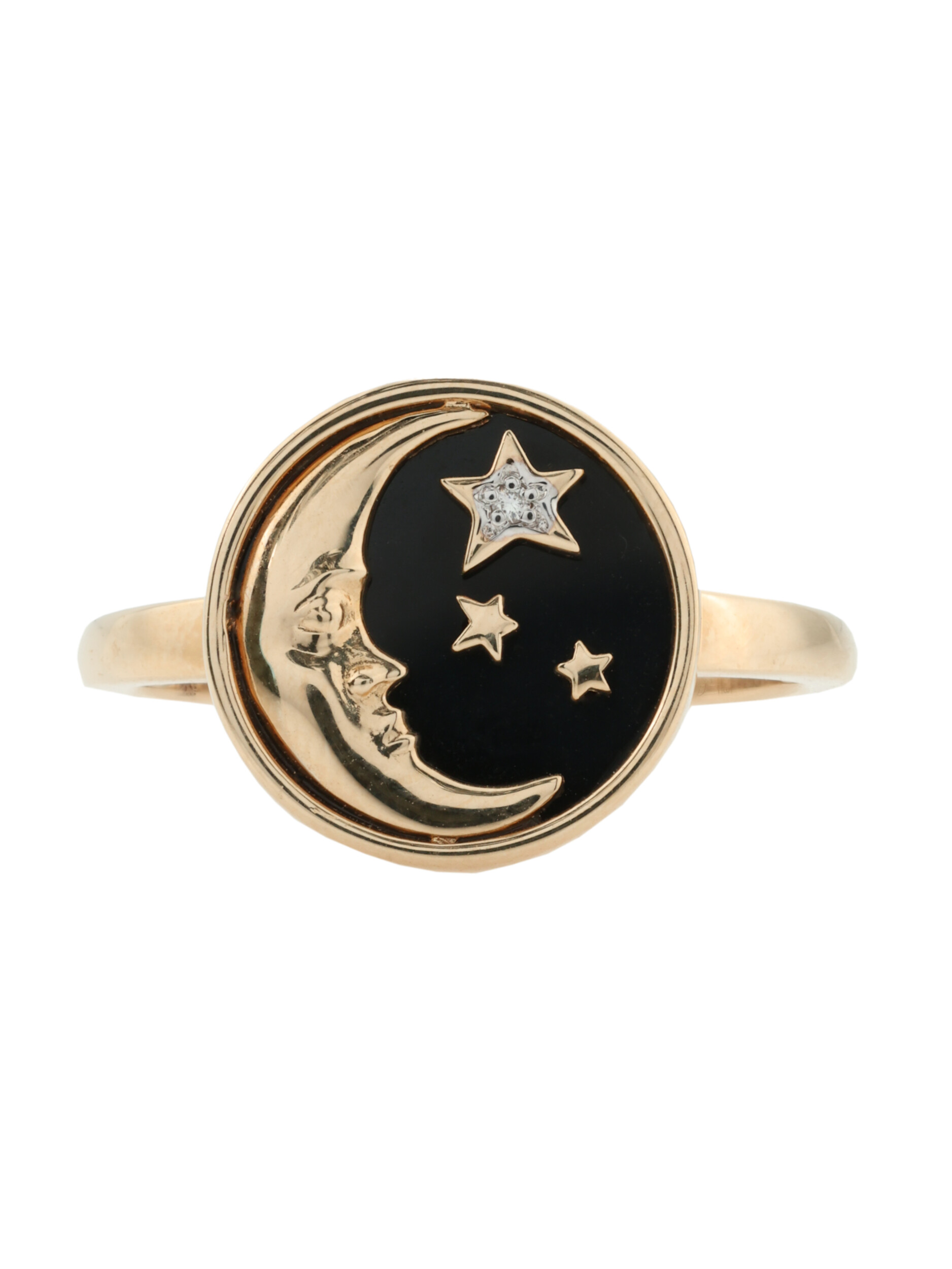 Погрузитесь в атмосферу ночного неба с кольцом из красного золота 585 пробы из коллекции De Luxe — Солнце и Луна. Это изысканное украшение объединяет в себе магию небесных светил и благородство ювелирных материалов. Центральный элемент изделия выполнен в дизайне «Солнце/Луна»: глубокий черный оникс служит идеальным фоном для золотого полумесяца и звезд, создавая контрастное сочетание, которое мгновенно притягивает взгляд.