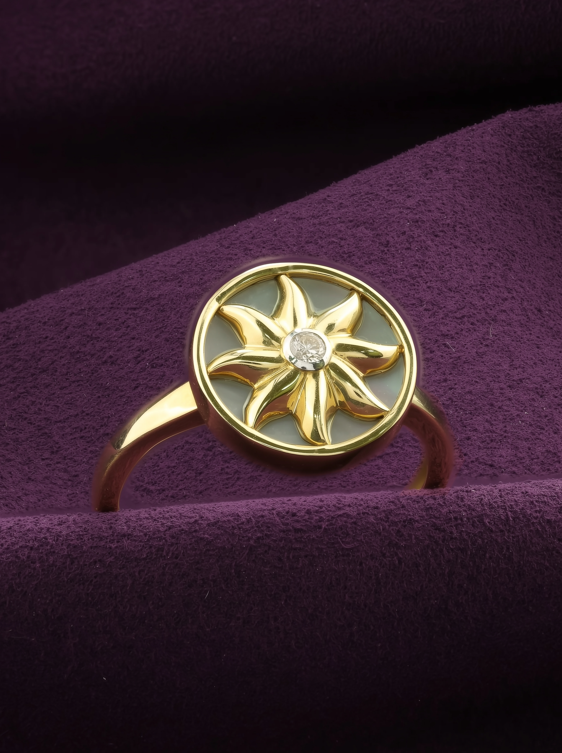 Элегантное кольцо из лимонного золота 585 пробы станет утонченным дополнением вашего образа, подчеркивая индивидуальность и безупречный вкус. Ювелирное изделие выполнено в оригинальном дизайне Солнце/Луна, который притягивает взгляд и завораживает своей гармоничностью. В центре композиции расположена круглая вставка из перламутра с мягким переливом, на фоне которой эффектно выделяется яркий акцент — чистый, сверкающий бриллиант круглой огранки. Сочетание теплого оттенка лимонного золота с нежностью перламутра и блеском драгоценного камня создает выразительный контраст, делая это украшение по-настоящему особенным.