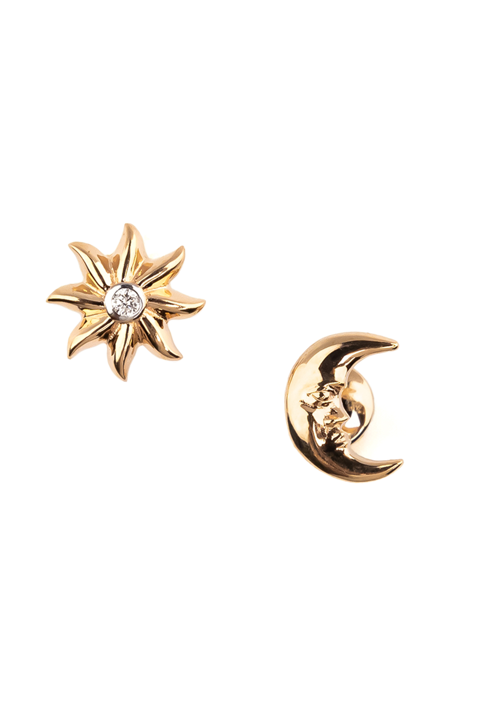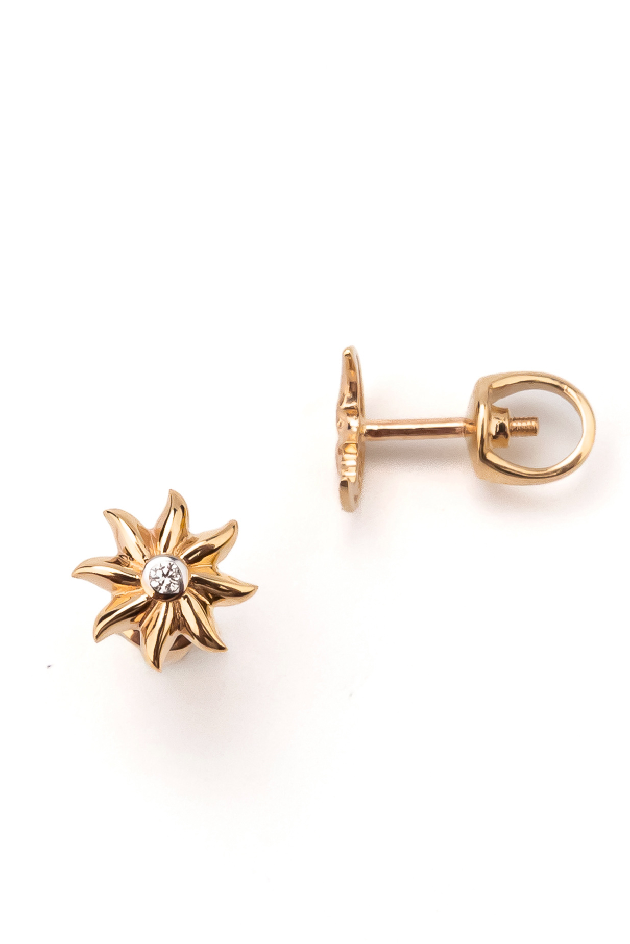 Серьги выполнены из высококачественного красного золота 585 пробы. Глубокий, теплый оттенок драгоценного металла гармонично сочетается с искусной гравировкой, передающей детали образов солнца и луны. Центр солнечного элемента украшен изысканным бриллиантом белого цвета круглой формы огранки, который придает изделию благородное сияние и особый шарм. Лаконичная инкрустация одной вставкой фокусирует внимание на качестве исполнения и чистоте камня.
