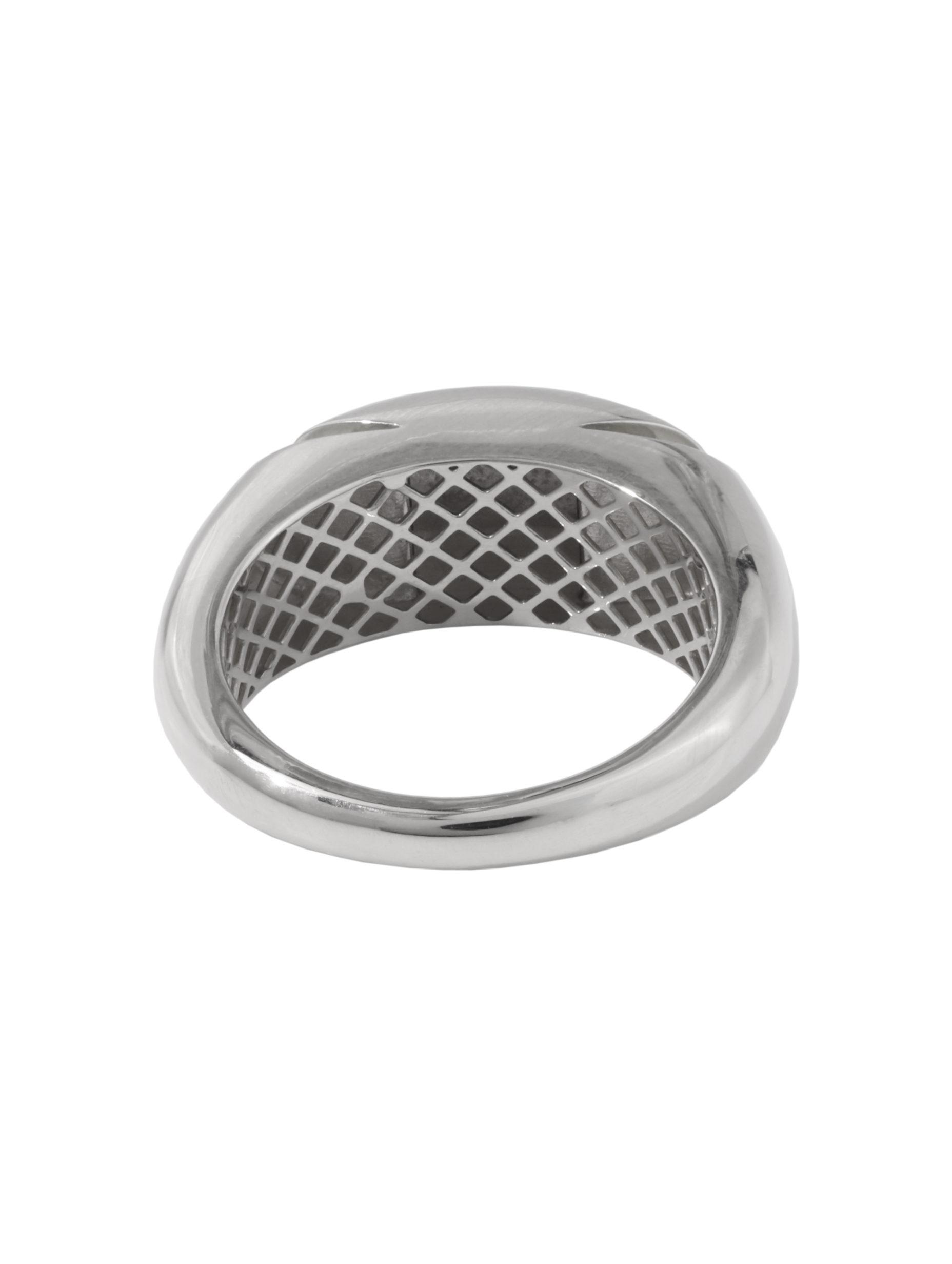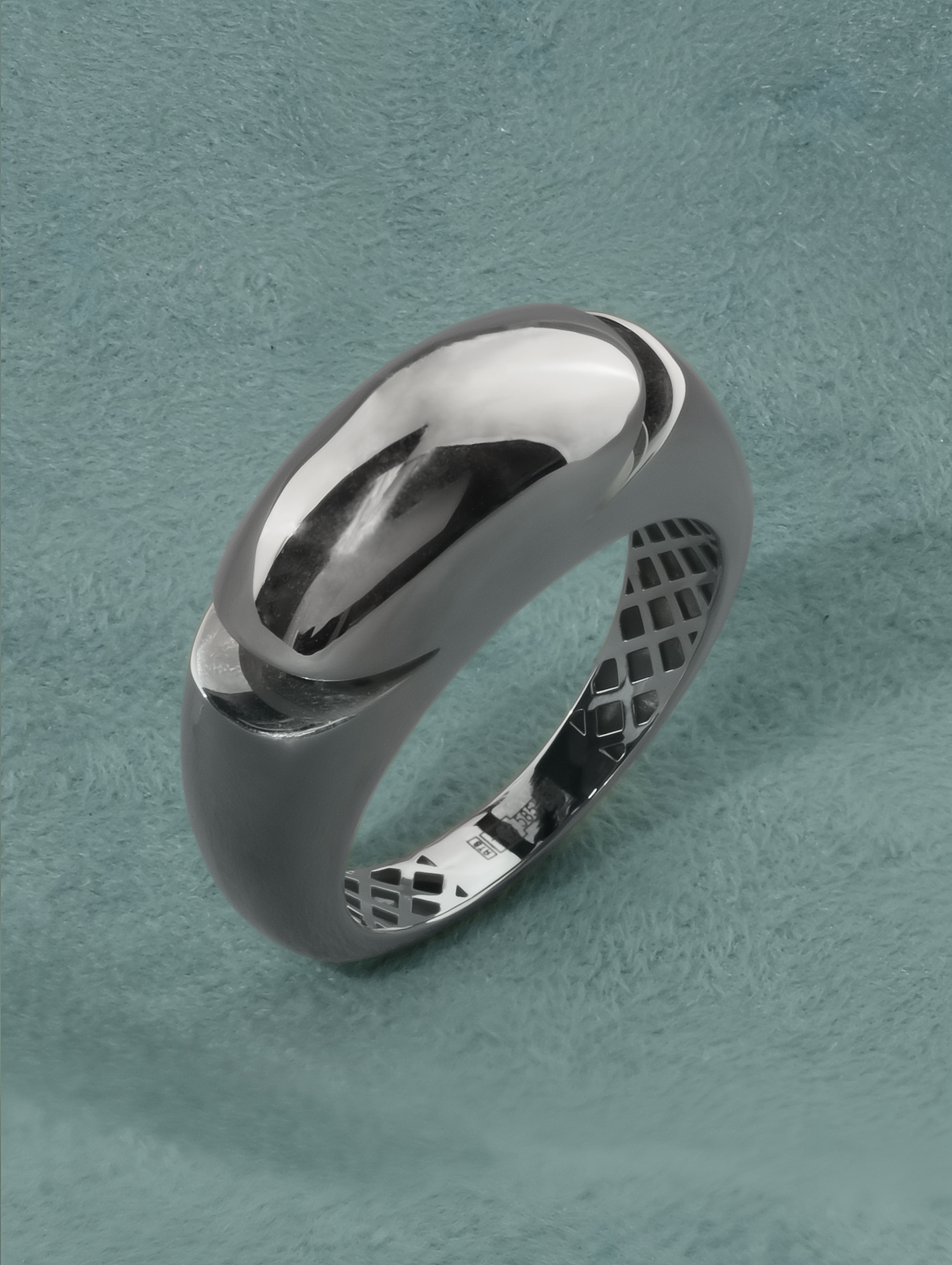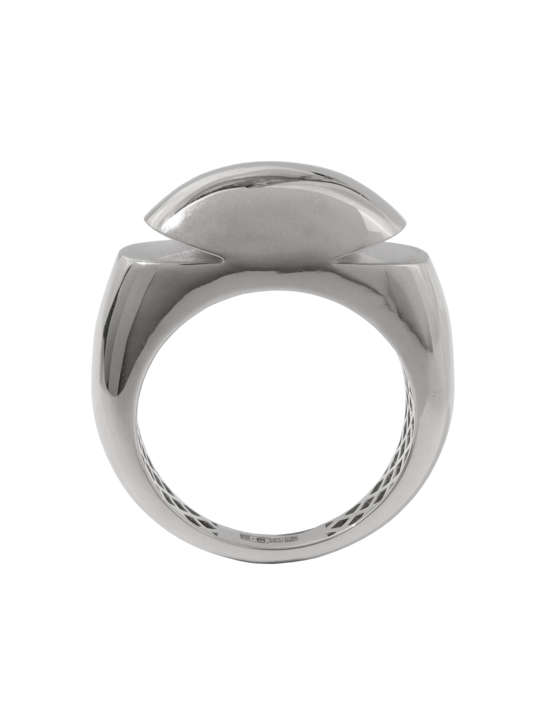 Кольцо отличается универсальностью дизайна: оно идеально подходит как для женщин, так и для мужчин, подчеркивая статус и индивидуальность своего владельца. Особая геометрия формы делает изделие заметным акцентом в любом образе, будь то деловой костюм или вечерний наряд. Сложная фактура внутренней части шинки подчеркивает мастерство исполнения.