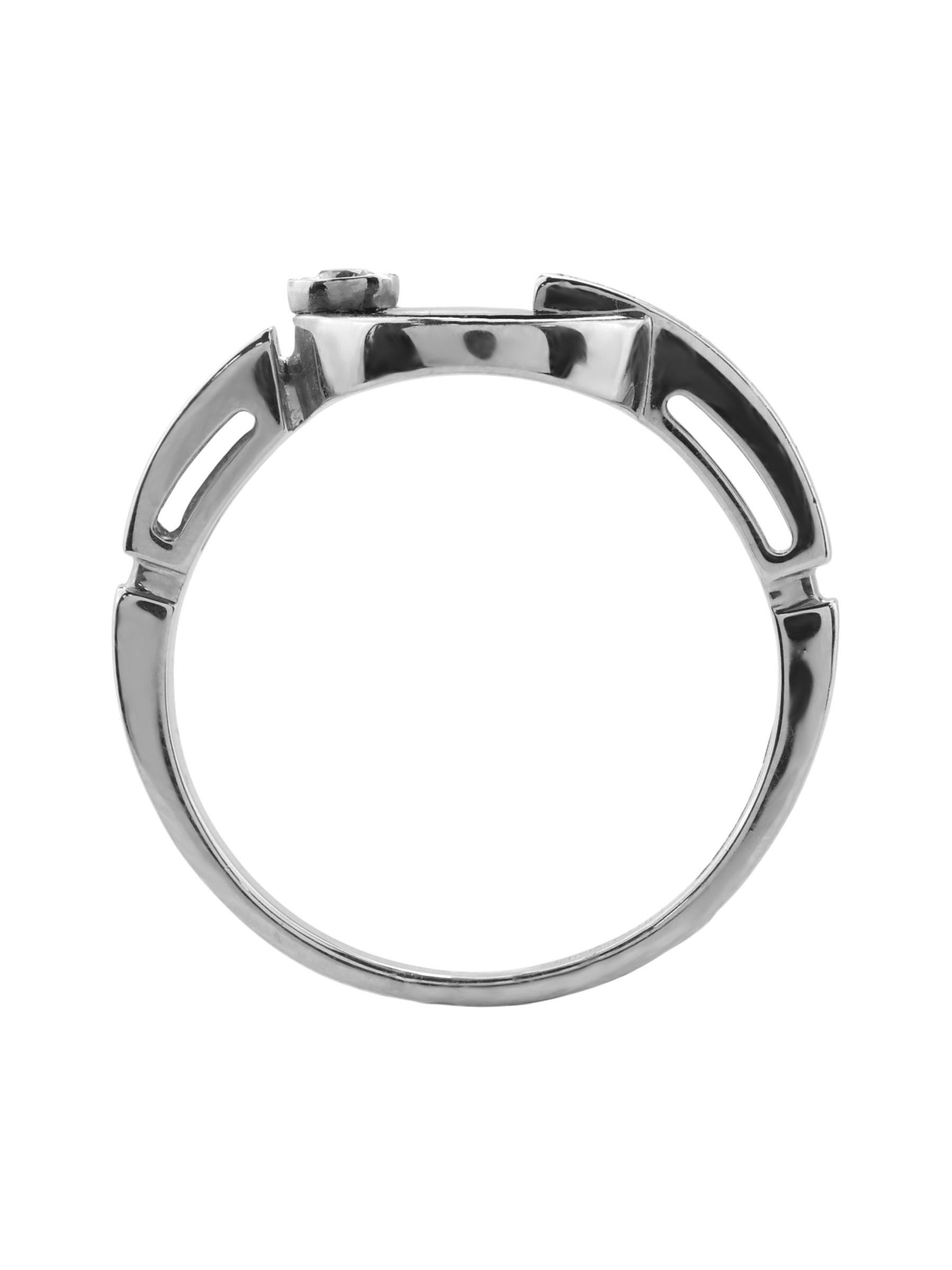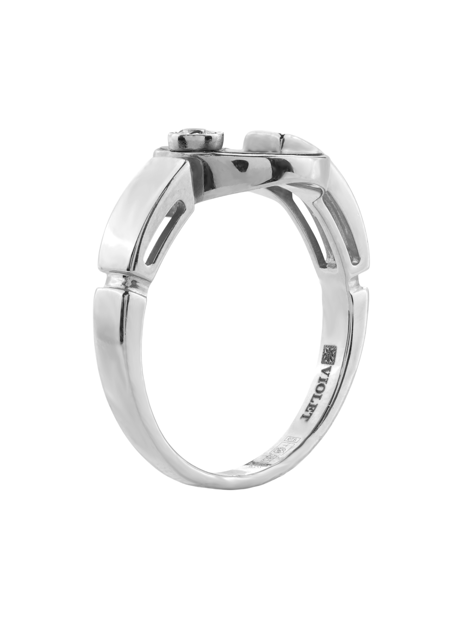 Центральную композицию дополняют 3 вставки: сверкающий бриллиант круглой формы выступает главным акцентом, подчеркивая статусность украшения. Это стильное кольцо подходит как для женщин, так и для мужчин, благодаря своему универсальному и лаконичному исполнению. Гладкие линии и качественная обработка делают его комфортным для повседневного ношения.