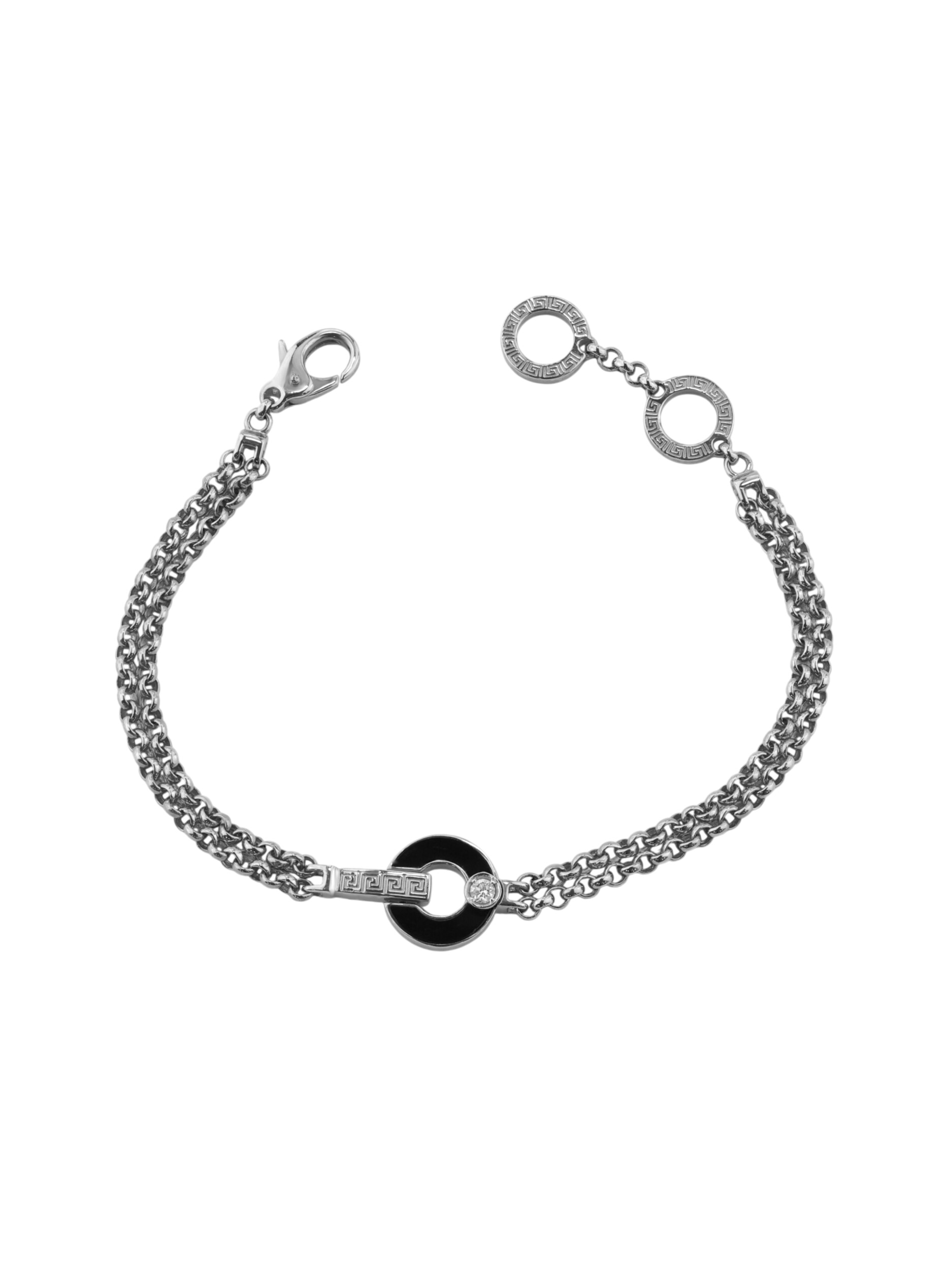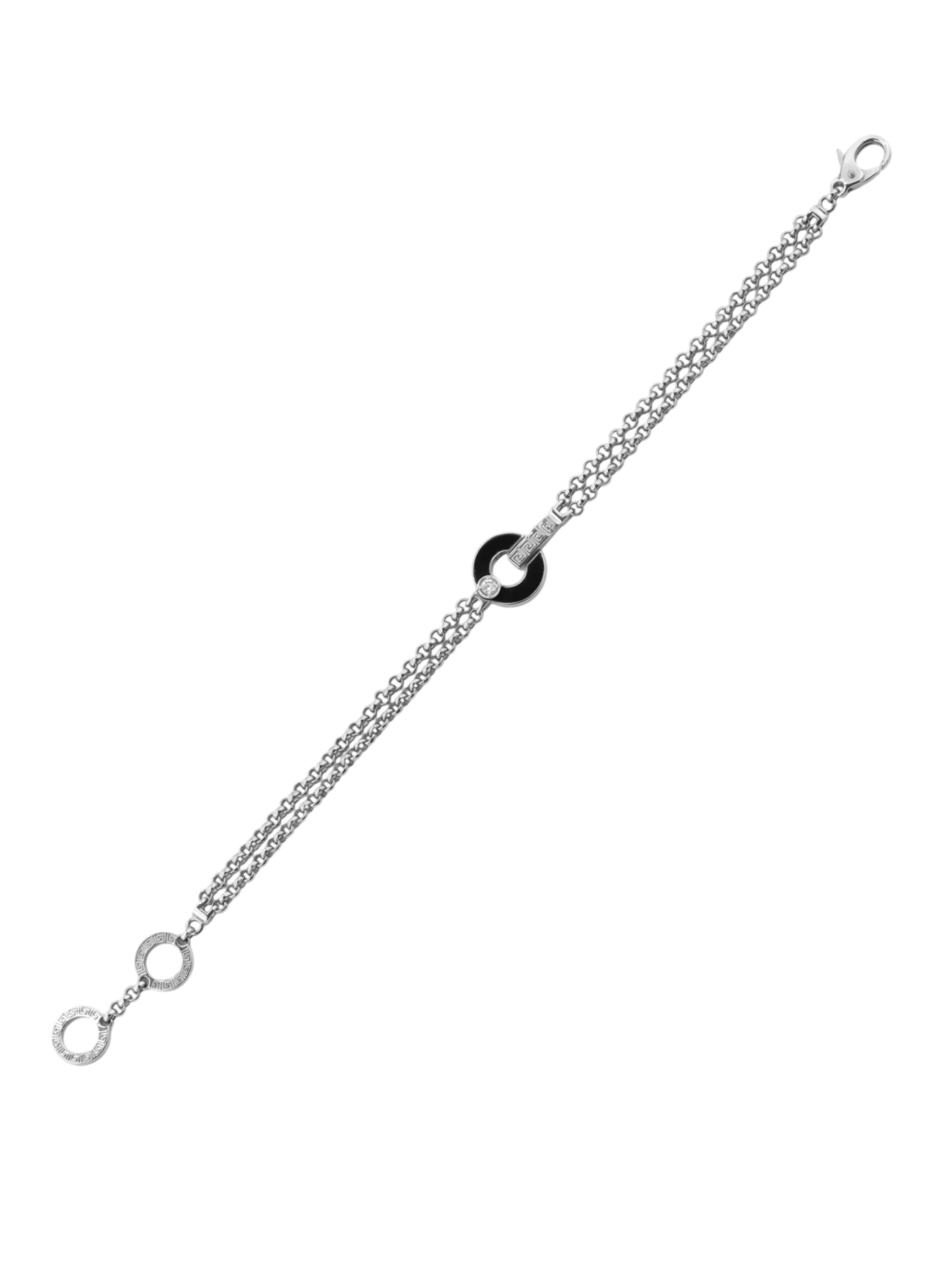 Данная модель состоит из трех вставок, гармонично объединенных в единый дизайнерский ансамбль. Двойная цепочка браслета обеспечивает комфортную посадку и надежность, делая его идеальным аксессуаром для повседневного ношения или особого случая. Изделие может стать частью комплекта, позволяя создавать целостные и выразительные образы. Этот браслет — выбор тех, кто предпочитает сдержанную роскошь и высокое качество исполнения.