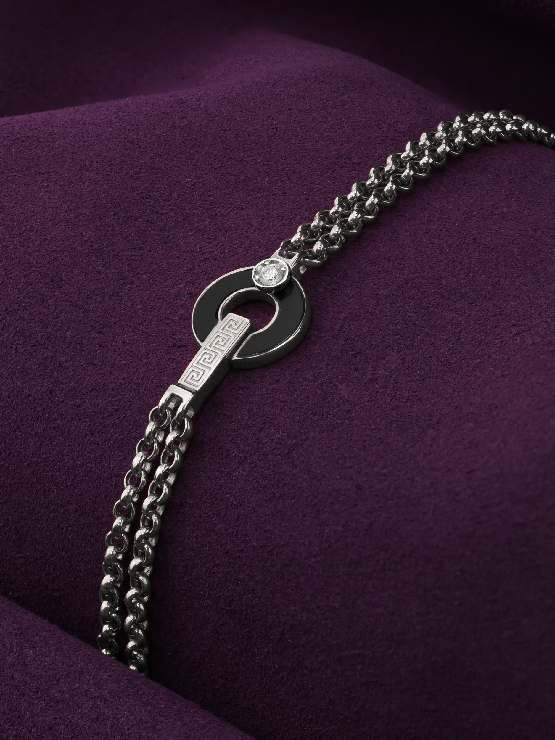 Центральным элементом композиции является искусное сочетание оникса и бриллианта. Глубокий черный цвет оникса, ограненного в форме полукольца, эффектно контрастирует с холодным блеском белого золота. Завершает композицию изысканный круглый бриллиант, добавляющий украшению благородное сияние. Геометрический орнамент, выполненный в стиле греческий ключ, придает браслету особый символизм и динамику, превращая его в завершенное произведение ювелирного искусства.