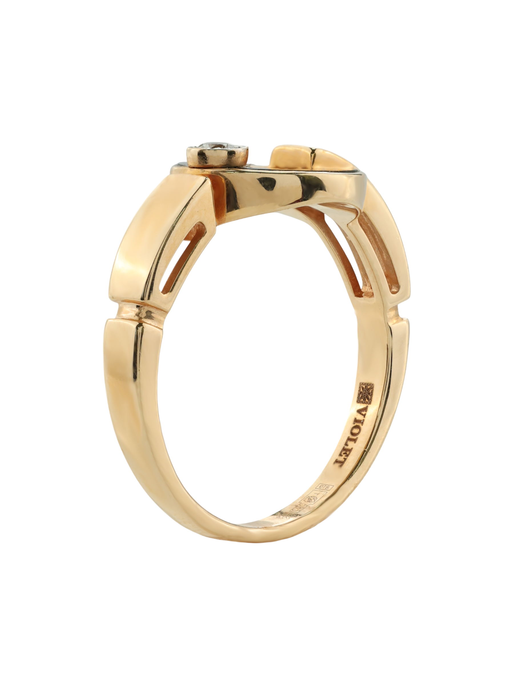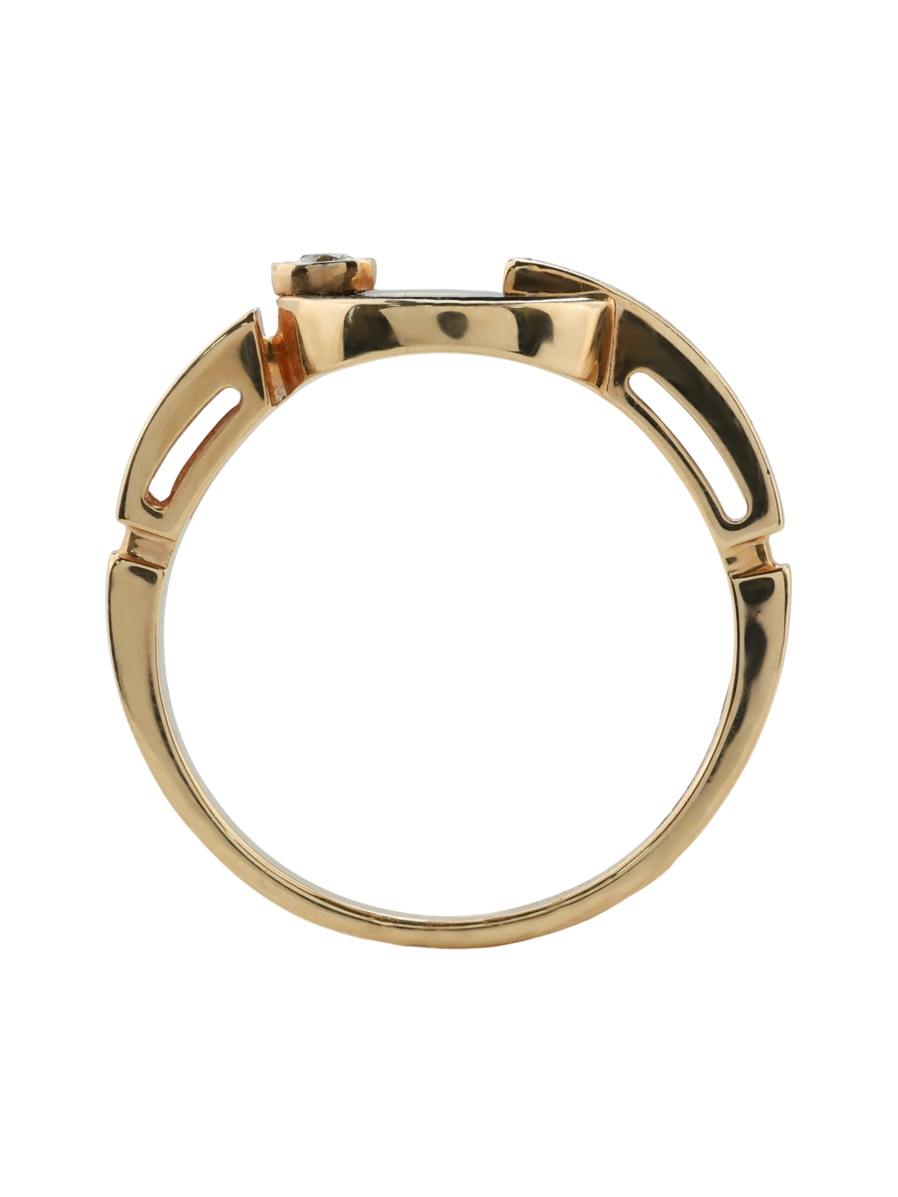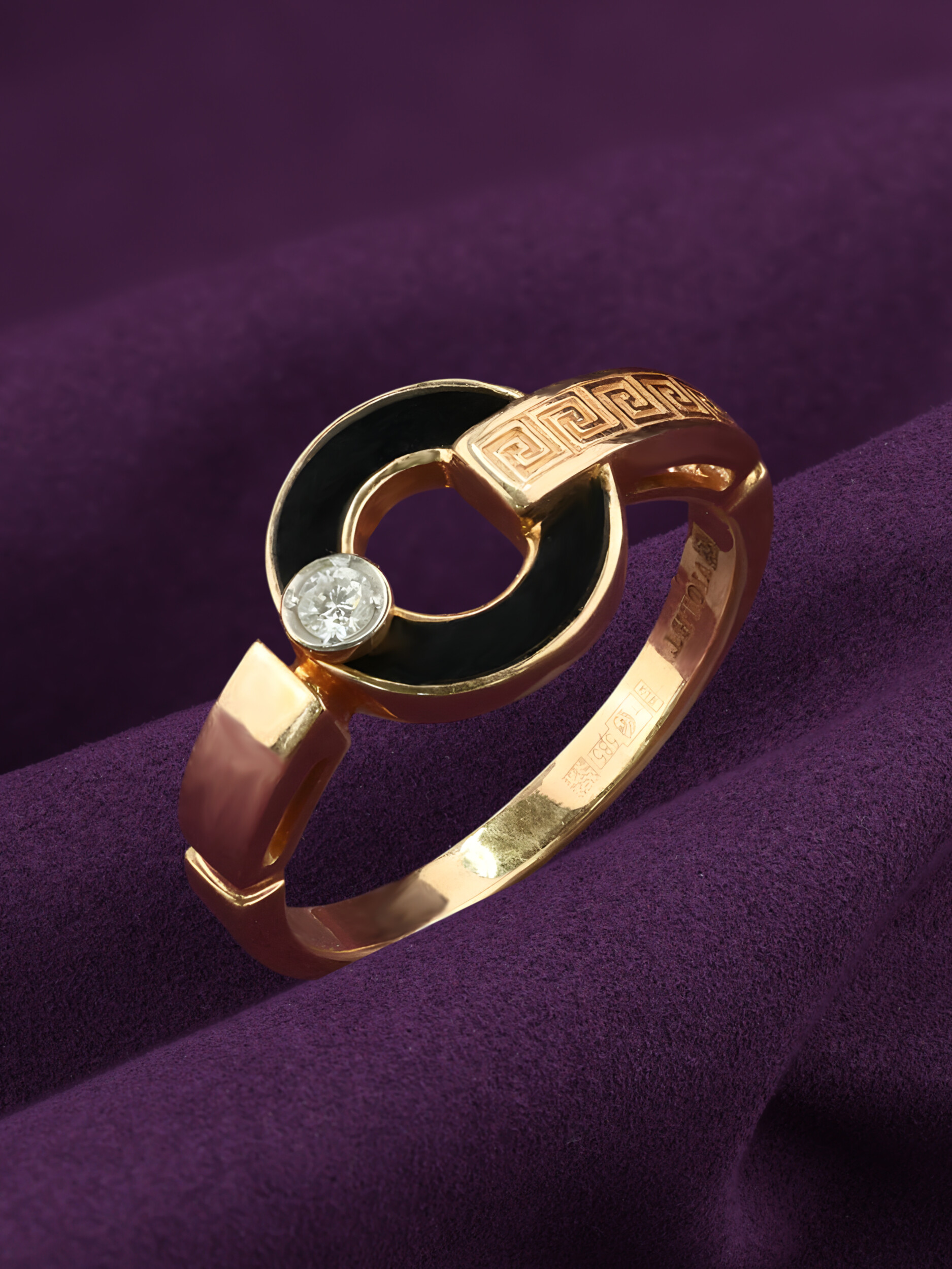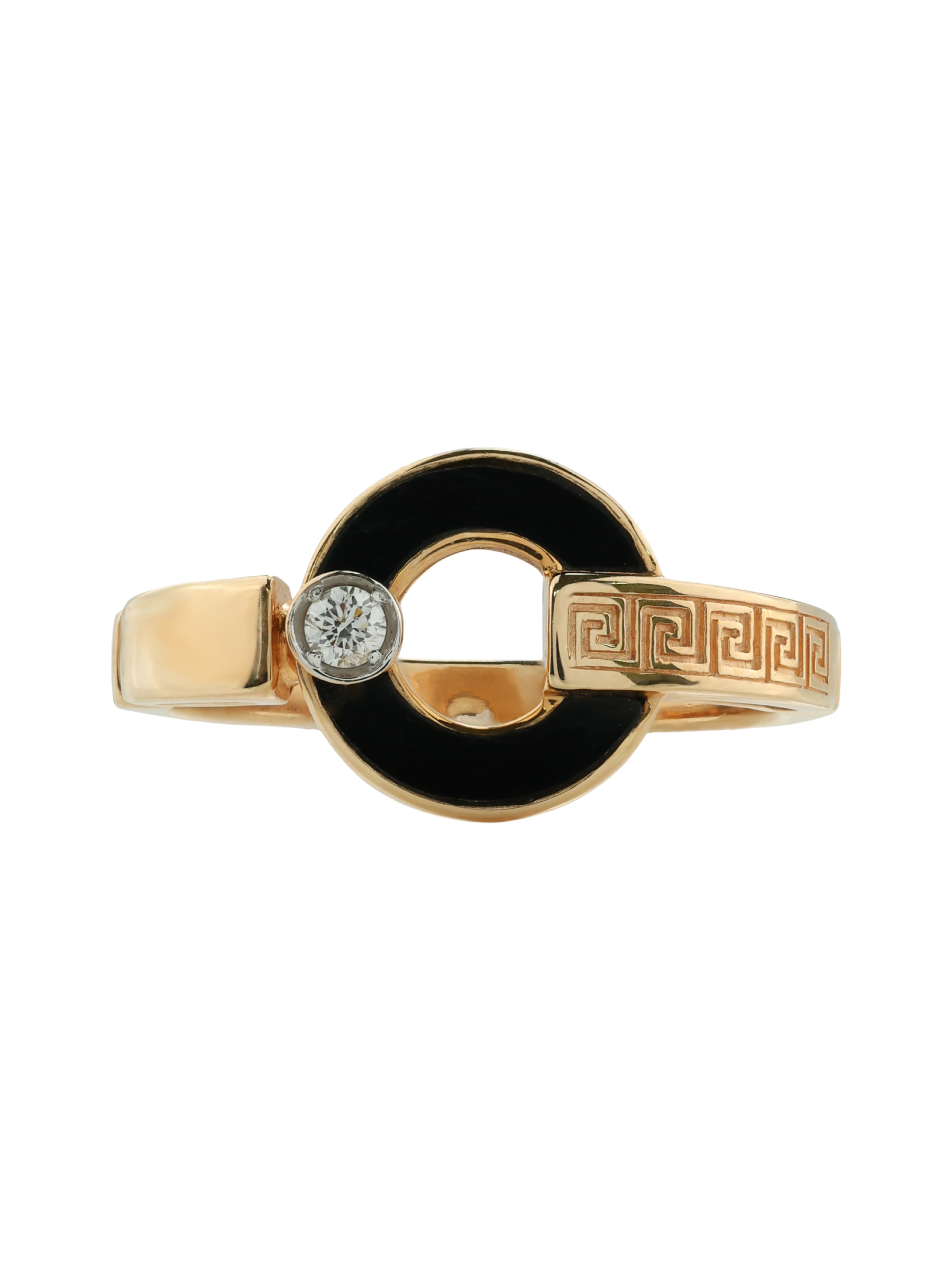 Особую роскошь модели придает акцентный бриллиант круглой огранки. Белый блеск драгоценного камня гармонично контрастирует с темным ониксом, создавая эффектный визуальный объем. Оригинальный дизайн дополнен изящным орнаментом в виде греческого ключа, который придает кольцу особый статус и геометрическую четкость. Лаконичные формы и мастерское исполнение делают это украшение универсальным выбором для женщин и мужчин, ценящих статусную ювелирную классику.