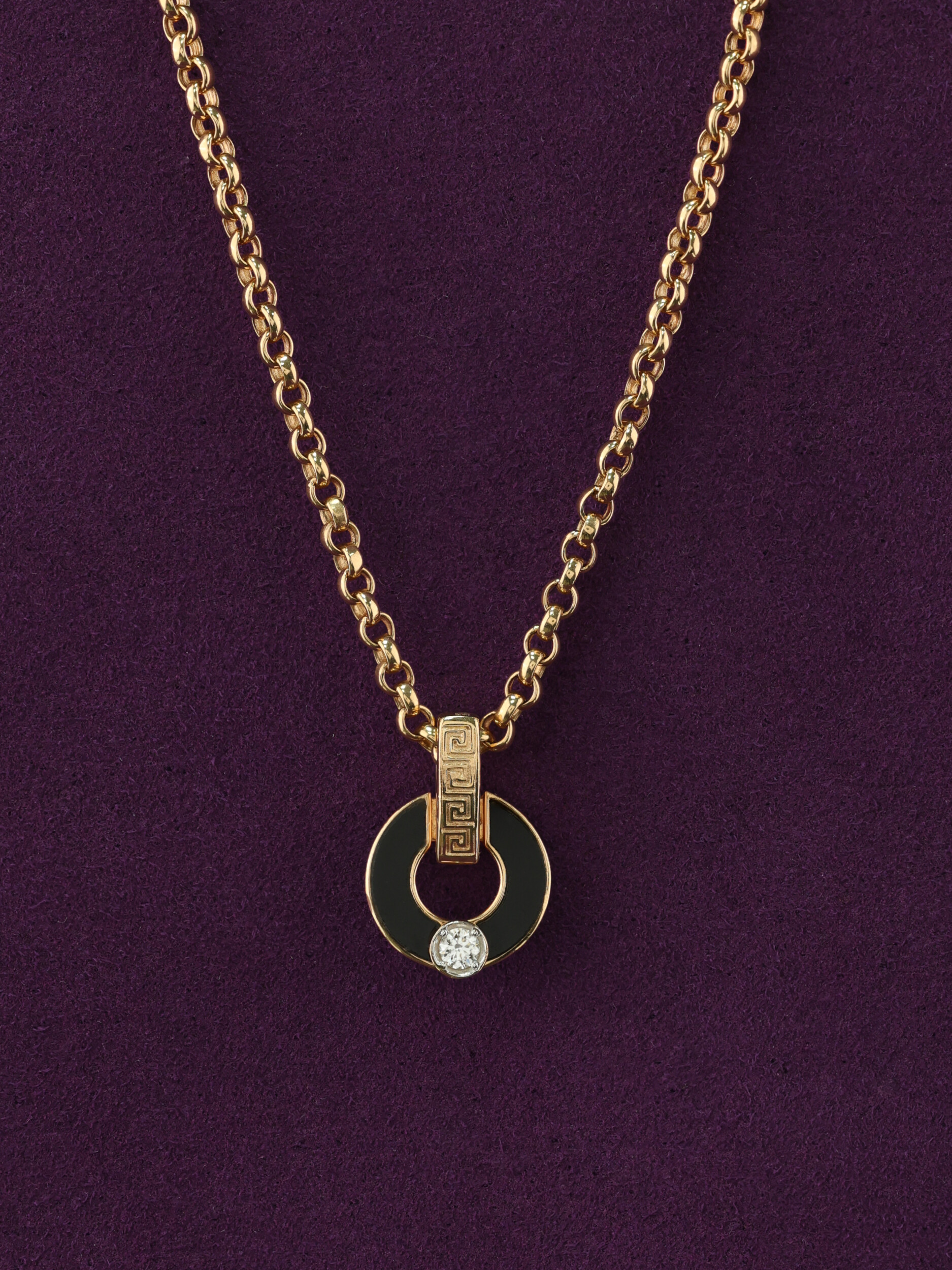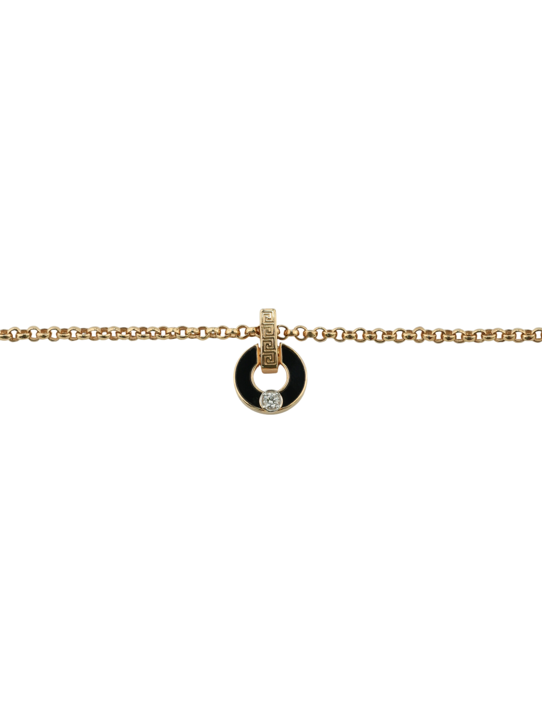 Центральный элемент изделия выполнен в виде изящного полумесяца, который в сочетании с ониксом создает выразительный контраст. Особое внимание привлекает детальная проработка дизайна: декоративный элемент украшен узнаваемым орнаментом «греческий ключ», который придает колье нотки античного величия. Инкрустация из 3 вставок, включая сверкающий бриллиант круглой огранки, делает украшение по-настоящему роскошным.