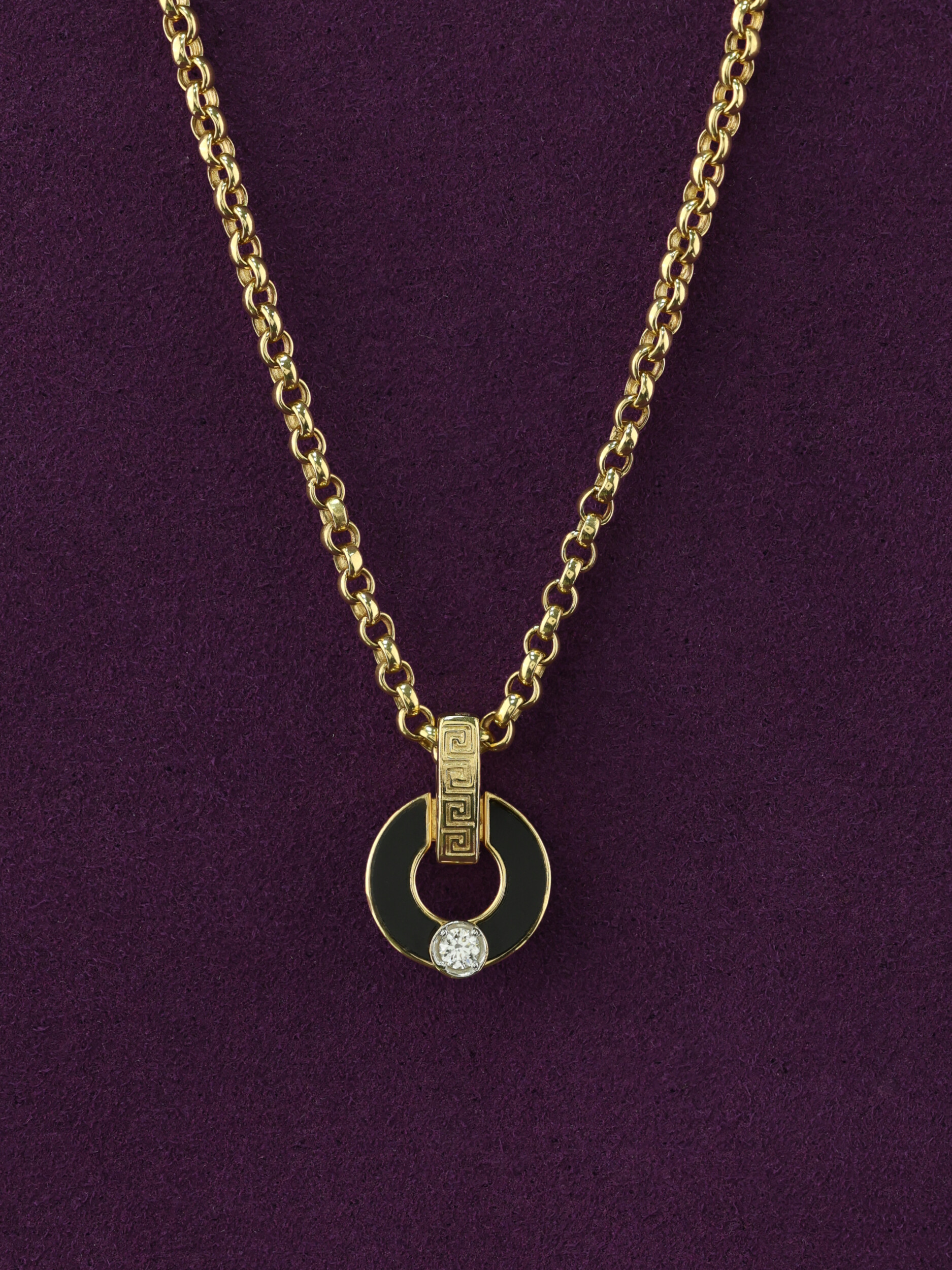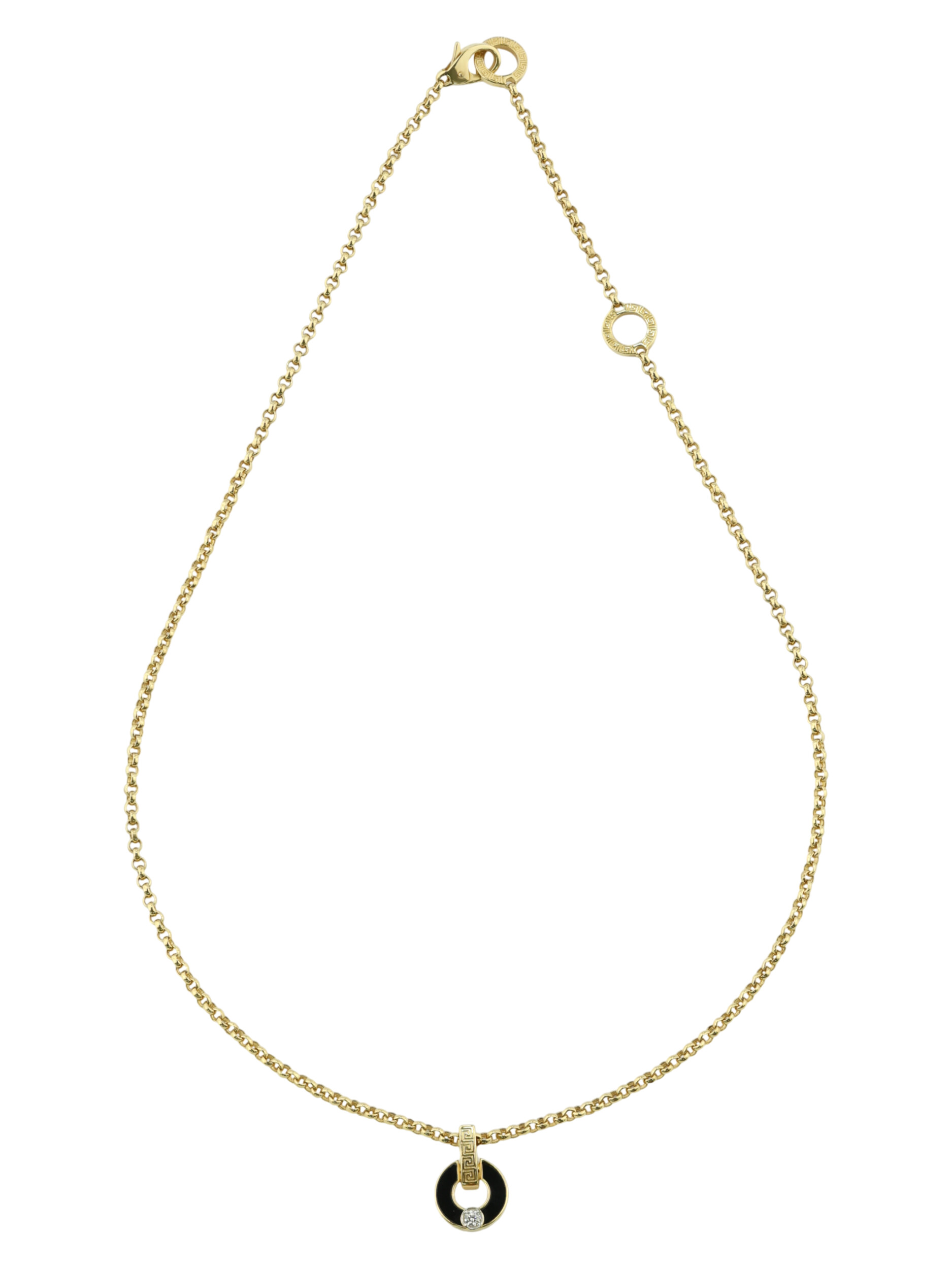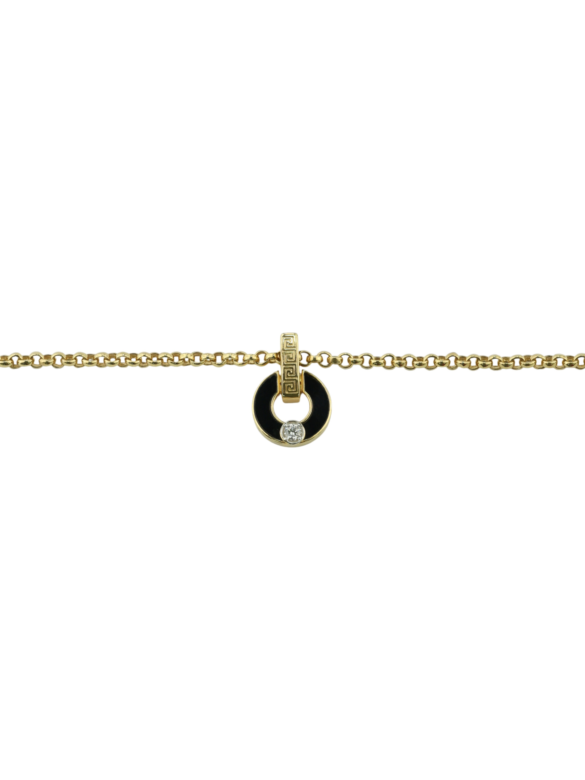 Колье из лимонного золота с ониксом и бриллиантом — это выбор тех, кто ценит детали и высокое качество ювелирного мастерства. Изделие станет отличным дополнением к вашему образу, а также может быть частью комплекта, создавая целостный и запоминающийся ювелирный ансамбль. Приобретая это украшение, вы делаете инвестицию в собственный стиль, который не подвластен времени.