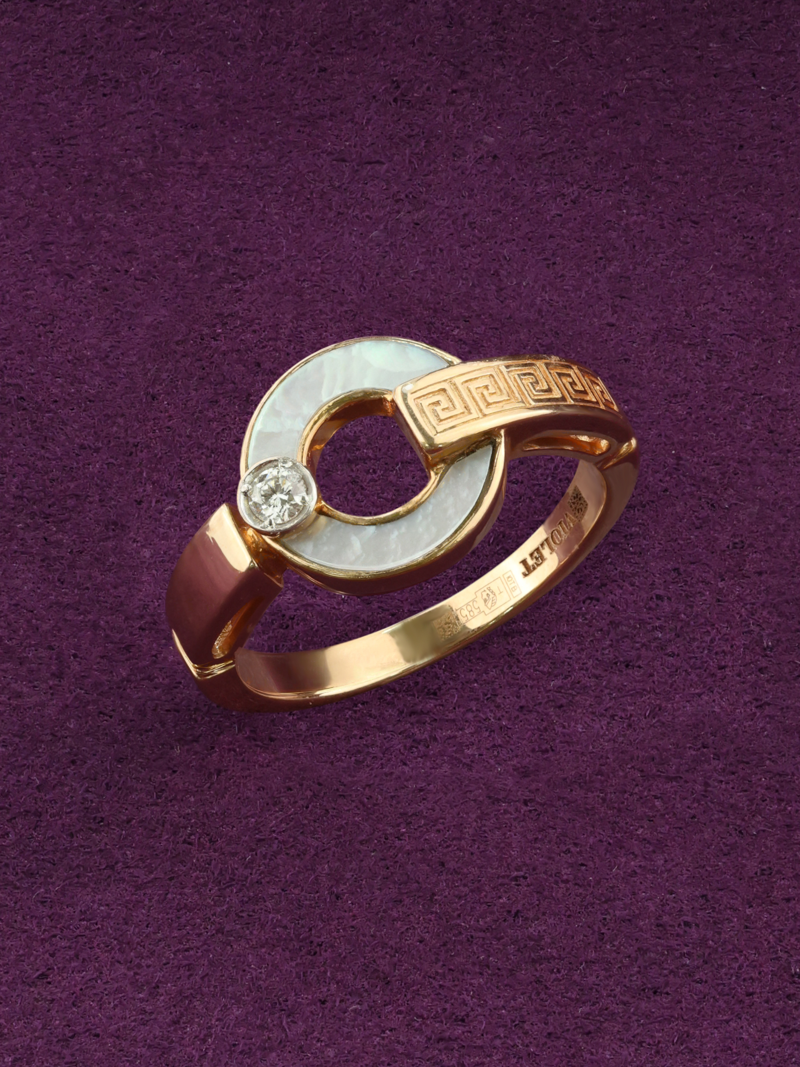 Элегантное кольцо из коллекции De Luxe — Афина — это воплощение изысканности и античной эстетики. Изделие выполнено из красного золота 585 пробы, которое мягко сияет и подчеркивает благородство дизайна. Центральным элементом украшения выступает вставка из перламутра в форме полукольца, обладающая завораживающим переливом белого цвета, которая гармонично сочетается с драгоценным блеском круглого бриллианта.