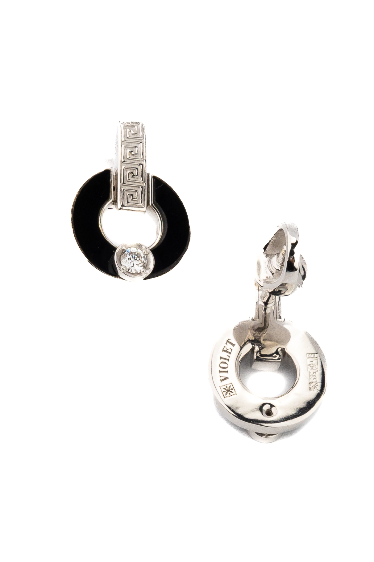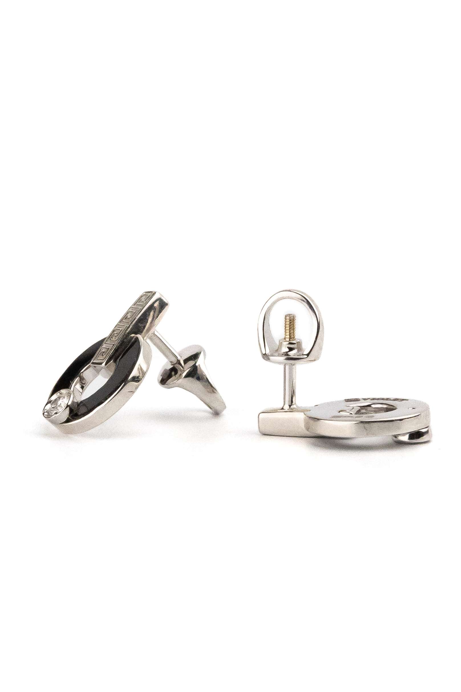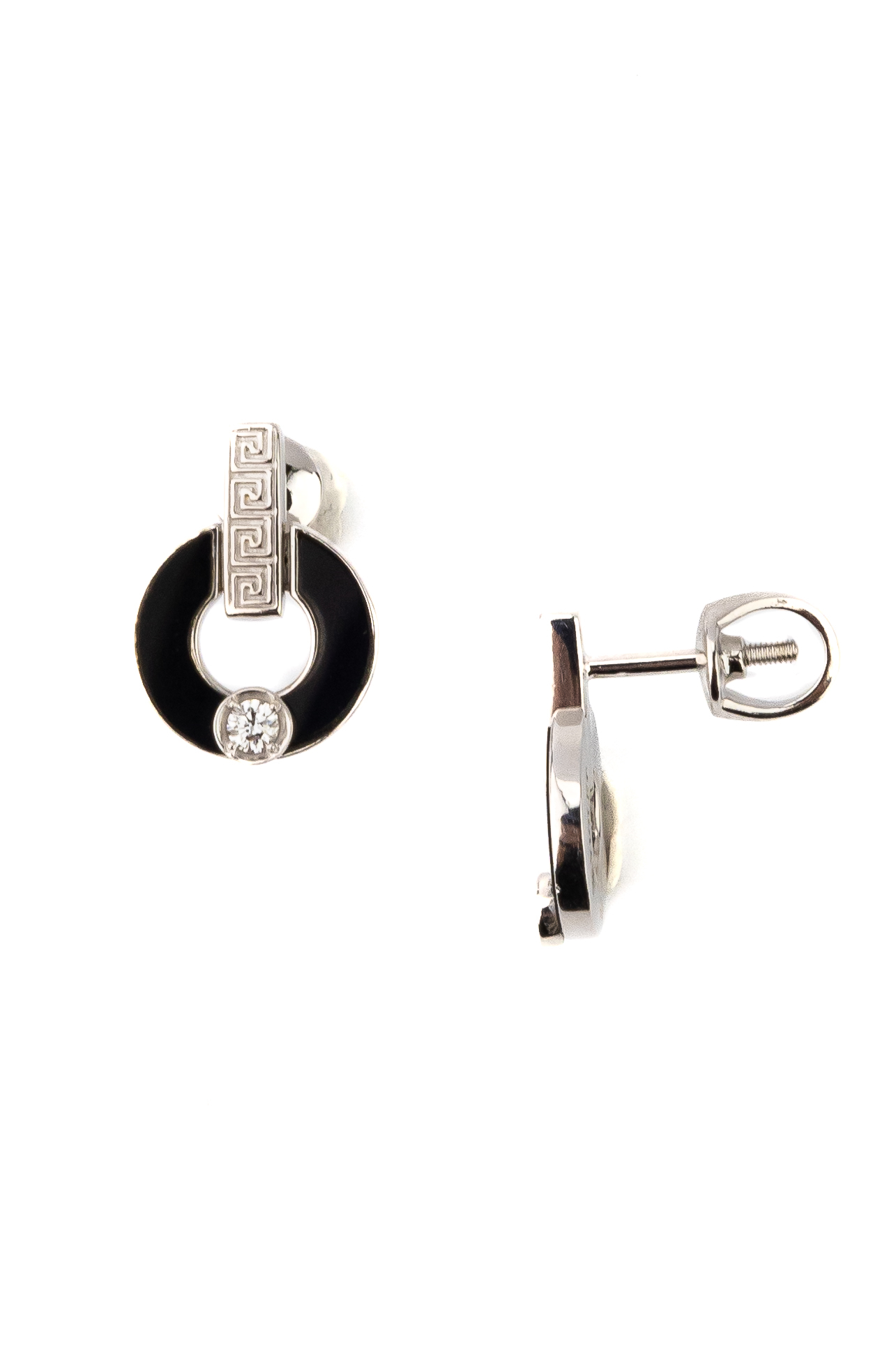 Элегантные серьги из белого золота 585 пробы из коллекции De Luxe — Афина станут воплощением утонченного вкуса и строгого стиля. Дизайн изделия объединяет в себе античные мотивы и современную геометрию: в оформлении четко прослеживается орнамент греческий ключ, который гармонично дополняет лаконичный элемент в форме полумесяца. Контрастное сочетание холодного блеска белого золота с глубоким черным цветом оникса делает эти серьги заметным аксессуаром, который подойдет как для женщин, так и для мужчин, предпочитающих статусные украшения.